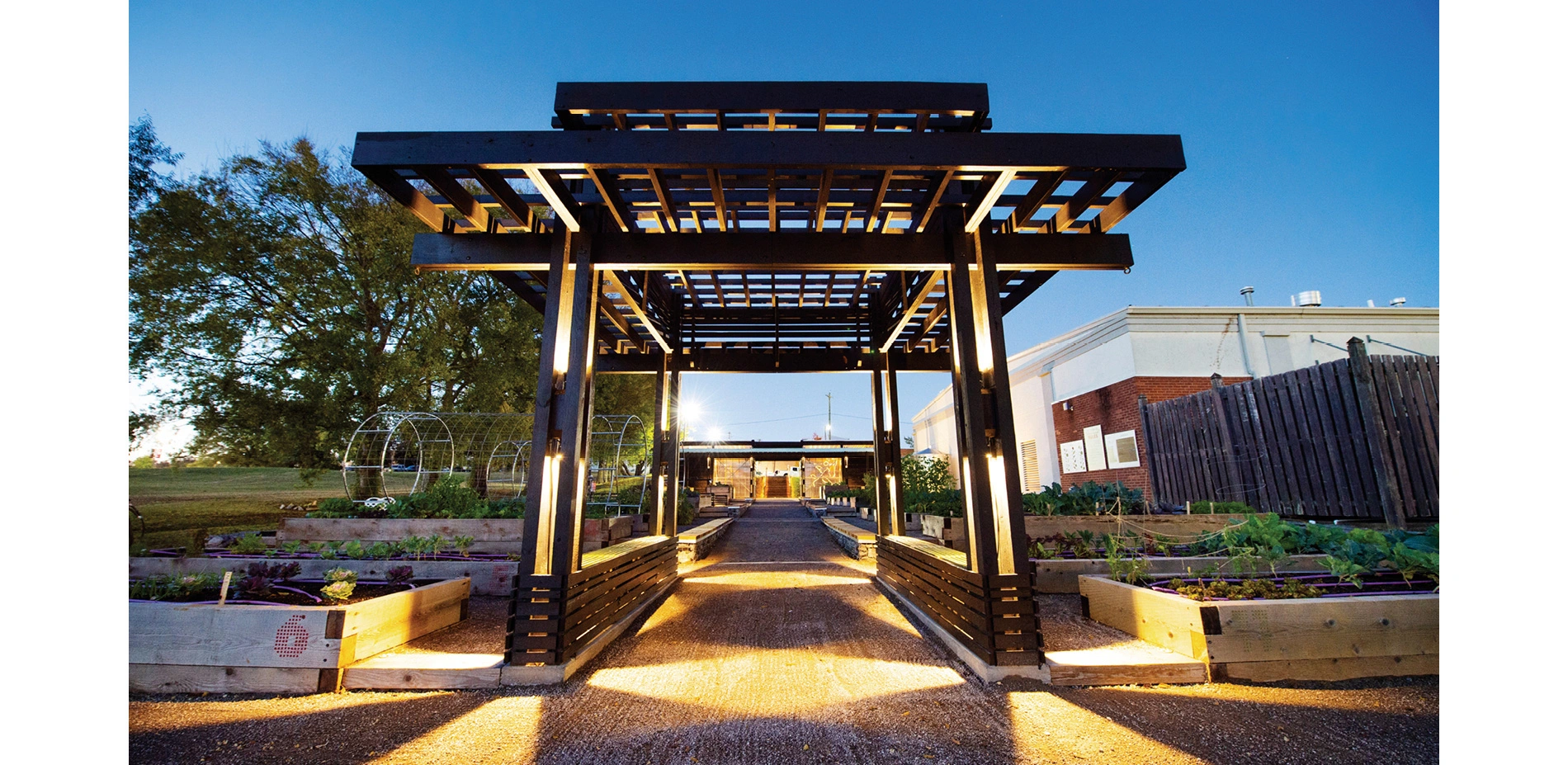 Gateway Arbor: The gateway arbor was built as a companion element to the storage sheds. The arbor provides seating and allows adjacent beds to grow vining crops up to its trellis.