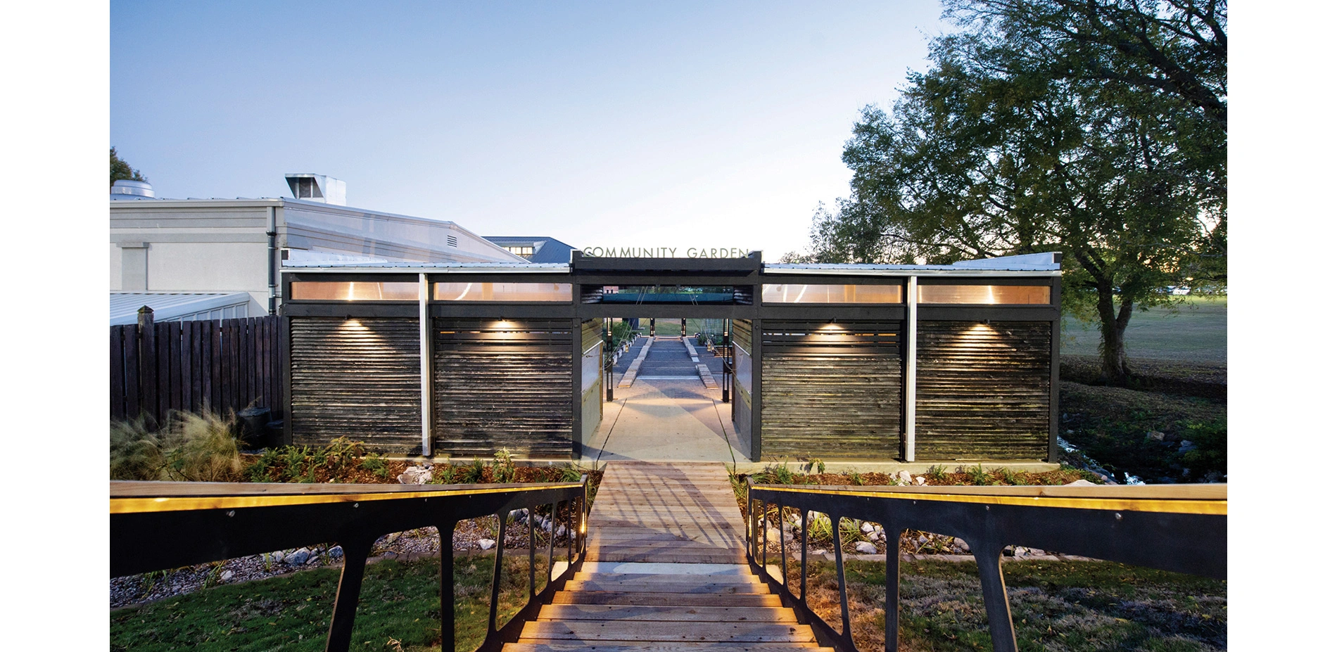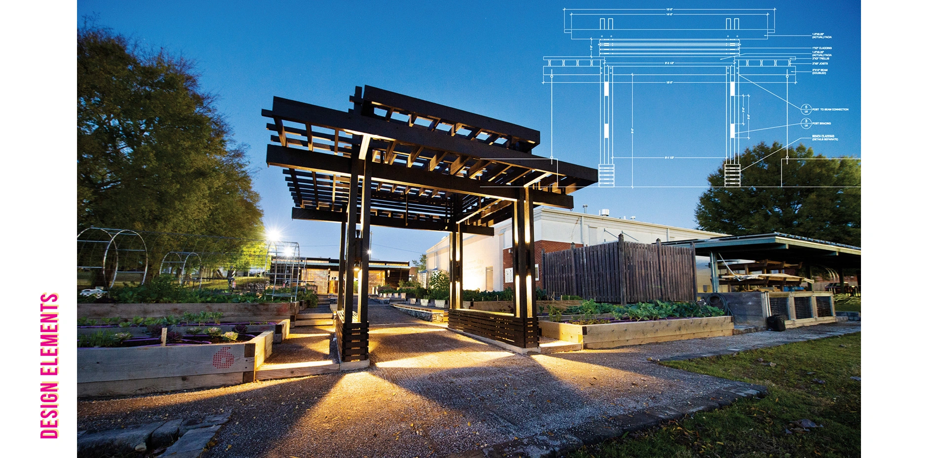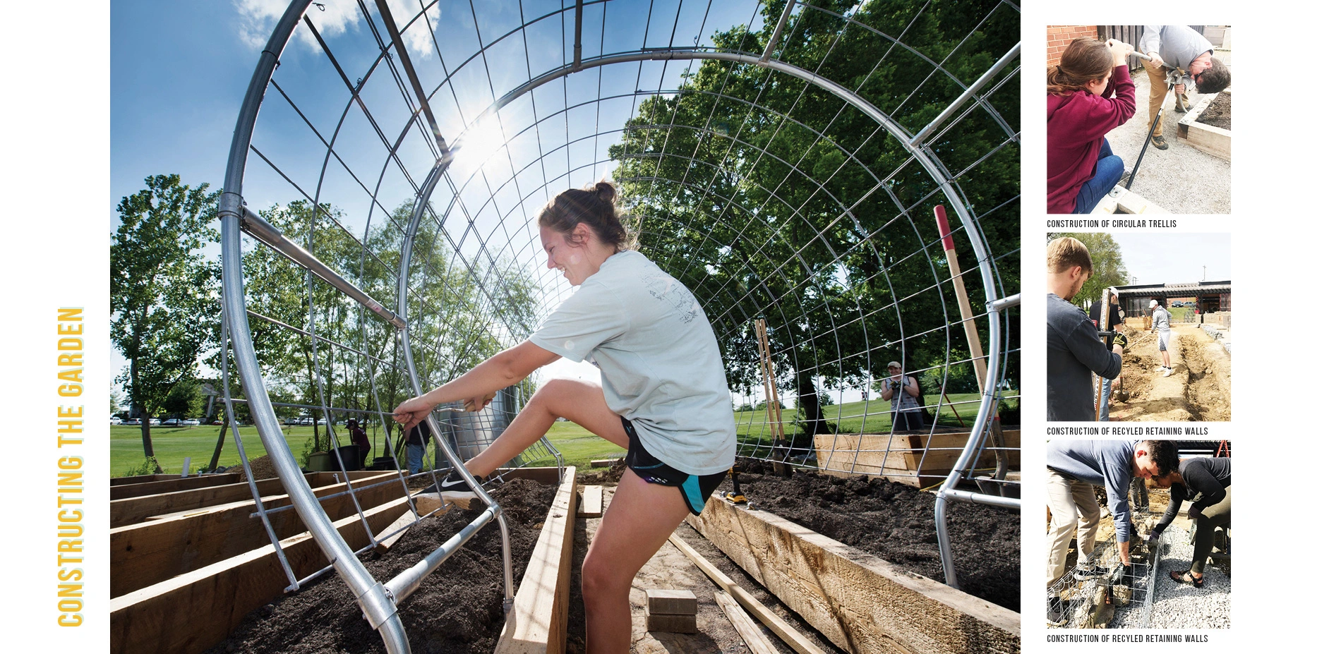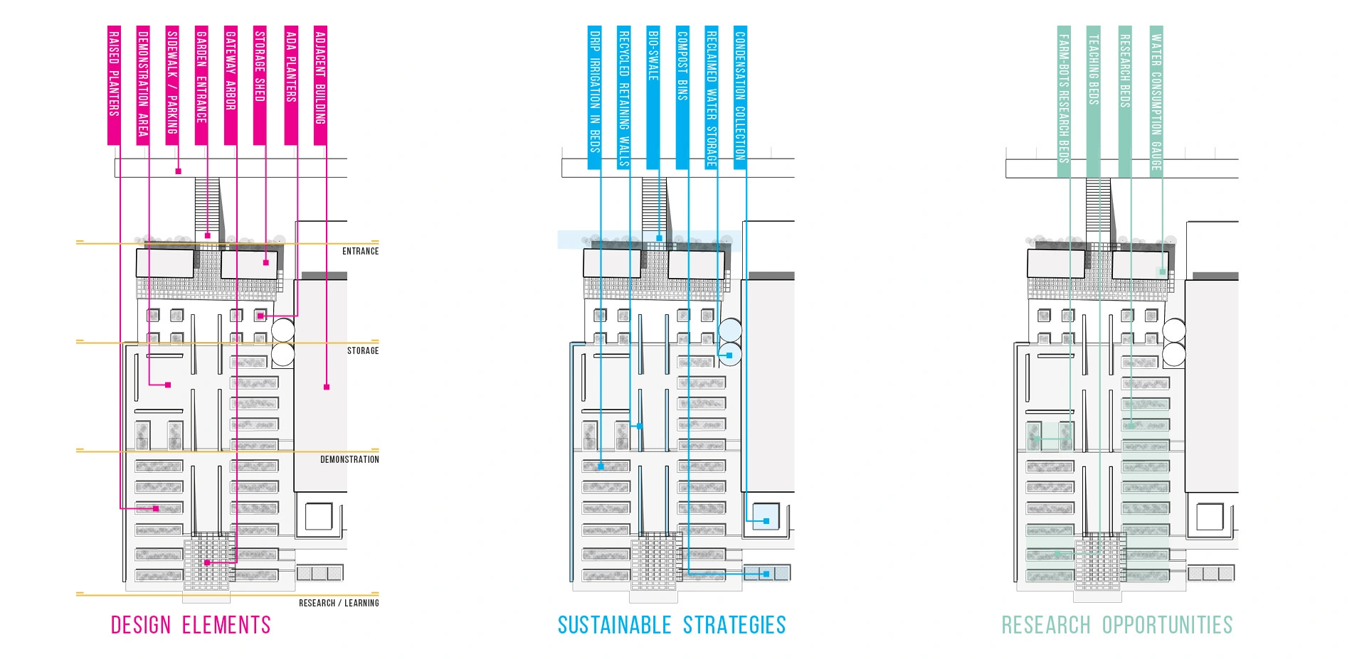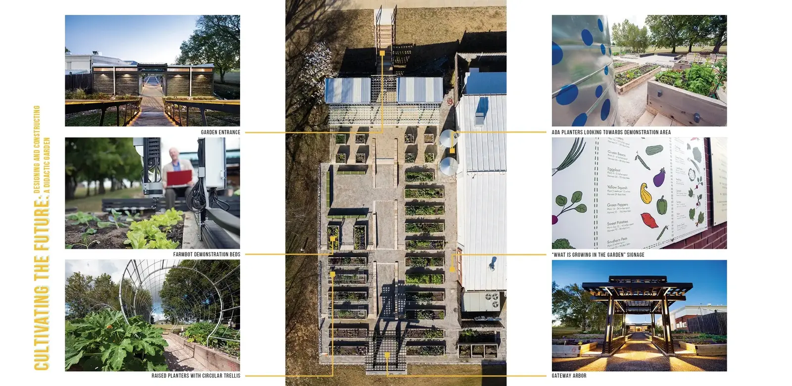 Designed to be a laboratory for learning, the didactic garden is a sustainable space for teaching, research, and outreach in support of local food. Designed and built by students in a collaborative studio with landscape architecture students leading architecture and graphic design students, the garden highlights the best of what each discipline can contribute to a collective design process. The garden has a simple but thoughtful design that works with the existing site to create a series of rooms associated with four terrace levels. A central walk and stair tie the rooms together creating a central axis for service and accessibility. Numerous educational elements are incorporated into the garden including Farmbots, a classroom space, and educational graphics. Incorporating technologies typically reserved for larger applications, the garden minimizes potable water consumption and maximizes efficiency through an automated water recovery, collection, filtration, and distribution system. Overall, the garden is an innovative landscape that has serves as a model for what urban agriculture could become as it is intentionally integrated into communities.