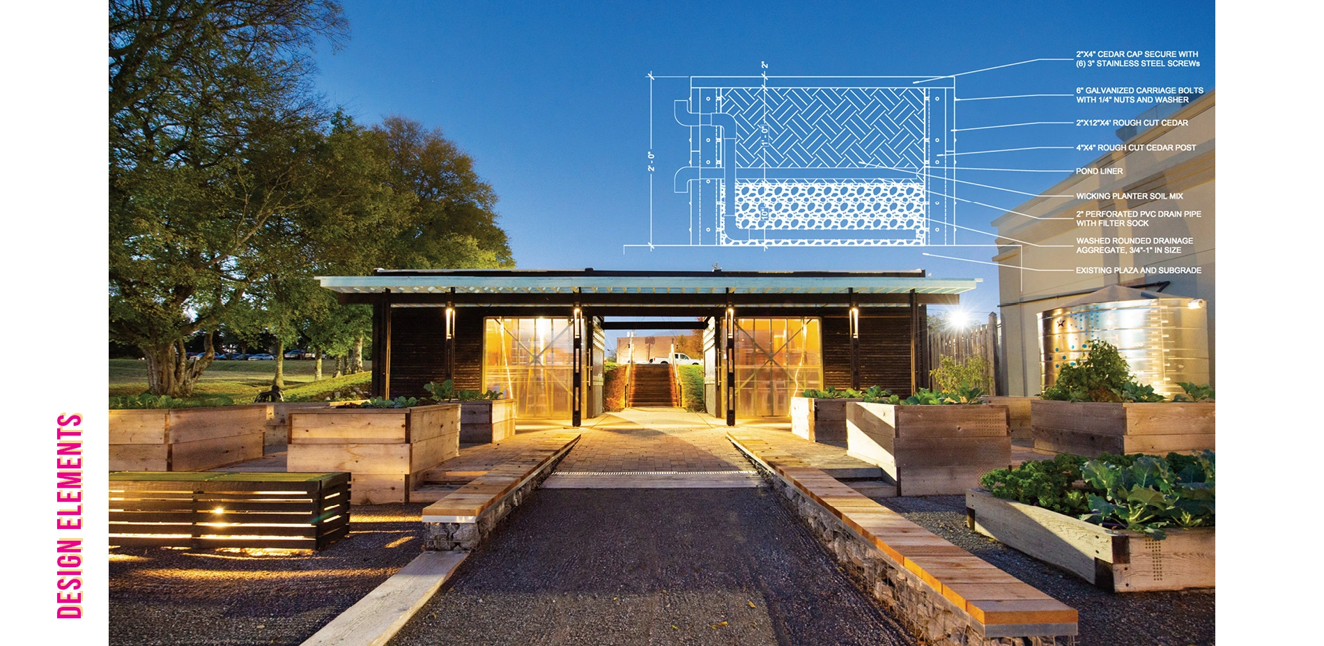 Planting Beds: The 17 standard and 2 farmbot beds are constructed of 4" cedar timbers lap jointed and pinned with 3'x1/2" galvanized pipes with the flange turned up to connect to the cedar. The remaining 8 accessible beds are constructed of 2" cedar boards bolted into corner posts. Each of these beds has 12" of gravel to store water below 12" of soil mix to work as a sub-surface wicking system. All of the beds are backfilled with a designed planting mix.