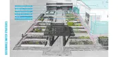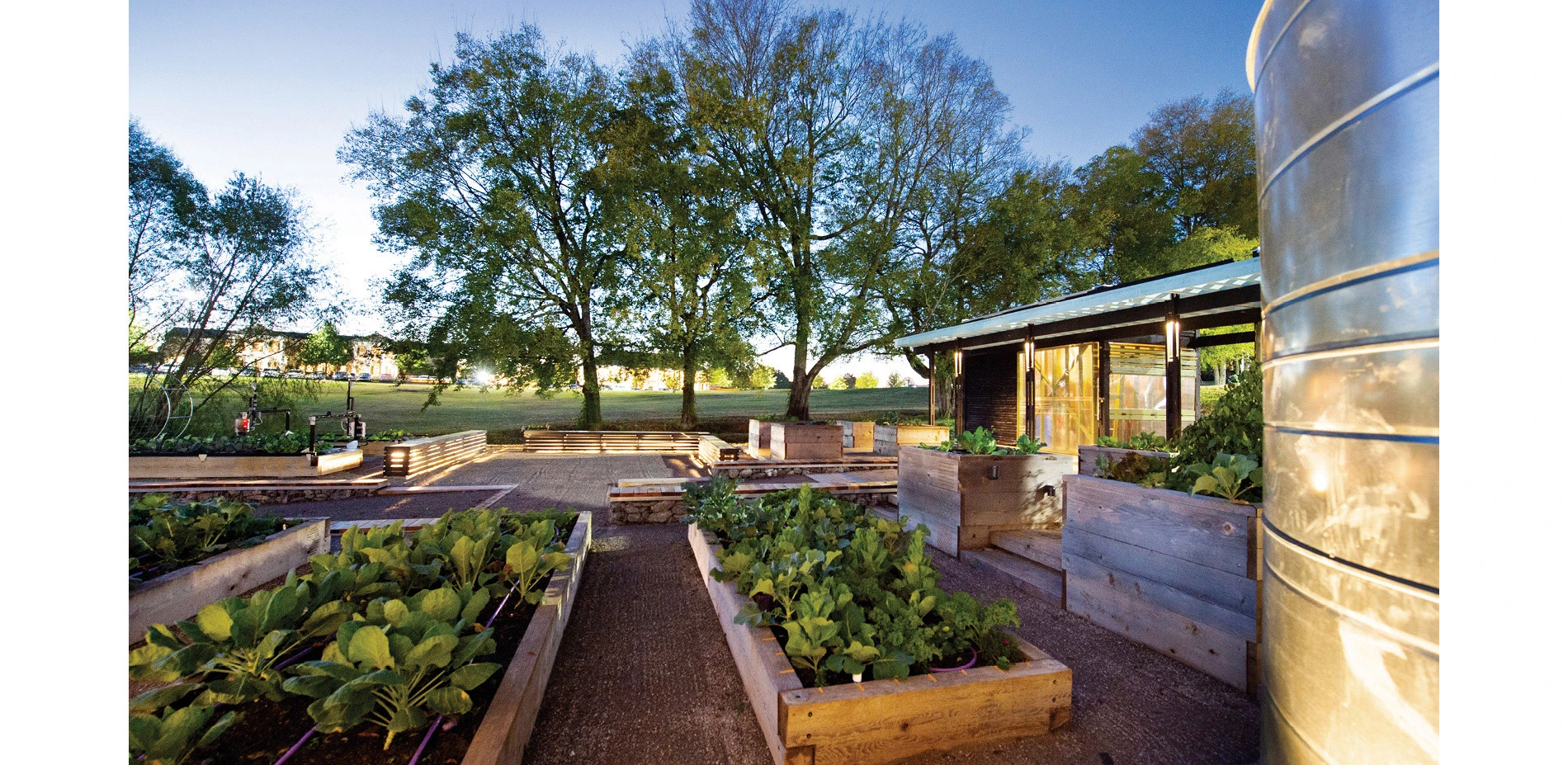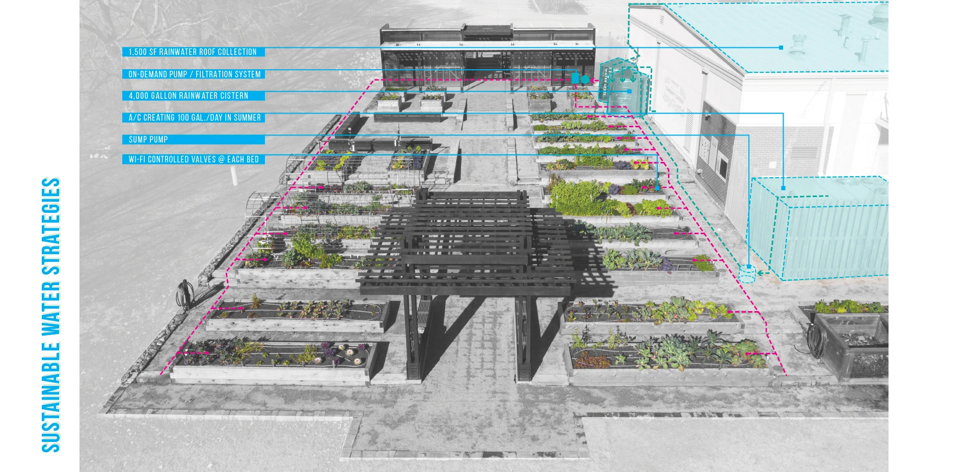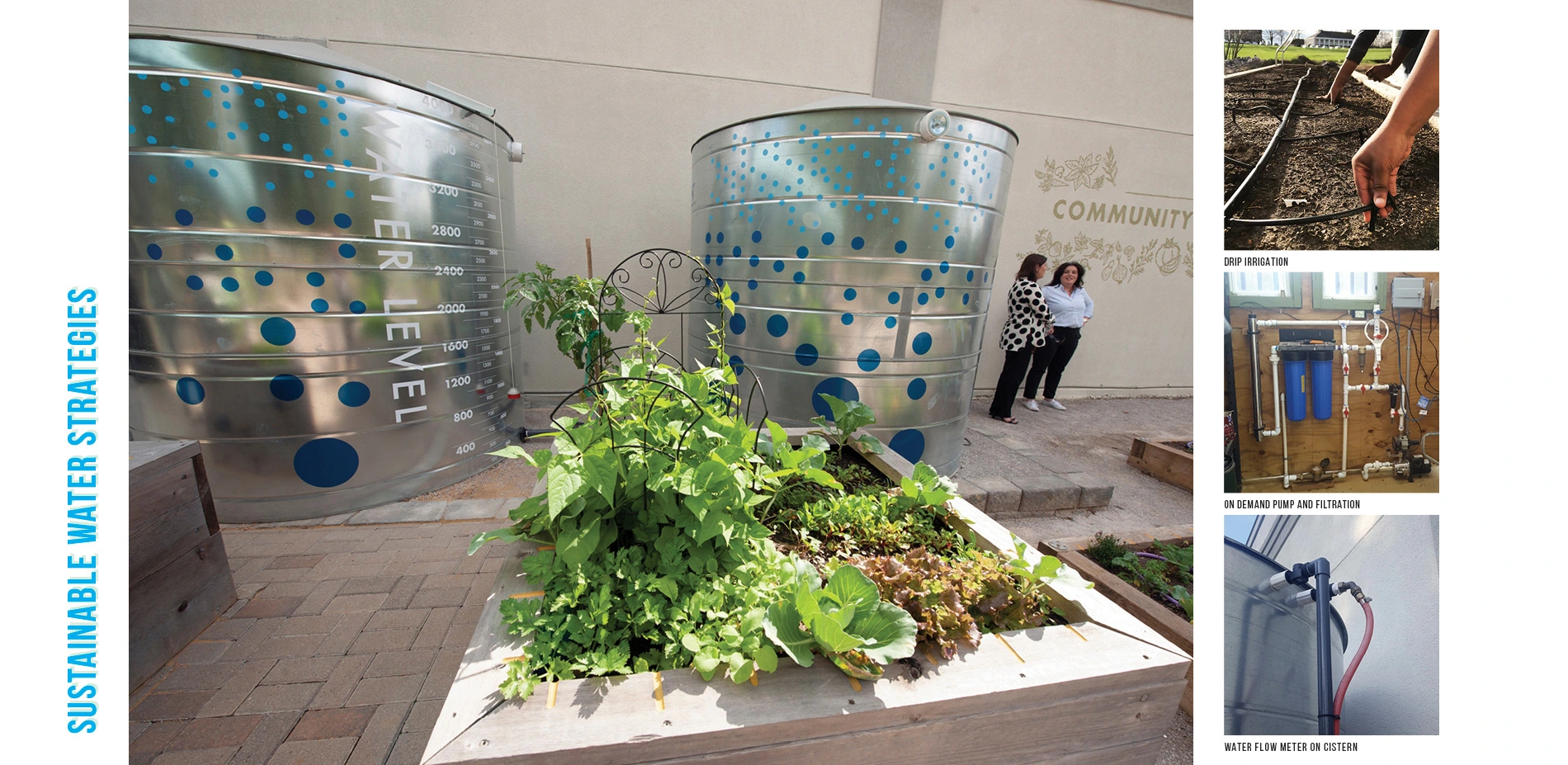 As vegetable gardens consume high volumes of water, water reclamation strategies were put into place to capture A/C condensation and rainwater from the adjacent building in two, two-thousand gallon cisterns that are used for garden irrigation. All water is filtered through a five-stage filtration system before being delivered to the garden. Each input point has a flow-meter, and the cisterns have a graphic volume scale so that data can be collected and the system refined. Irrigation to each bed is controlled by a Wi-Fi enabled controller connected to the local weather station so that irrigation needs are adjusted based on local weather conditions. Each bed has its own valve so that they can be turned off when not in use and adjusted to meet specific growing needs. Water that cannot be captured for reuse is directed through a bioswale before leaving the site.