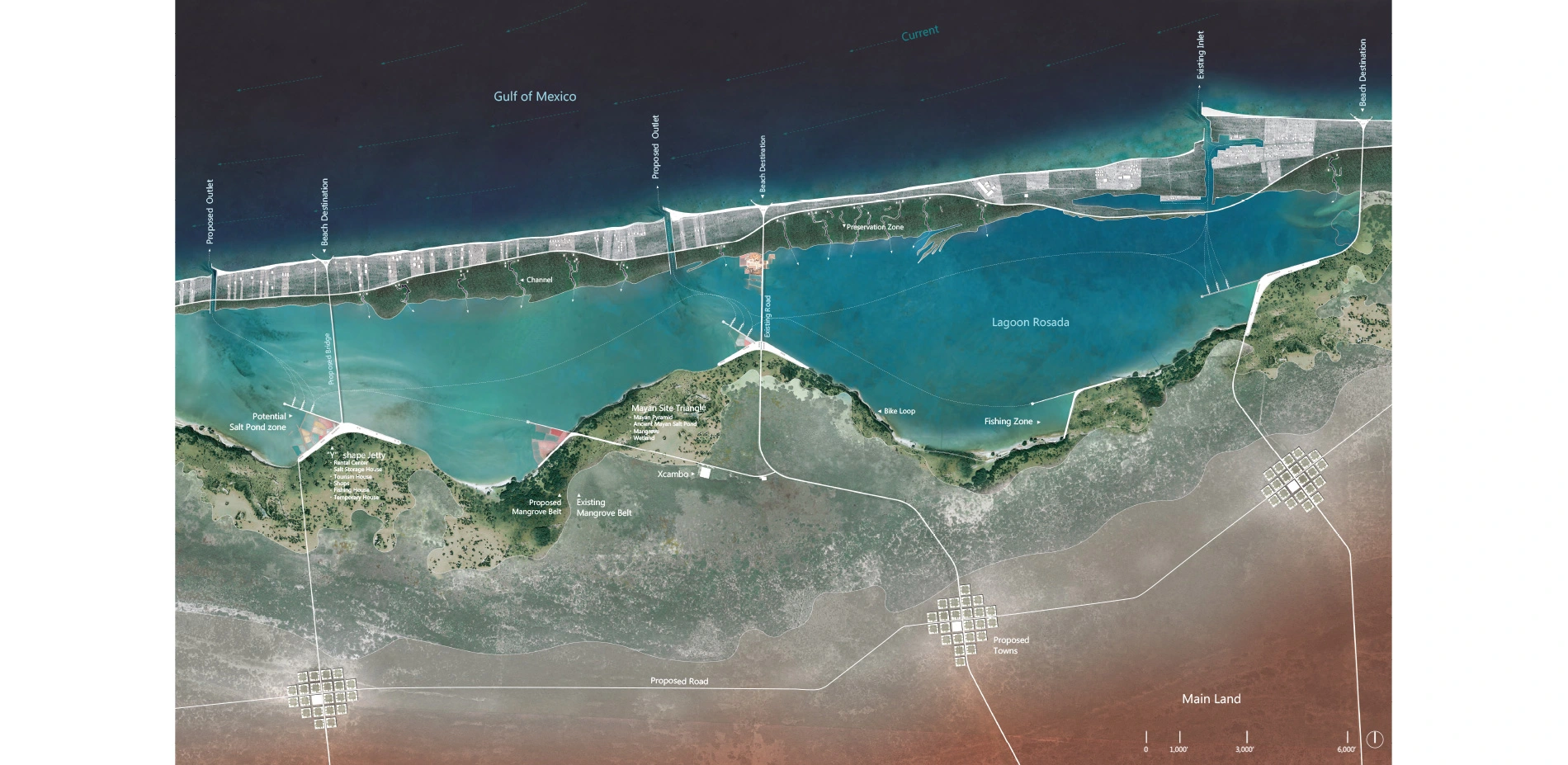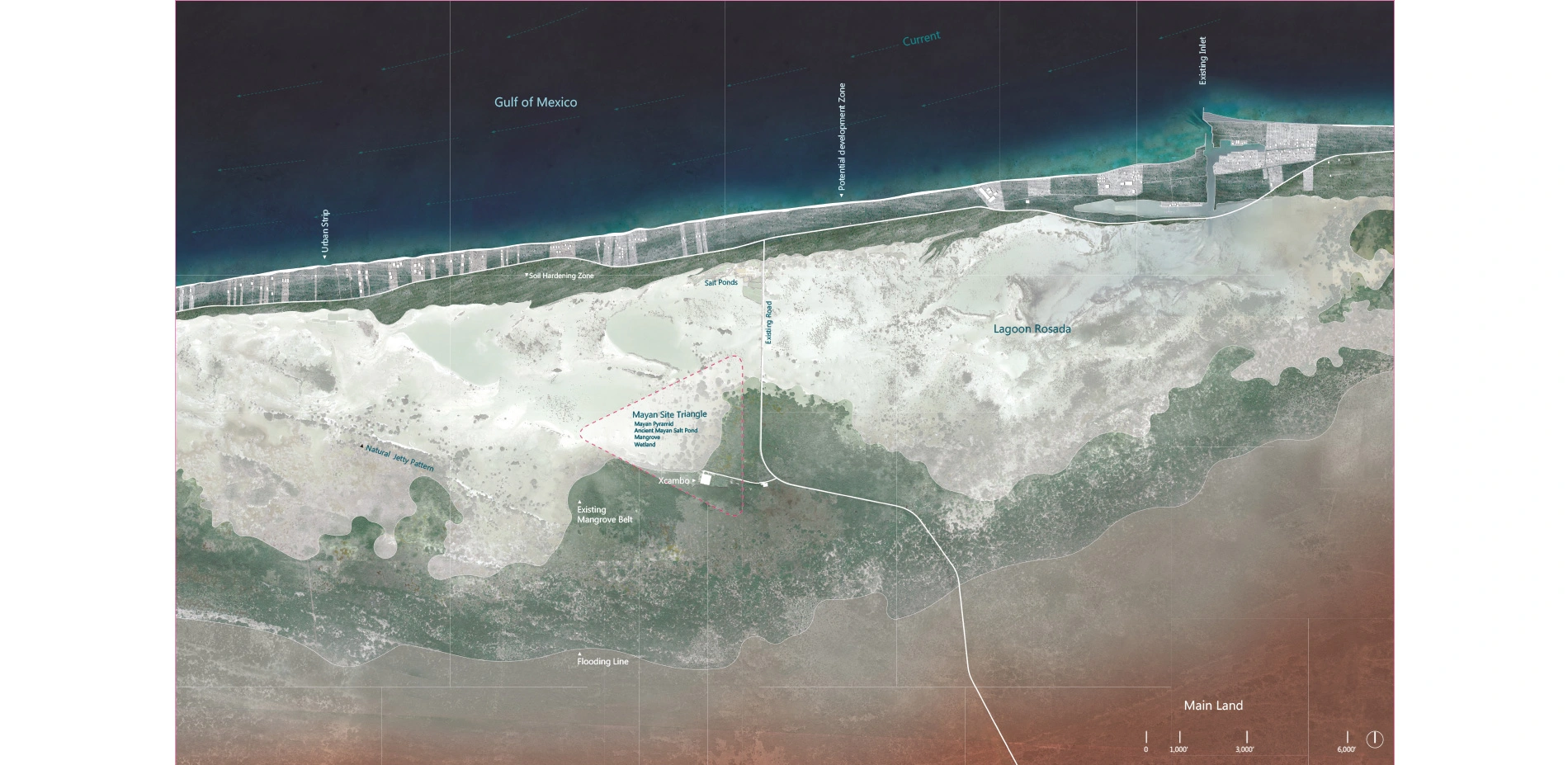 At the lagoon Rosada, many resources are disconnected due to poor accessibility. Like the salt ponds industry only exist one side of the lagoon, the population can only settle down one side of the lagoon with flooding threat and poor social services, the tourist can only visit the Xcambo, an ancient Mayan site, even though there is wonderful flamingo habitat nearby it. All reasons for that disappointment are because people cannot get to the other side of the lagoon conveniently. Therefore, the "Y" Shape Jetty system's core is a transportation-based complex. It not only provides the transportation option but also an evident attraction at the middle of the lagoon which could serve as a transition and guide people to the other side, the inner side of the lagoon where has more opportunities in terms of urban development and tourism.