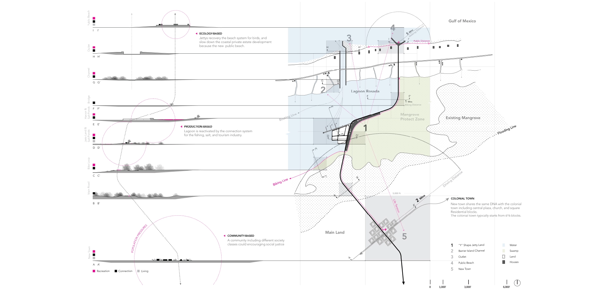 Through the proposed jetty land and road around it, new towns could happen for the population from the barrier island and others works attracted by this new business from all around the world. Finally, there are three major components of this new lifestyle. The community-based life circle is the alternative towns which have higher space potential to support multiple social class than barrier island does. Then is the production-based life circle in which people could run their new business due to global tourism, like restaurant, shop, salt ponds and flamingo tourism, and local fishing industry. The tourist could stand on the jetty land and overlook and enjoy all those attractions. Comparing with the beach, lagoon now is more attractive and engagable. People could start their business here. The last is the ecology-based life circle where has less social and economic pressure than the past because lagoon and mainland share many of those pressures. With this new and flexible lifestyle, many parties have their own alternative to have a better life.