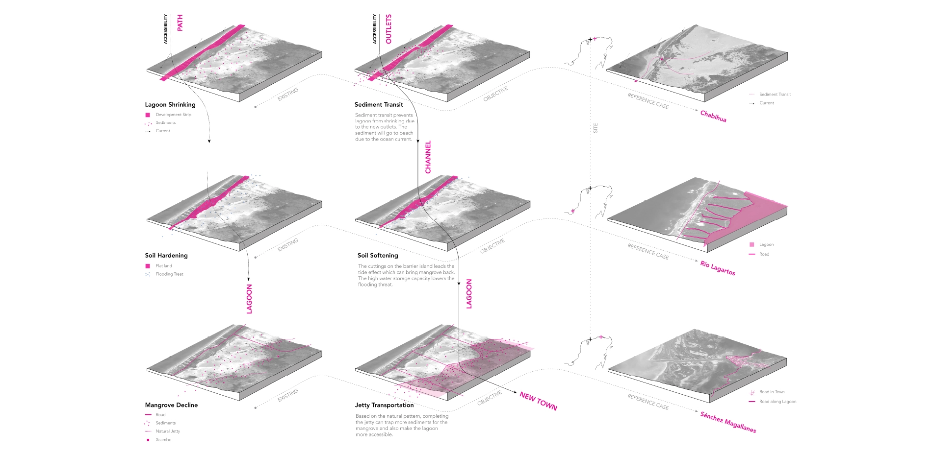 There are three big movements for the environmental restoration. First, are the new outlets on the barrier island to transit the sediments in the lagoon. This is specifically important in the lagoon system because the lagoon is shrinking due to the high sedimental rate. After opening the outlet, those sediments could be brought out of lagoon by the tidal effect and then go to the downside of the beach for the sand's replenishment.