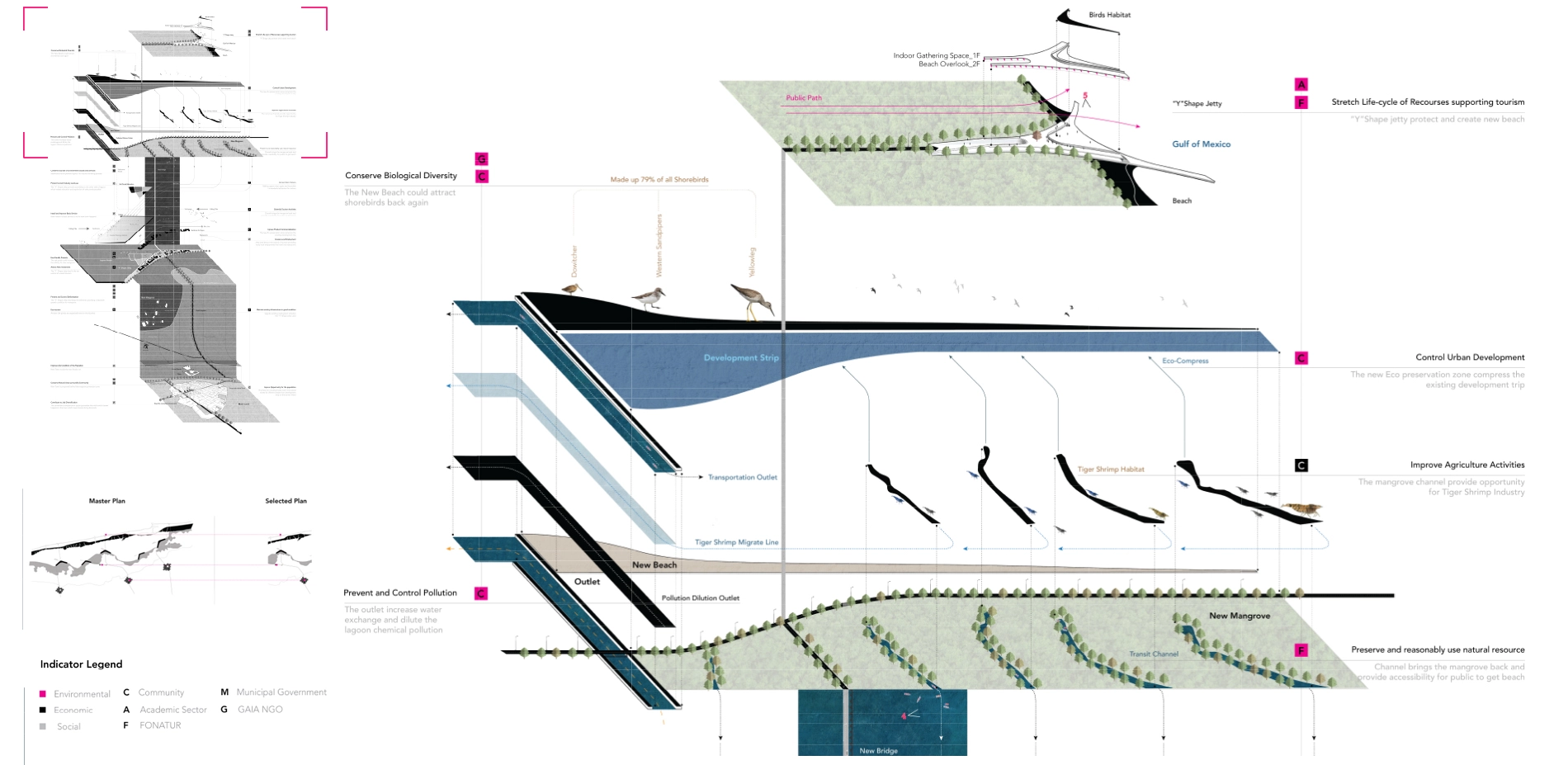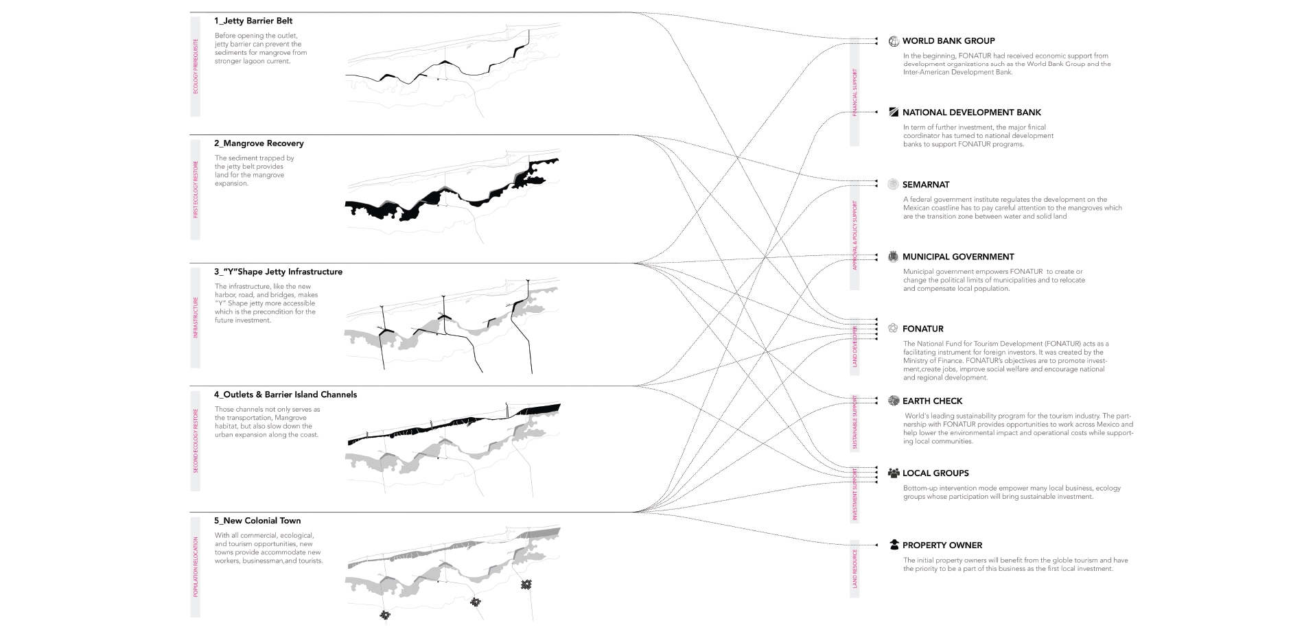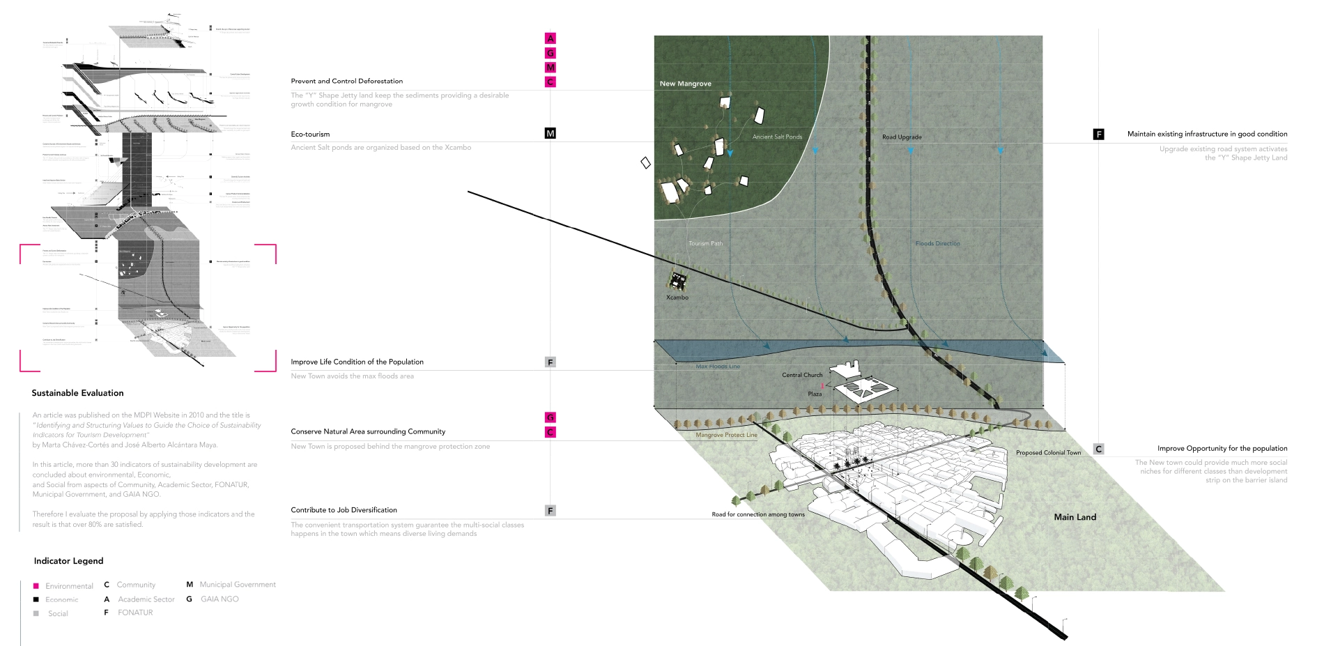 "Y" Shape Jetty project, located the Rosada Lagoon in Yucatan peninsula, Mexico, provides an alternative for the coastal development in Mexico. It establishes a new Coast-Lagoon-Mainland-based life circle instead of putting all stress on the narrow beach zone. This is not only a new circle of life but a circle of environment protestation and sustainable tourism development. The salt ponds industry, fishing, boating, eco-tourism, restaurant, hotels will be available around this jetty project in the middle of the lagoon, which serves as a transition joint connecting opportunities on the coast and mainland. Within this new stretched life circle, more local people, groups, and parties can be a part of it together contributing to the development of social justice.