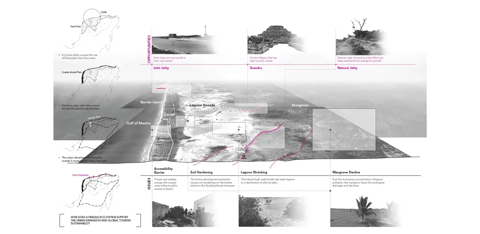 This program is a lagoon-based sustainable development between tourism, environmental protection, and inclusive communities. The location is in Yucatan Peninsula, Mexico, and the lagoon name is Rosada, a 3000-hectare fragile natural topography with intense urban expansion pressure in the future.
