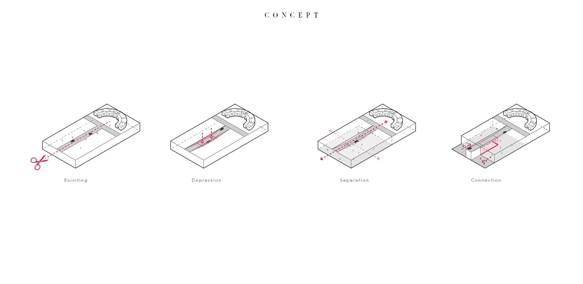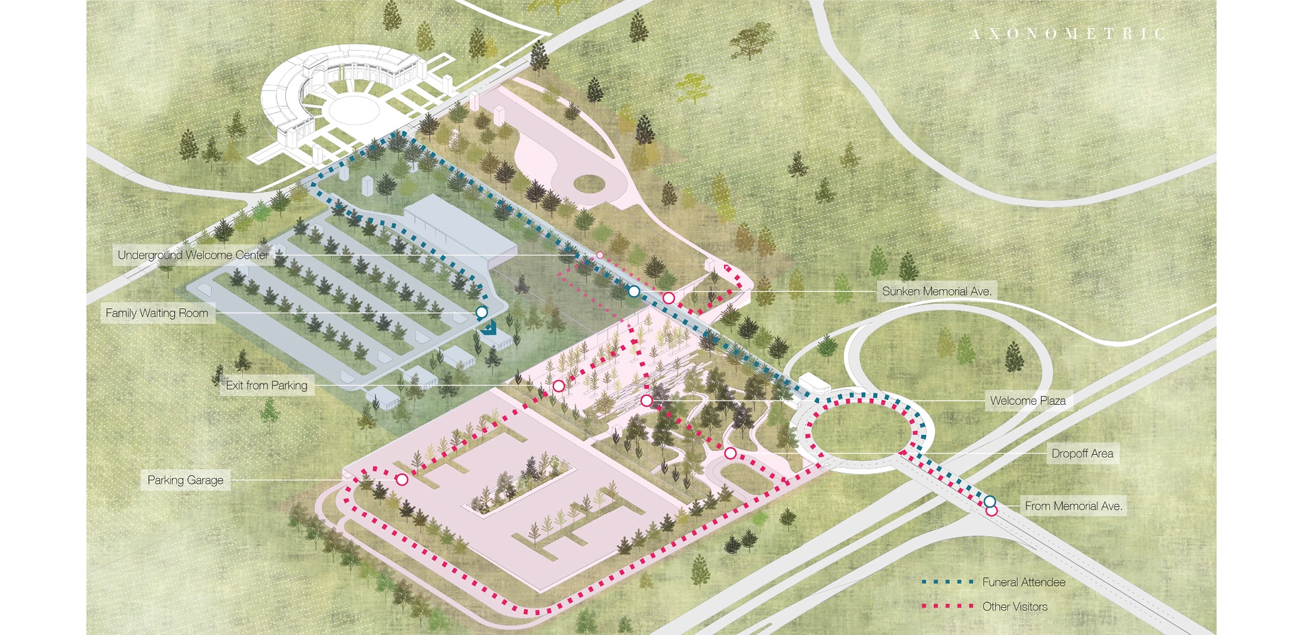 The design centers around the proposed sunken Memorial Avenue that cuts into the landscape as well as the proposed underground welcome center. Human being's relationship to the ground is profound, and especially in Arlington National Cemetery, where people buried their loved ones into the earth. Inspired by the inherent emotional feeling that resonates when moving into the ground, the design uses elevation change to create a unique spatial experience and physical separation for the conflicting visitor bodies.