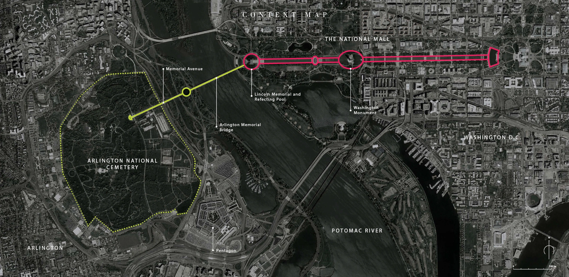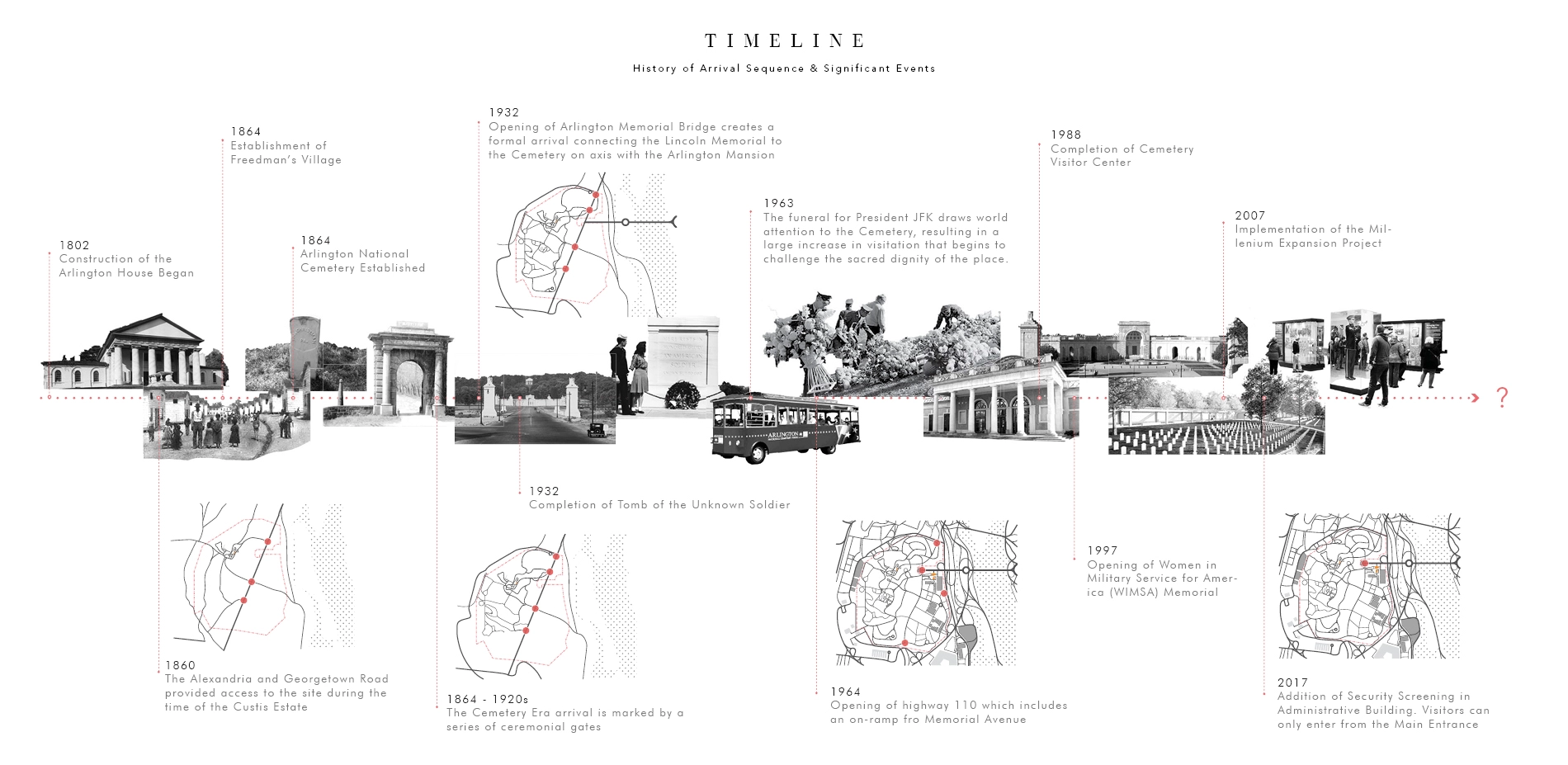 The studio focused on one of the most complicated examples of the most basic design problem – how to get people to their destination – in a manner befitting the place. In this case, the nation's most hallowed shrine. The project began with researching historic archives to understand how the arrival sequence to Arlington has changed with the addition of urban infrastructure and modern interventions in the past century and a half. Worldwide precedent studies on sacred places arrival experience were analyzed, looking to define the attributes of a graceful experience.