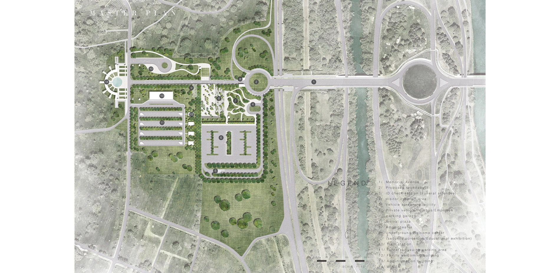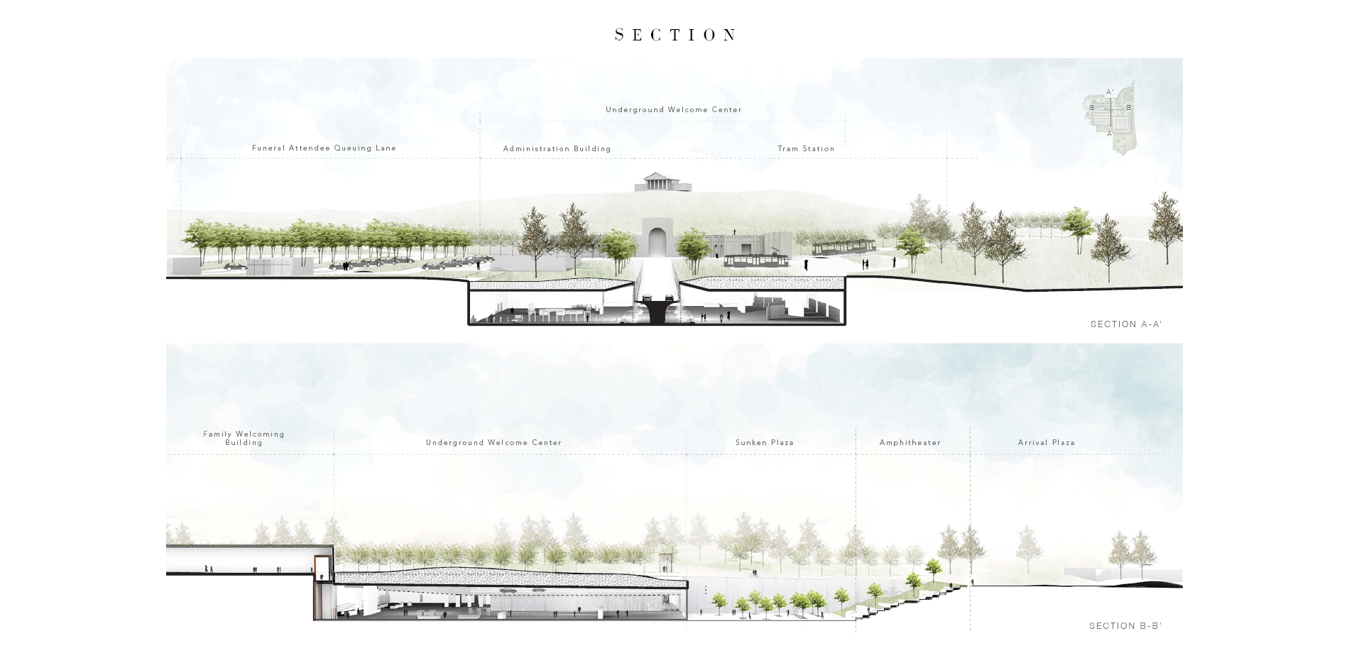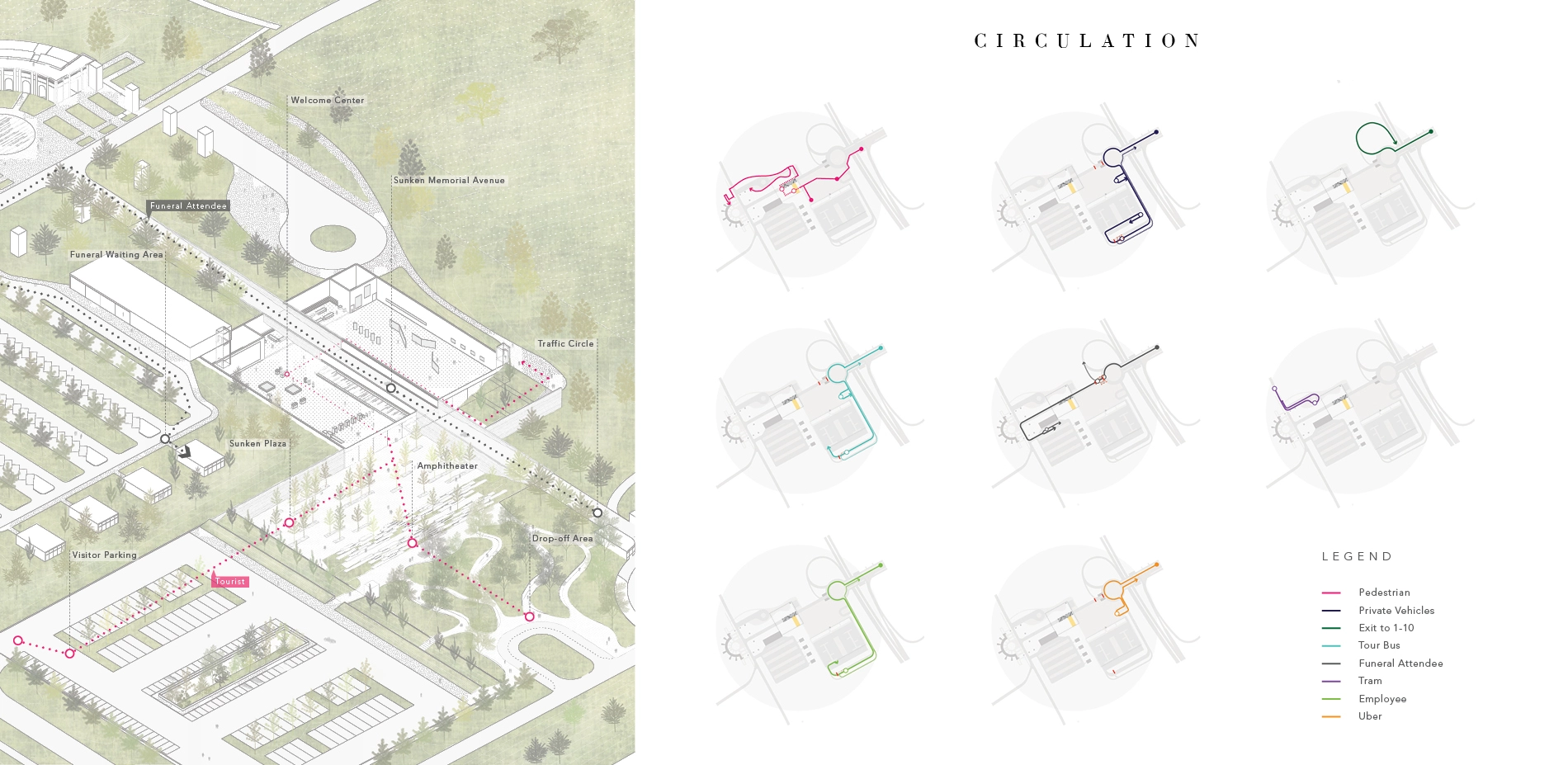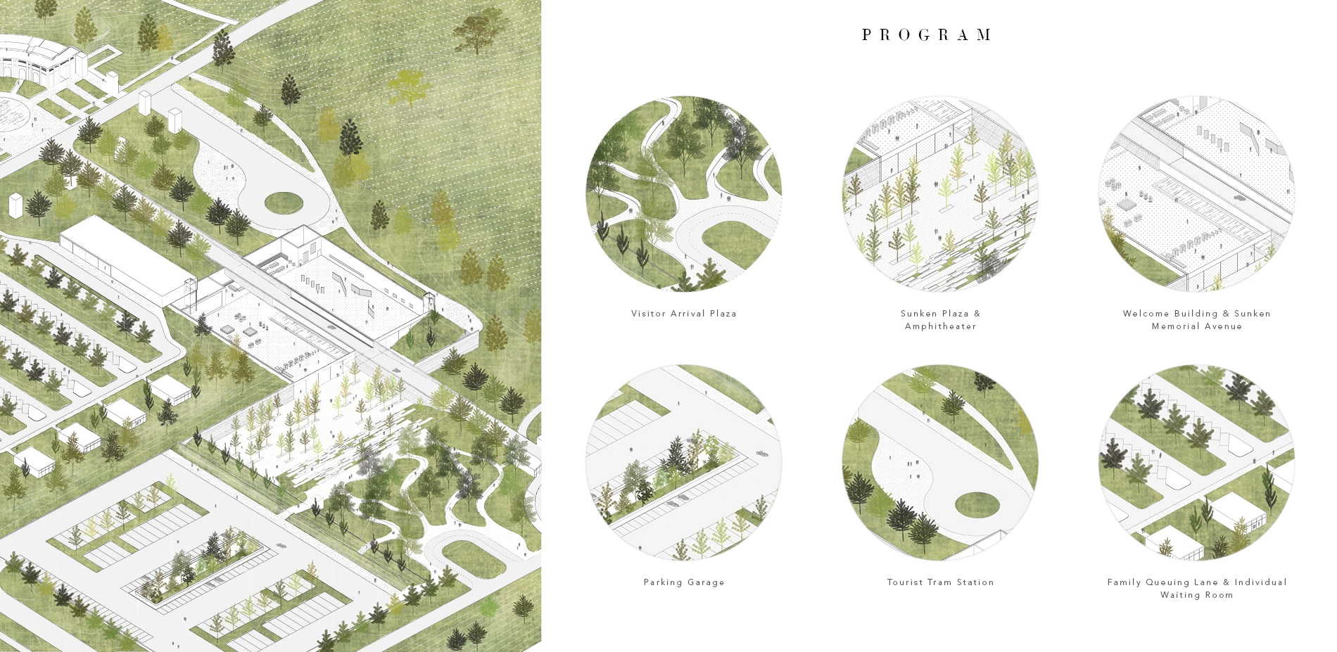 DesignThe proposed design includes a new traffic circle that acts as a notation of turning at the axis of the Memorial Avenue, dispersing traffic into different destination; a welcoming plaza and amphitheater; an underground welcome center contains security screening and educational exhibition, with the roof physically split into half by the partially sunken Memorial Avenue cuts into the building; a funeral attendee and administrative area with densely planted periphery to visually screen all the tourist activities; a three-stories parking garage accommodating parking for tour bus, visitors and employees; and lastly, a tram station for the cemetery tour.