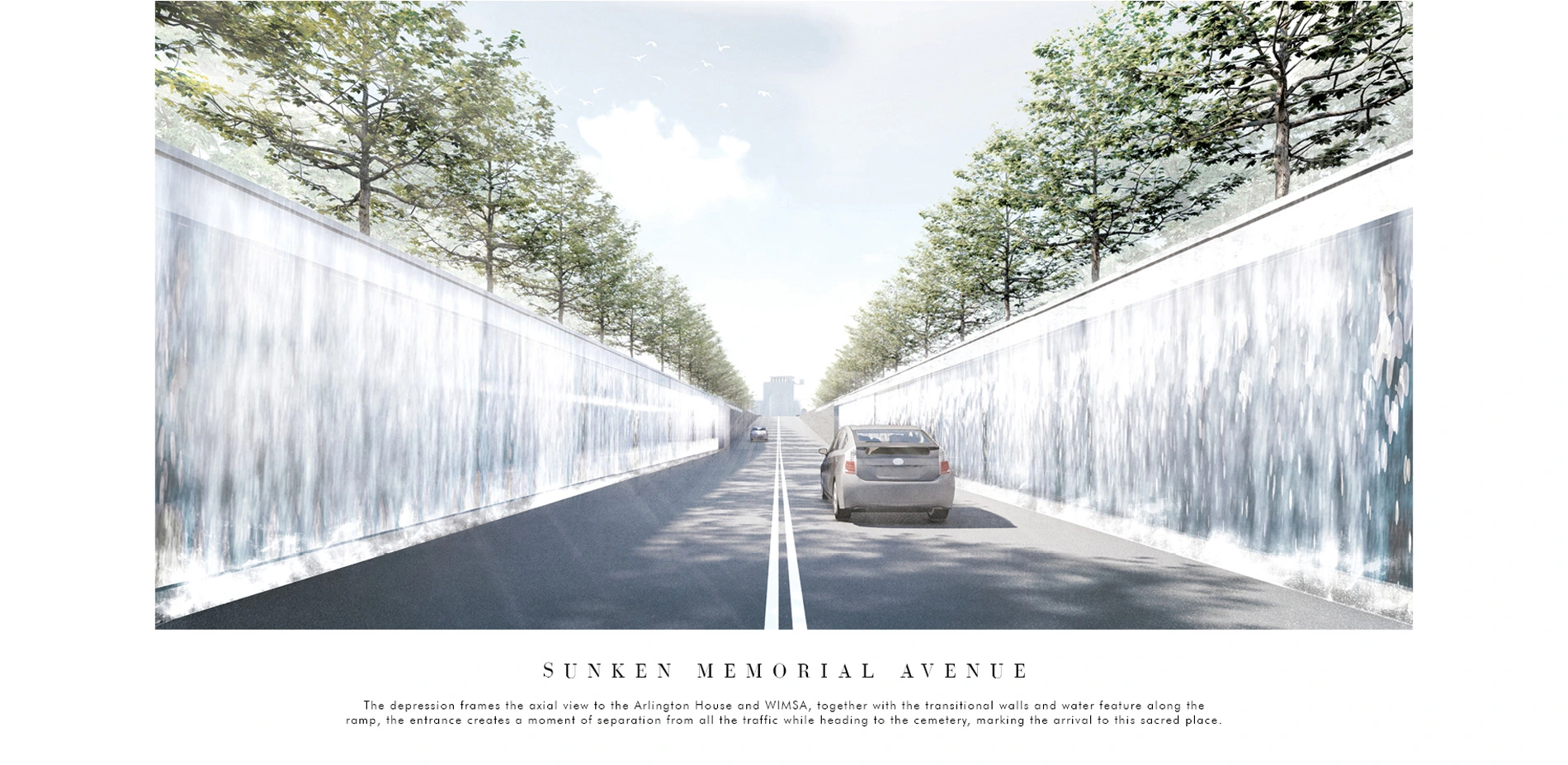 The axial sunken memorial avenue is preserved for the funeral attendees. Together with the transitional walls and water feature along the ramp, lines of trees soften the hard edges and linearity of the axis. The depression on Memorial Avenue frames the axial view to the Arlington House and creates a moment of separation from all the traffic while heading to the cemetery, clearly marking the arrival to this sacred place.