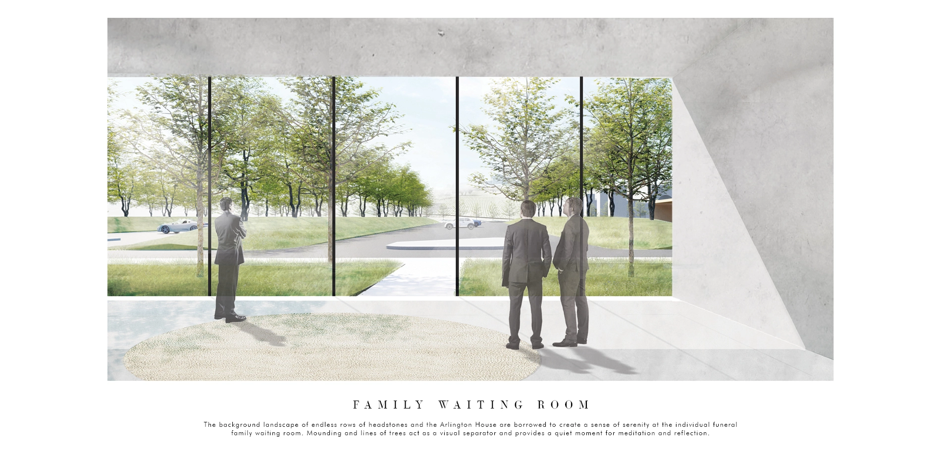 Individual family waiting rooms are introduced adjacent to the funeral waiting lanes. The background landscape of endless rows of headstones and the Arlington House are borrowed to create a sense of serenity. Mounding and lines of trees act as a visual separator and provide a quiet moment for meditation and reflection.