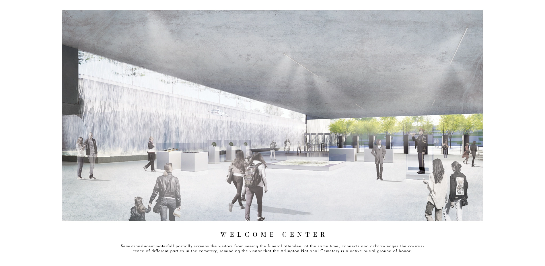 Visitors travel across the site on a diagonal axis to the funeral attendees, with the seemingly overlapped area separated by elevation change. The spacious underground welcome center accommodates the expanding administrative function, providing room for security screening, educational exhibition, and administrative use. The central semi-translucent waterfall partially screens the visitors from seeing the funeral attendee on the sunken Memorial Avenue, at the same time, connects and acknowledges the co-existence of different parties in the cemetery, reminding the visitor that the Arlington National Cemetery is an active burial ground of honor.