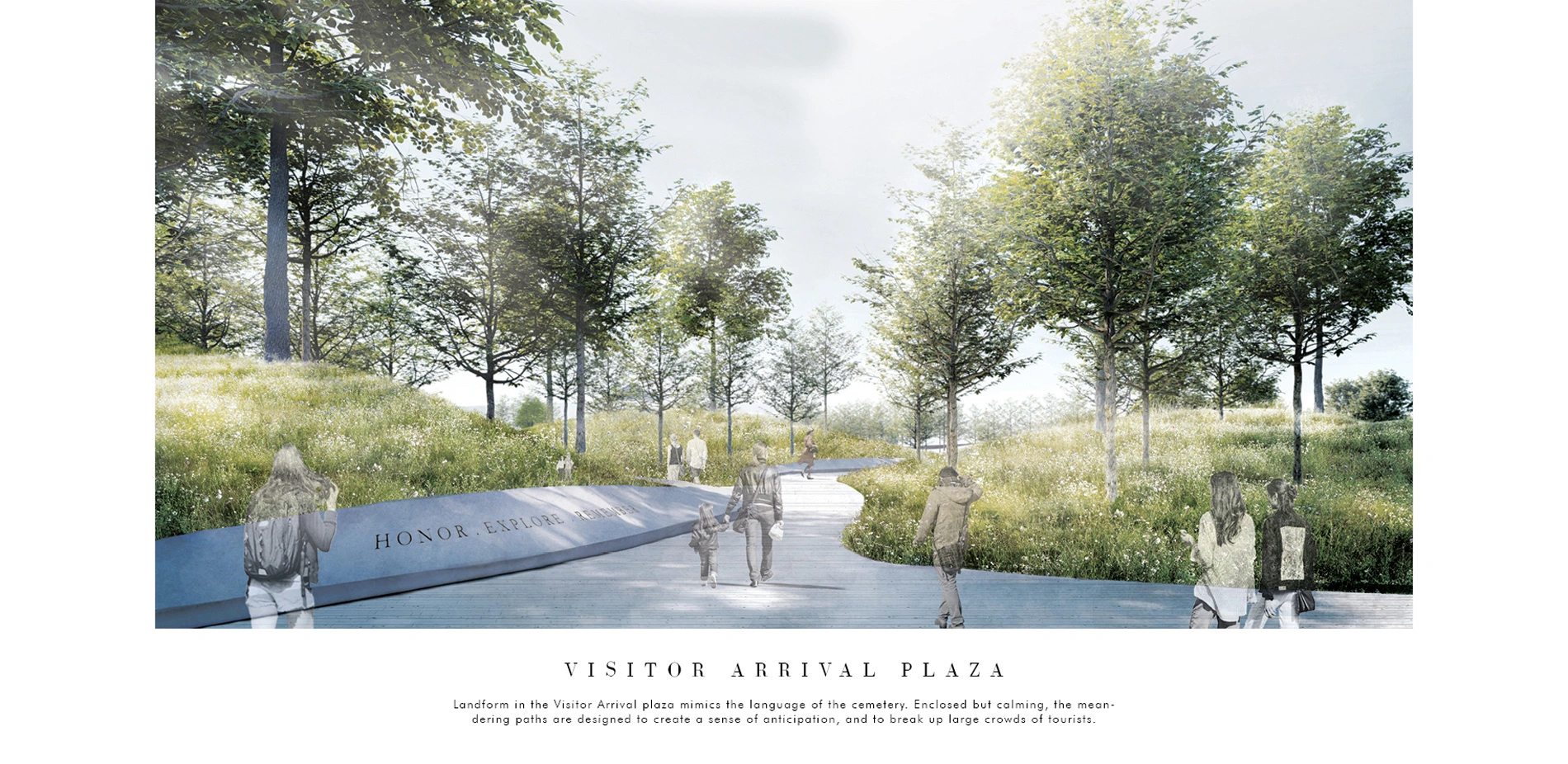 Engaging Hallowed Ground: Re-envisioning the Arrival Ground of Arlington National Cemetery explores the power of design in narrating experience that befits the characteristics of the landscape. Oriented around a simple aspiration – to create a functional yet compelling space to prioritize and provide a dignified, graceful arrival experience for the families of the honored dead, while acknowledging and providing the capacity to the growing body of tourist visiting the Nation's most hallowed shrine. the proposal has expanded the capacity of the site, accommodated, and enhanced the arrival experience for all through careful vertical separation and spatial configuration.