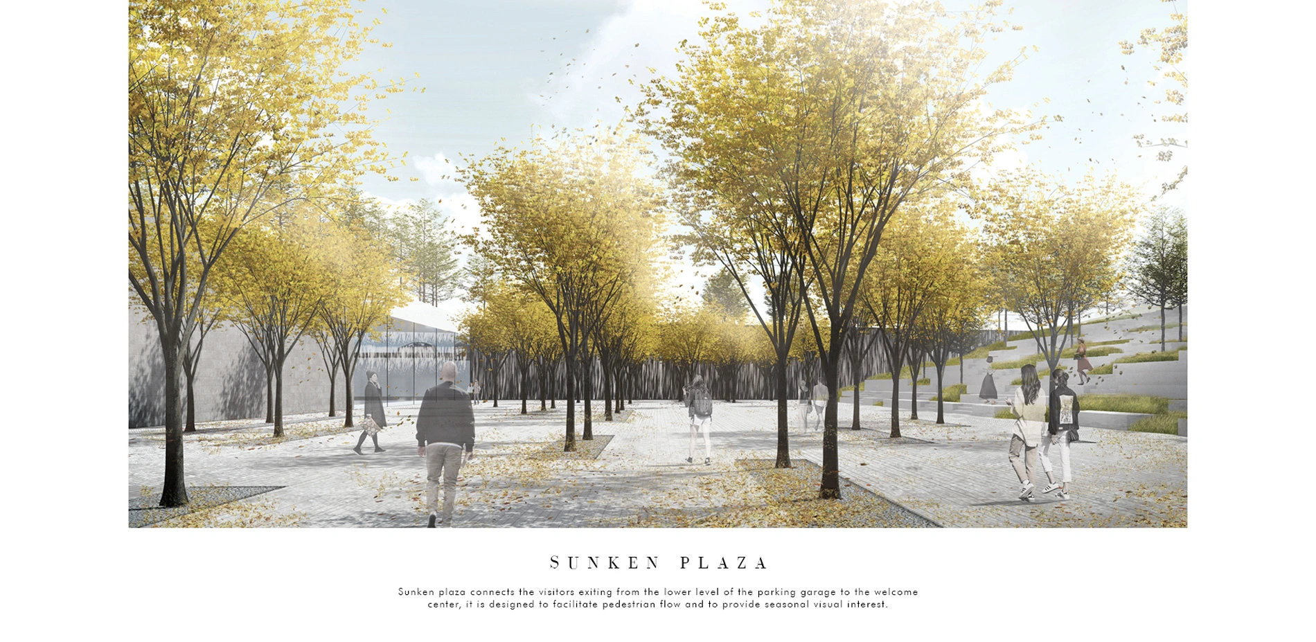 Visitors are guided to the underground welcome center through plazas designed to provide an elegant experience and legibility. Located next to the drop-off area, landform in the visitor arrival plaza mimics the language of the cemetery. Enclosed but calming, the meandering paths are designed to create a sense of anticipation and to break up large crowds of tourists. Engraved concrete curbs echo with the JFK gravesite provide visual interest along the path. The sunken plaza connects the visitors exiting from the lower level of the parking garage to the welcome center, it is designed to facilitate pedestrian flow and to provide different seasonal visual interest.