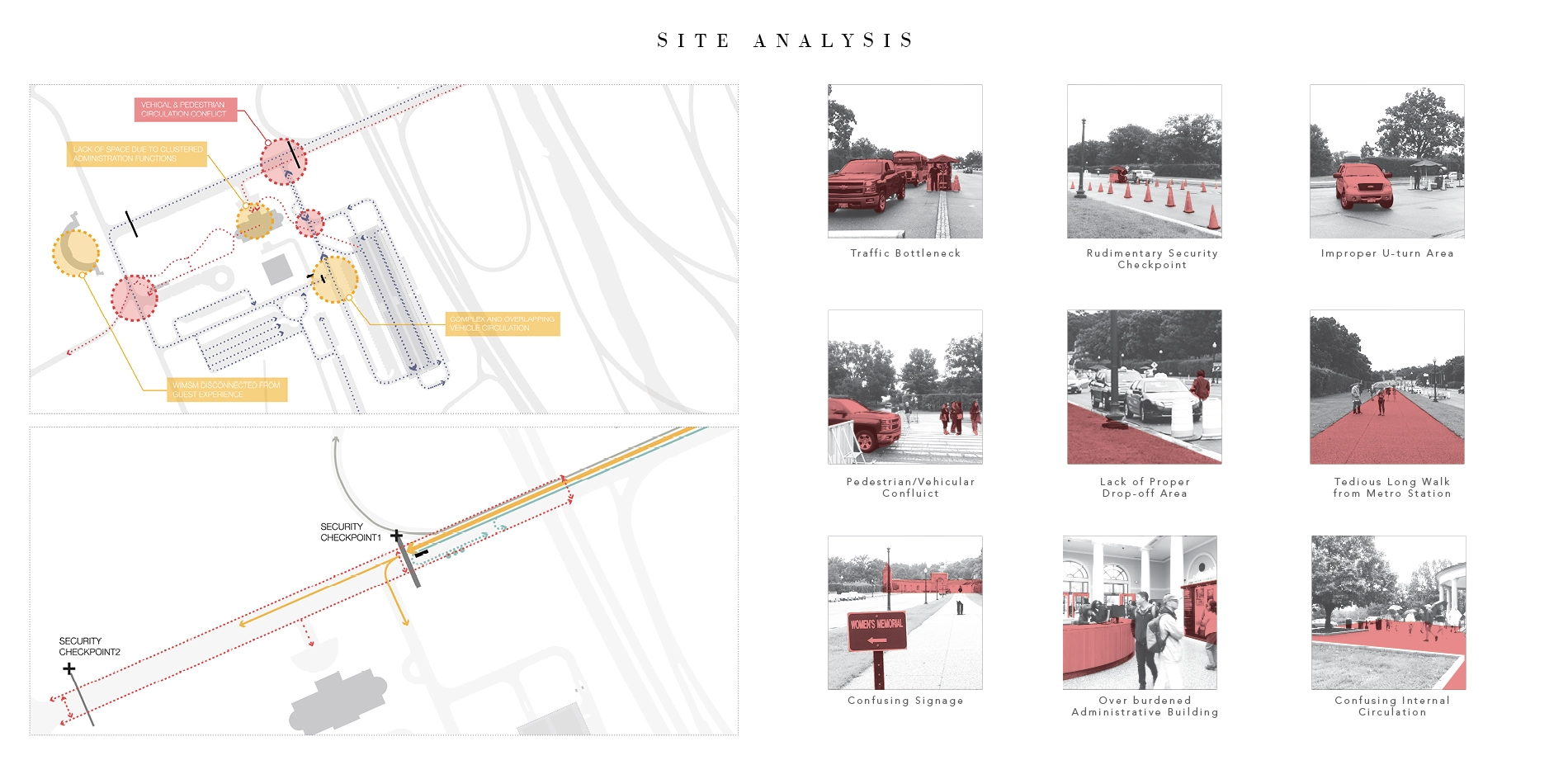 Currently, the cemetery has only one entry point – the axial Memorial Avenue that bridges from Washington DC to Arlington. Together with the newly imposed security checkpoints along the avenue, the bi-directional road has created a bottleneck and imposed heavy traffic burden as well as pedestrian and vehicular conflict to the arrival ground. In time of grief, funeral attendees have to make their way through traffic and stop at rudimentary control points to be screened for entry, while lines of traffic with cars and tour buses waiting behind impatiently. Signage and traffic cones are insufficient to overcome the confusing and chaotic traffic flow, the cemetery has to rely heavily on human staffing for directions.