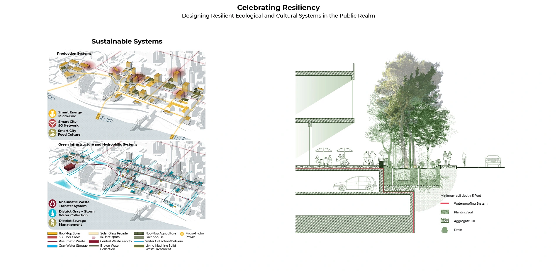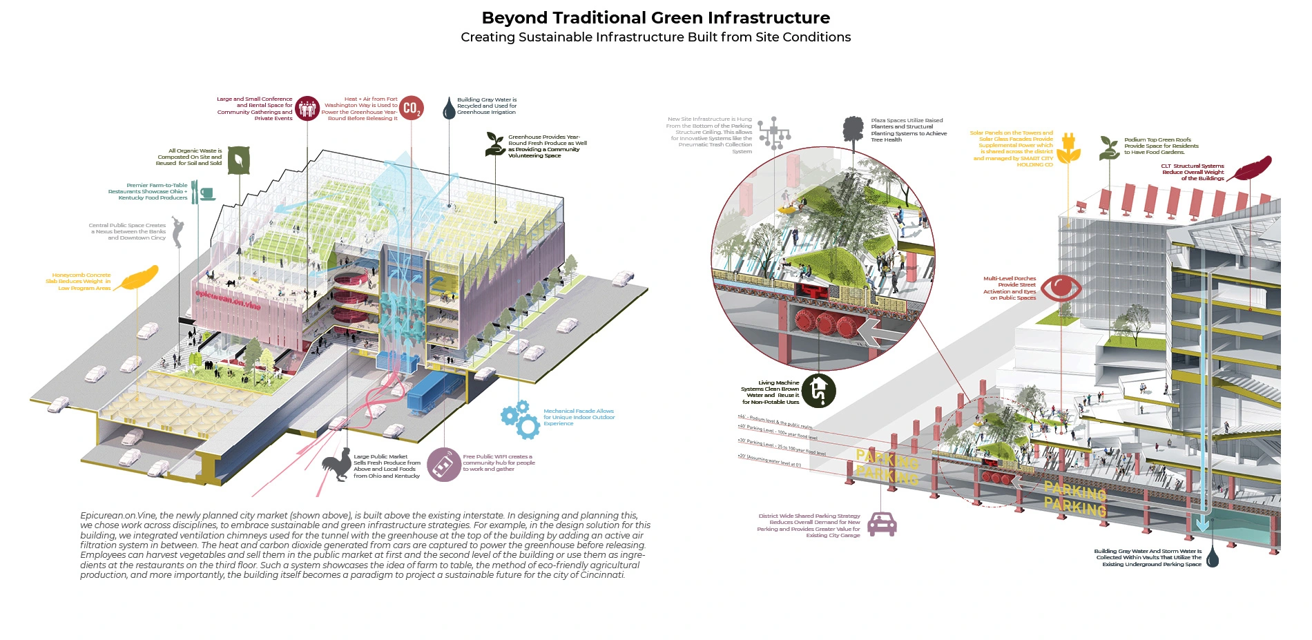 From an architectural lens, building massing is designed to encourage an active public realm. A ten-feet-setback is introduced to all the proposed buildings on the podium level, as a gesture to blur the boundary between the inside and outside. From Fort Washington Way to Ohio River Scenic Byway, proposed buildings step down to maximize daylighting while preserving a visual connection from the Central Business District to the river. On the podium, we suggest the installation of green roofs as a passive method to reduce cooling costs in summers, while at the tower tops, solar panels are recommended to generate energy actively.