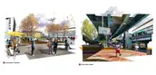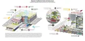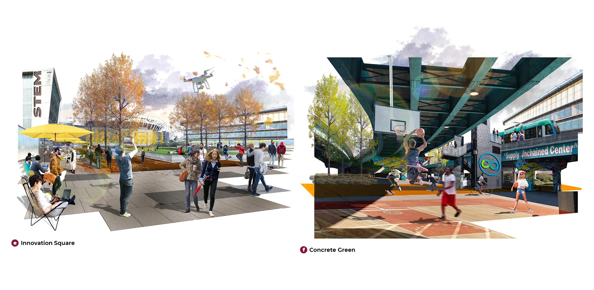 Flanking the stadium, Elm Street is seen as an extension of the convention center, populated with a core retail hub, restaurants, food trucks, large urban plazas, and an iconic stadium hotel. On the western edge of the site, Innovation Square and Concrete Green keeps today's function while introducing new uses. Innovation Square and the larger Supply Unchained Campus sits above parking that provides spaces for stadium and daily use. This public plaza serves as a common ground for STEM school students and campus employees and sits in contrast to the gritty infrastructural nature of Concrete Green, a new hybrid public space.