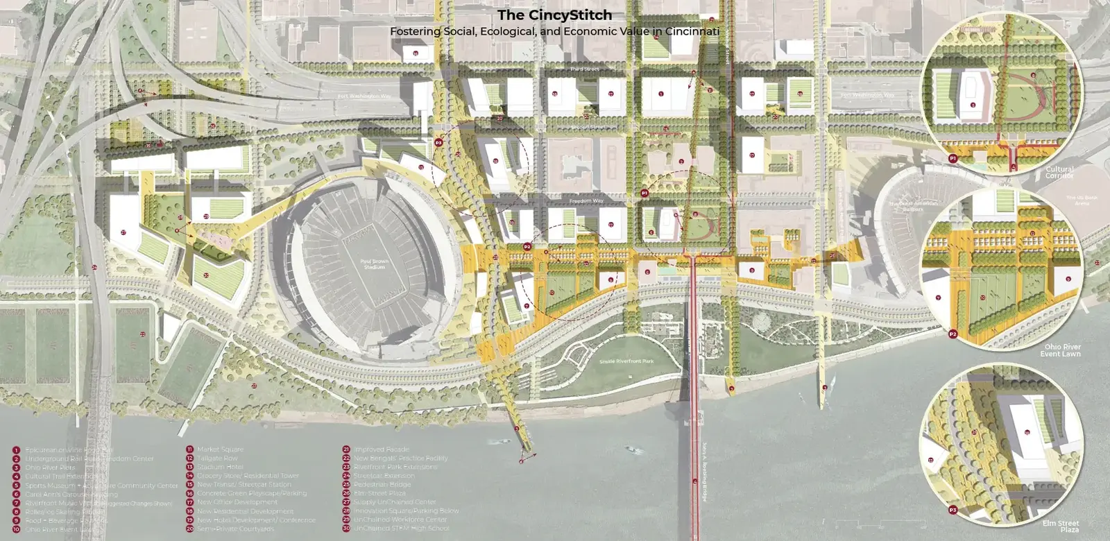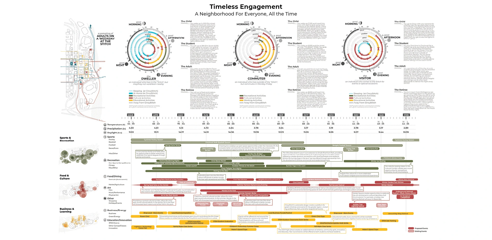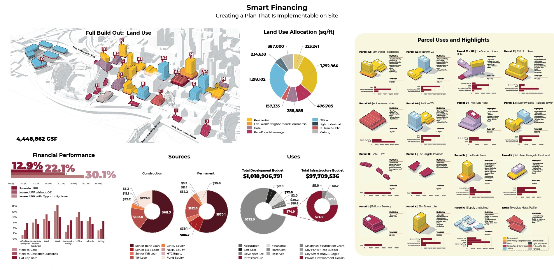 "The CincyStitch" is a multidisciplinary project that repositions a pivotal stretch of Cincinnati's waterfront not as the city's edge, but as the center of a connected region, allowing people to have a place to live, work, and play. Through four threads—Culture and History, Public Realm, Transportation/Infrastructure, and New Economies, the proposal strategically links and develops a formally vacant downtown site to create connections and break down barriers across geography, time, demographics, and perception. To work on a project with a complex site condition, it requires a team with diverse backgrounds. We assembled a team of students from both Harvard GSD and MIT, across four academic departments, including landscape, architecture, planning, and finance. The project displays landscape architecture strategies of a highly-active public realm for all Cincinnatians, sustainable and well-integrated green infrastructure design solutions for new development, equitable site design, multi-modal transportation prioritization, and diverse and dynamic recreational opportunities that all have a monumental impact on city/building design and can, with collaboration, be well-funded and prioritized in phasing.