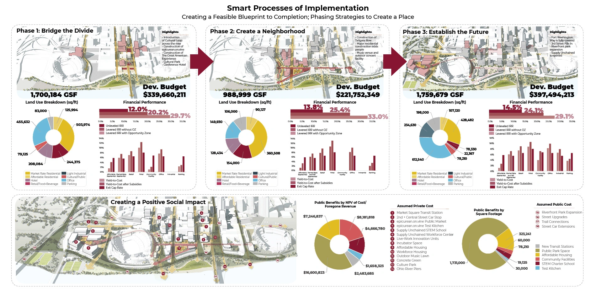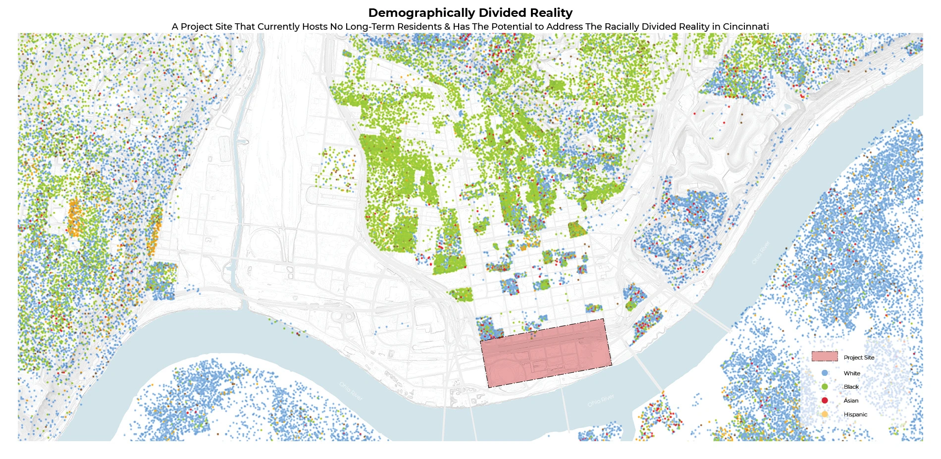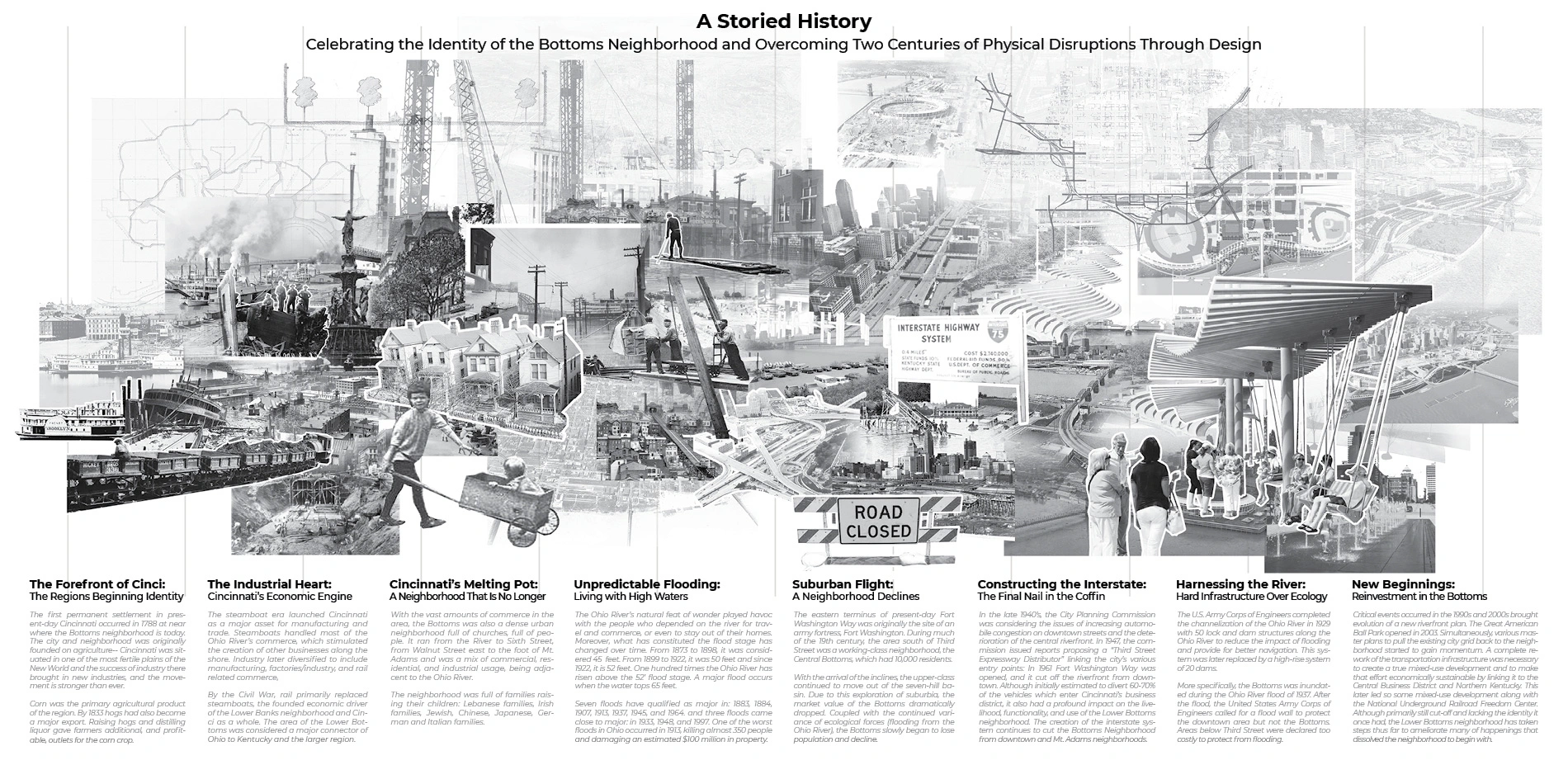 "The CincyStitch" is a multidisciplinary project that repositions a pivotal stretch of Cincinnati's waterfront not as the city's edge, but as the center of a connected region, allowing people to have a place to live, work, and play. Through four threads—Culture and History, Public Realm, Transportation/Infrastructure, and New Economies, the proposal strategically links and develops a formally vacant downtown site to create connections and break down barriers across geography, time, demographics, and perception. To work on a project with a complex site condition, it requires a team with diverse backgrounds. We assembled a team of students from both Harvard GSD and MIT, across four academic departments, including landscape, architecture, planning, and finance. The project displays landscape architecture strategies of a highly-active public realm for all Cincinnatians, sustainable and well-integrated green infrastructure design solutions for new development, equitable site design, multi-modal transportation prioritization, and diverse and dynamic recreational opportunities that all have a monumental impact on city/building design and can, with collaboration, be well-funded and prioritized in phasing.