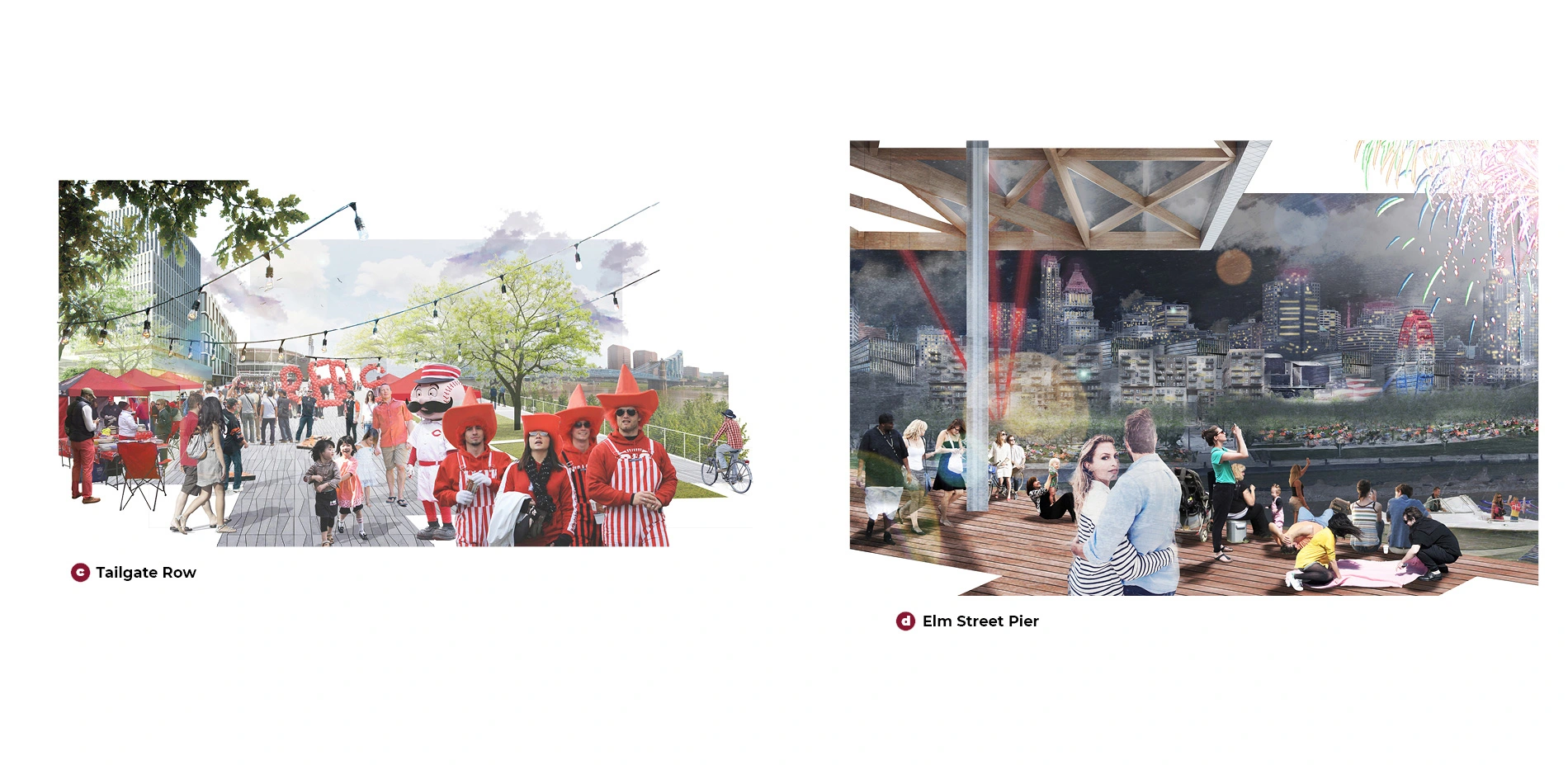 Perpendicular to the Walnut Street corridor, the proposal creates an entertainment district called Tailgate Row. Tailgate Row connects both stadiums with year-round programming for tailgates, parades, and outdoor concerts, and is elevated with sweeping views to the river. It largely serves as an entertainment and athletic hub lined with bars, restaurants, a sports museum, community center, and the riverfront music venue.