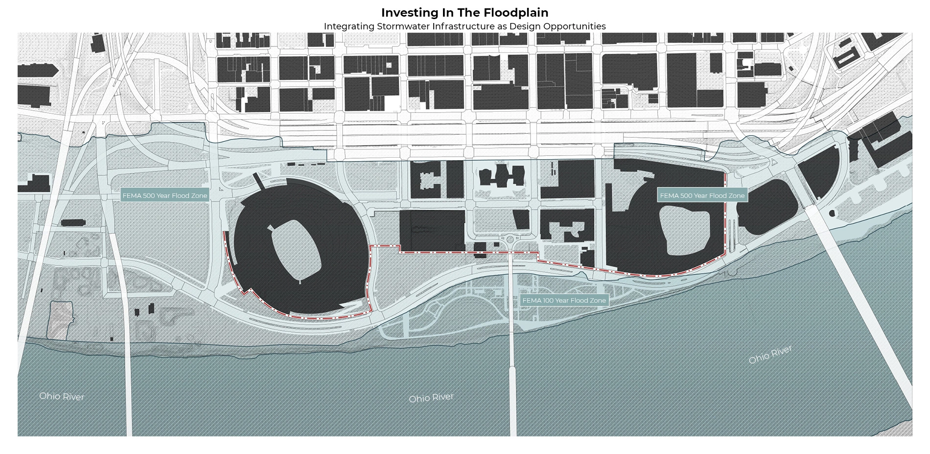 A joint project of four disciplines and two universities, this ambitious plan for the waterfront in Cincinnati lays out a vision of stitching back into the city the underutilized but historically significant neighborhoods adjacent to the downtown core. Employing principles and strategies from landscape architecture, architecture, planning, and finance, the collaborative team has laid out a comprehensive approach that reinterprets existing infrastructure and applies the highest principles of sustainability to the challenges of building in the floodplain of the Ohio River. This plan is designed to encourage both economic and environmental resilience and to reactivate a vital part of the public realm, and also serves as a celebration of the city’s culture and character, both past and future.