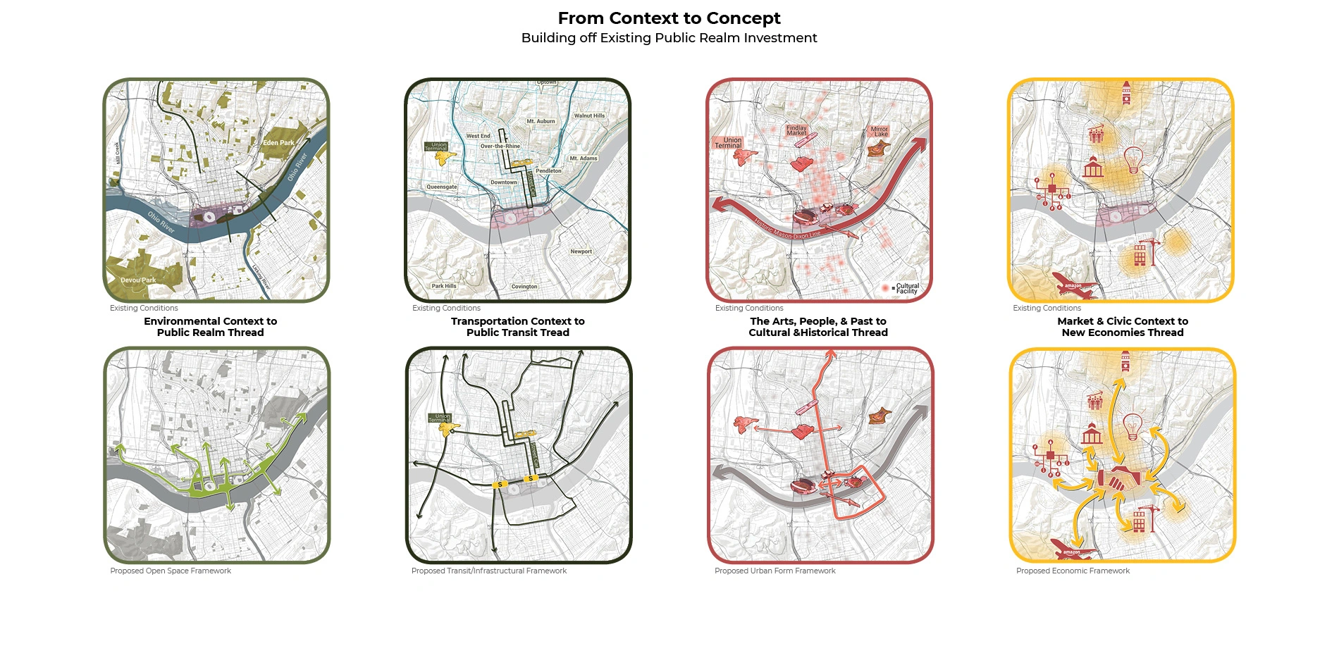 Each thread involved extensive collaboration across landscape architecture, architecture, urban design/planning, and finance disciplines to weave together the region's past and future. The Culture and History Thread is a symbolic and physical Cultural Trail that stretches north into Downtown and south across the Mason-Dixon Line, reinforcing connections with Kentucky and dismantling historical divisions. The Public Realm Thread builds on existing park assets and introduces new innovative spaces that connect nodes within the city and along the river through strategic corridors. The Transportation Thread seeks to solve the region's 'Achilles' Heel' by providing key infrastructure to create the region's first transit-oriented development and incentivize future investments. The New Economies Thread provides a platform for economic resilience, future-proofing the regional industrial base. Together these elements create a deeply sustainable and unequivocally human-centric framework for a new model of inclusive urban living for the greater region.