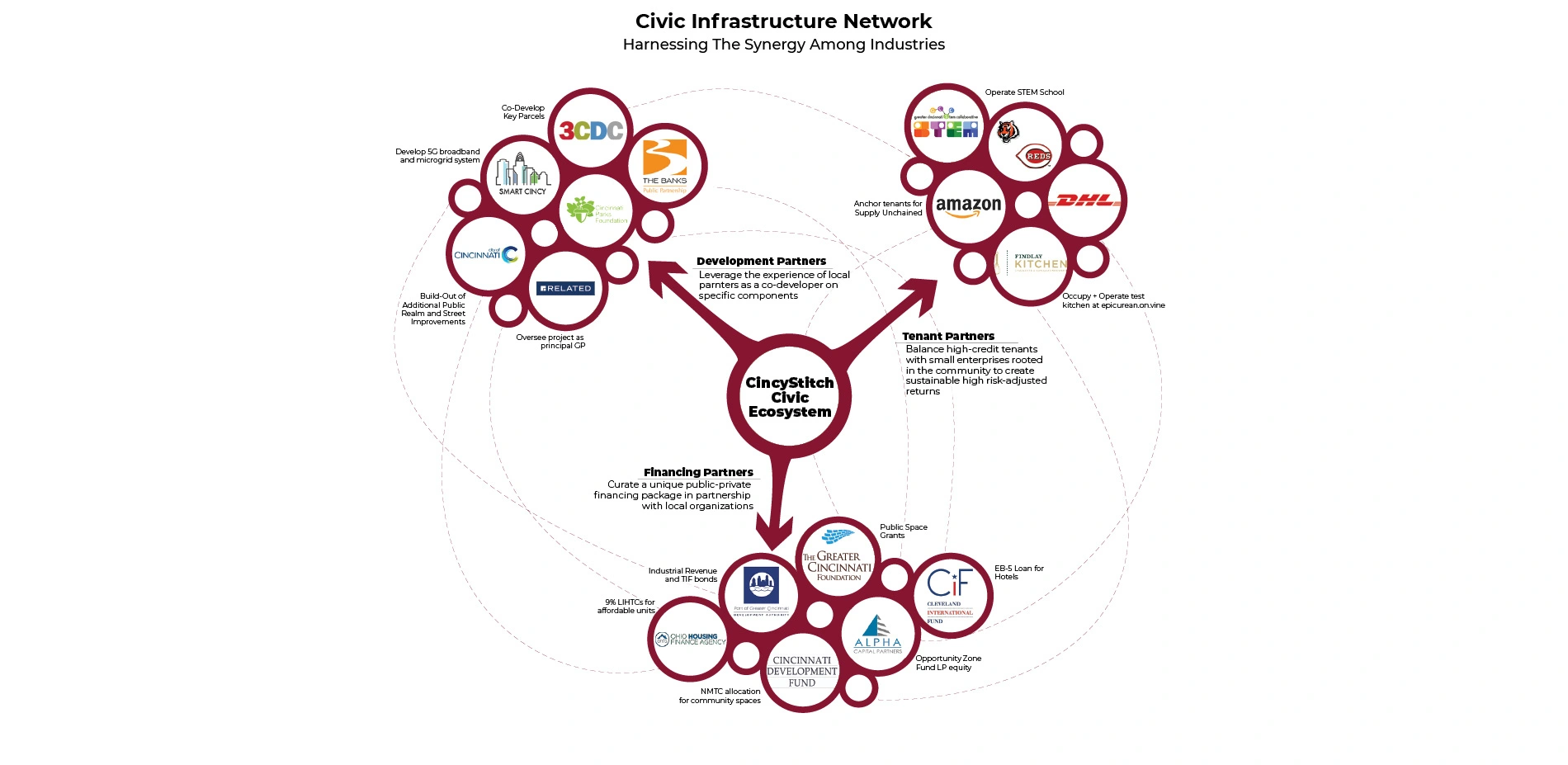 The ideas around technology, sustainability, and innovative construction are manifested not only in our design, but also in our financial and market analysis. From a financial perspective, when designing the CincyStitch, there needed to be a unique mix of buildings that would stitch together the city along our themes of Culture + History and New Economies. At the same time, creating this mix of building uses leveraged and supported costly Public Realm and Transportation interventions required to make the project successful at the urban scale.