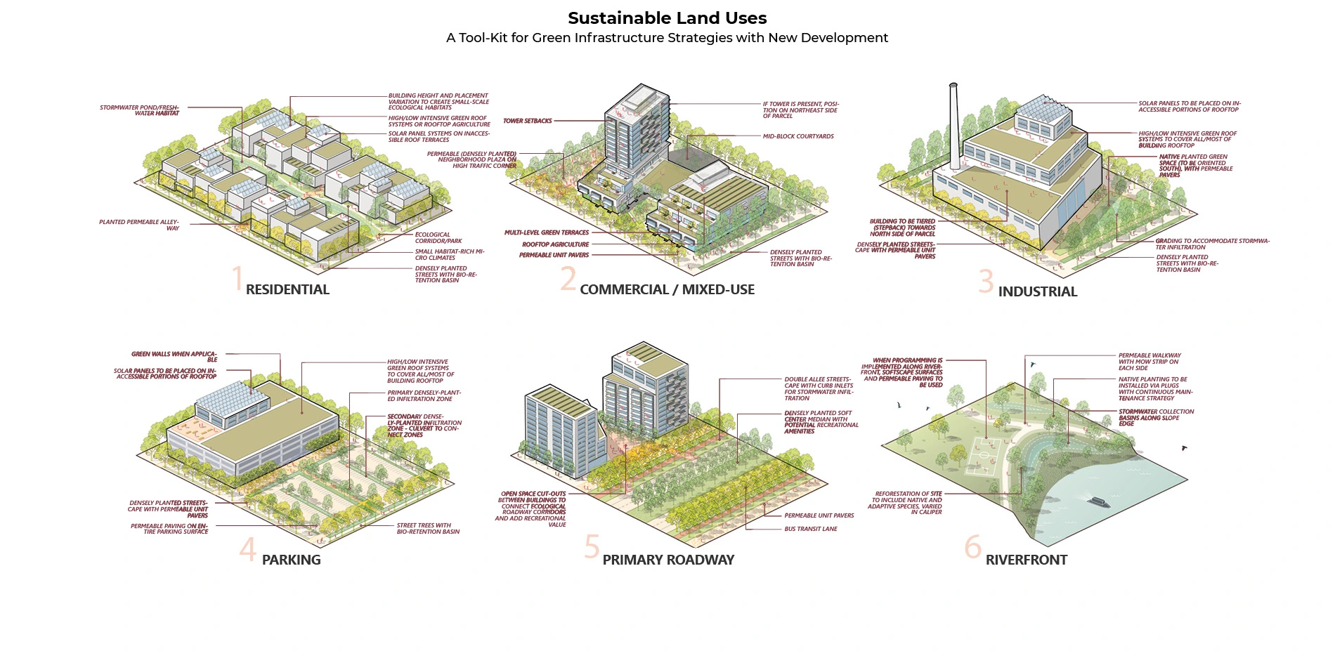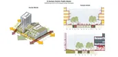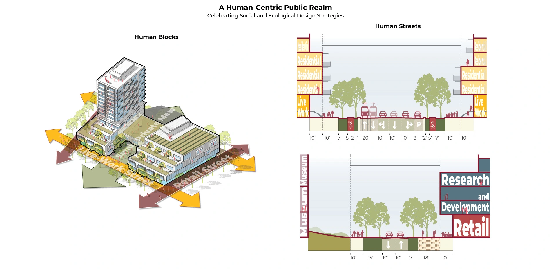 From and planning and design standpoint, the design challenges the traditional developer block-type, reinterpreting a block to provide additional open spaces (through mid-block courtyards, multi-level porches, and private balconies) and a better functioning ecological purpose (through tower setbacks, green roofs and rooftop agriculture, permeable surfacing, and open space). By doing so, the proposal looks at encouraging active ground-level building uses, ultimately creating a more active and vibrant public realm. Furthermore, the streetscape design prioritizes bike, bus, and pedestrian traffic and looks towards future transportation models that are less car dependent. By working in an interdisciplinary fashion, we were able to negotiate, advocate for, and continually rework all components of a block, (the building, public realm, funding and phasing strategies, etc.) so that one element did not dictate the other, but instead, all came together to illustrate the guiding principles we established.