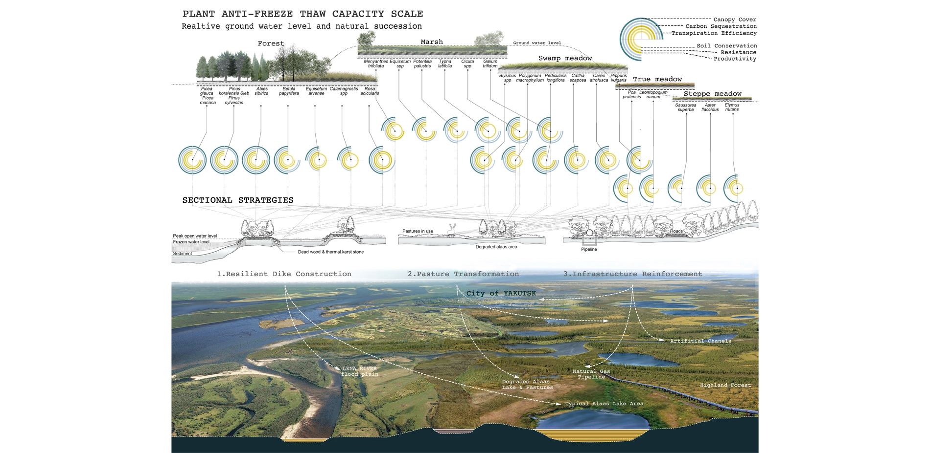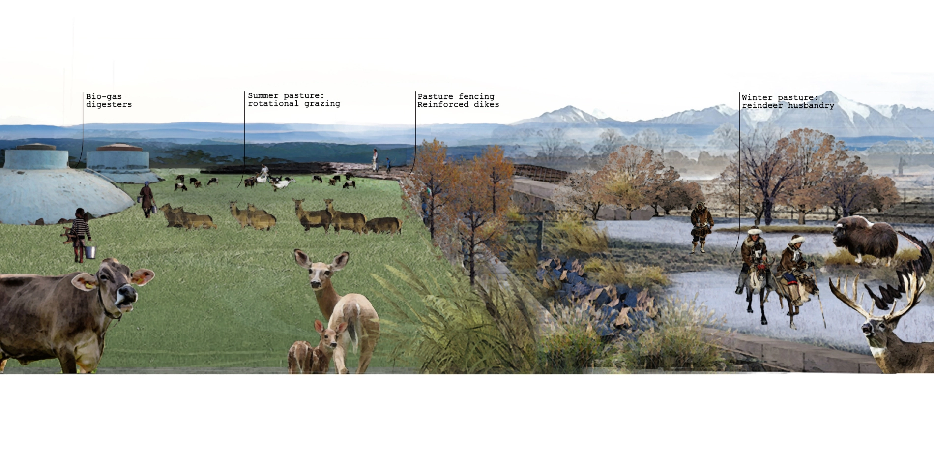 This project confronts the rapidly accelerating degradation of permafrost in the Eastern Siberian Plateau, the effects of which have disrupted traditional economies and cultures and caused widespread flooding in forests and pastures. Fundamentally optimistic in its approach, this plan presents a creative and comprehensive model of resilience and adaptation that can help local communities that have existed for thousands of years survive and thrive in a world altered by climate change. It spells out ways that the restoration of productive landscapes and the careful selection of plant communities can create oases in pastures and along infrastructure corridors, which along with the construction of resilient dikes, can help break the destructive freeze and thaw cycles that threaten the region—and the planet.