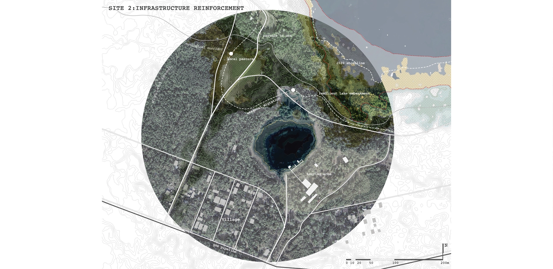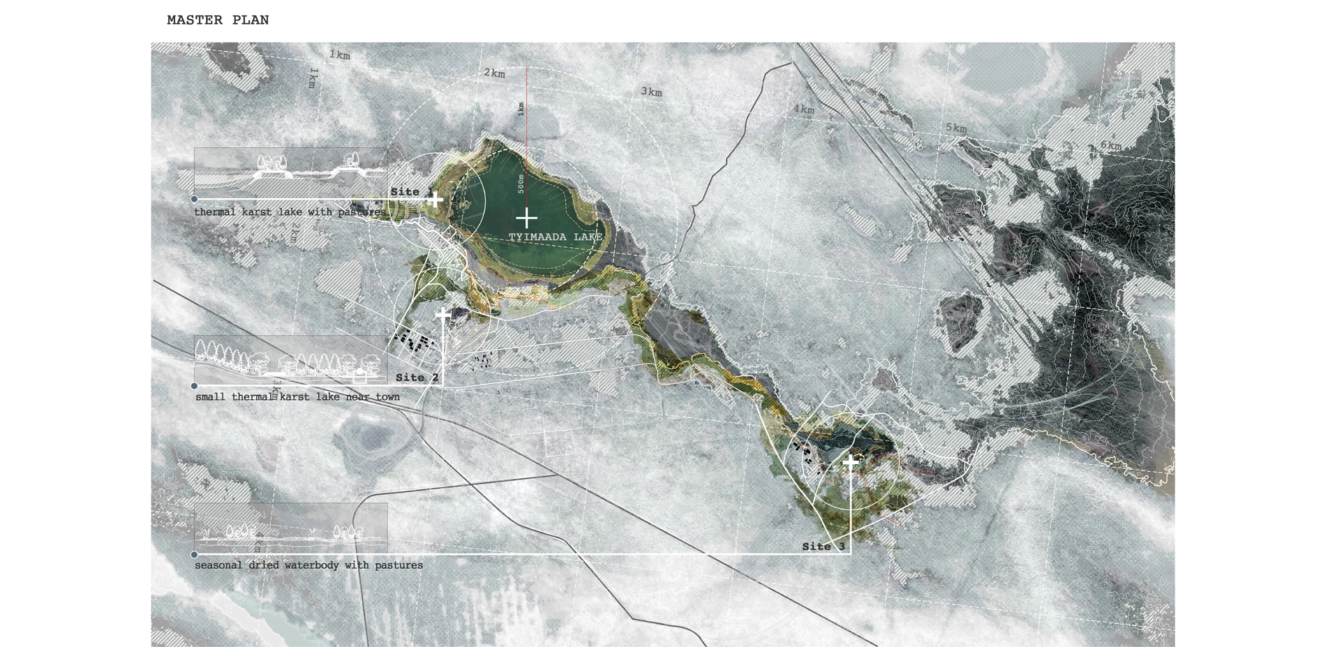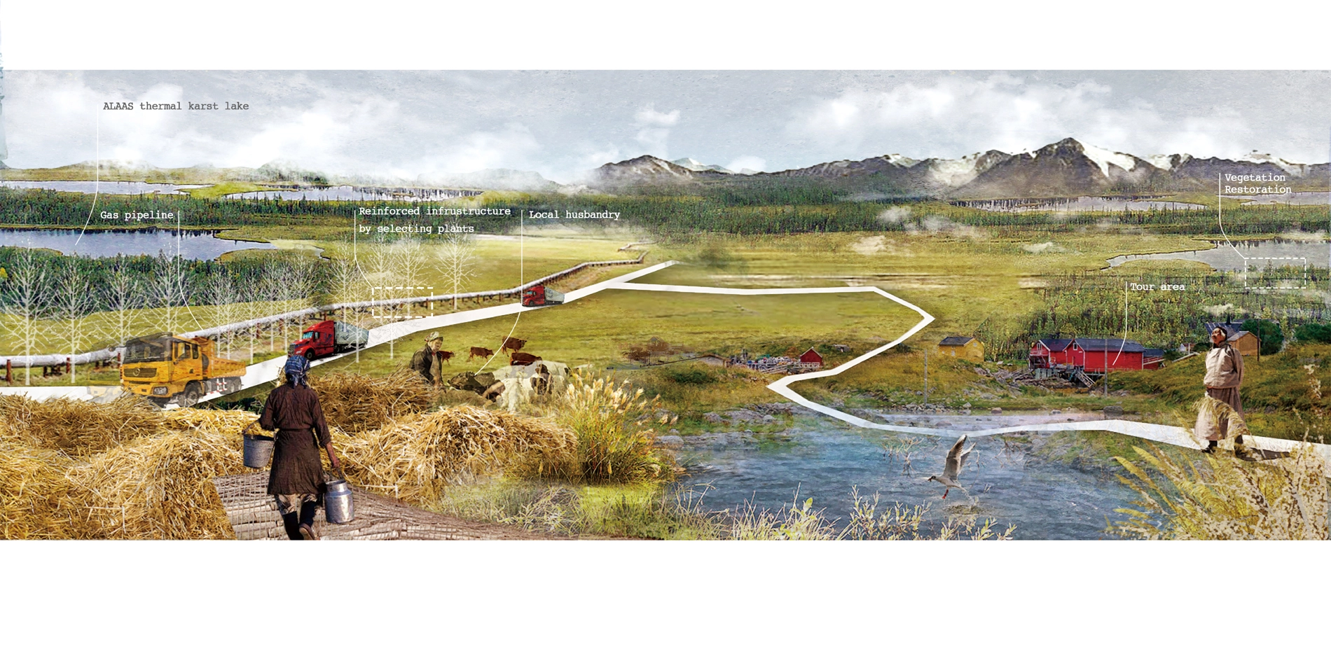 The project recognizes and takes advantage of the short-term positive impact of climate change on the ALAAS thermal karst lake region while focusing on the sustainable development of the more resilient civilization. It focuses on the changing mechanism of permafrost ecosystems and the mechanism of plant community degradation succession. By optimizing plant community allocation, planning semi-natural areas, and constructing elastic ecological facilities, the project maximizes water and soil properties and make the region strive in permafrost, increases the vitality of flexible regulation and healthy growth facing permafrost degradation. Landscape interventions were taken as critical opportunities to resolve regional contradictions and translate global macro-related issues into small-scale interventions with ecological, social, and economic resilience potential, and gradually build an ALAAS oasis for the region. This comprehensive proposal provides an updated opportunity for the region that once lived in the permafrost region to face both ecological and civil degradation through a landscape-based framework to rebuild confidence in the land of degraded permafrost.