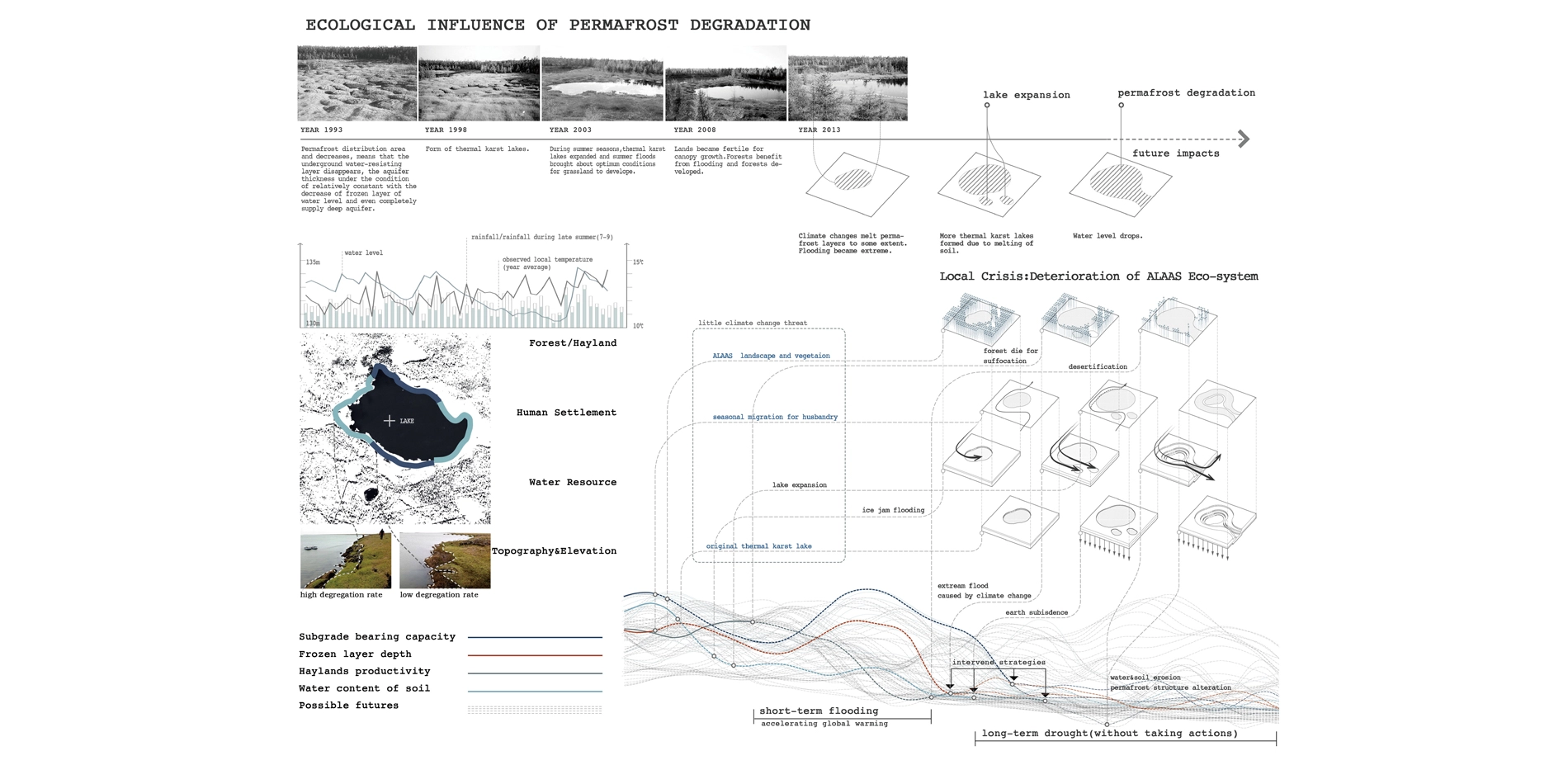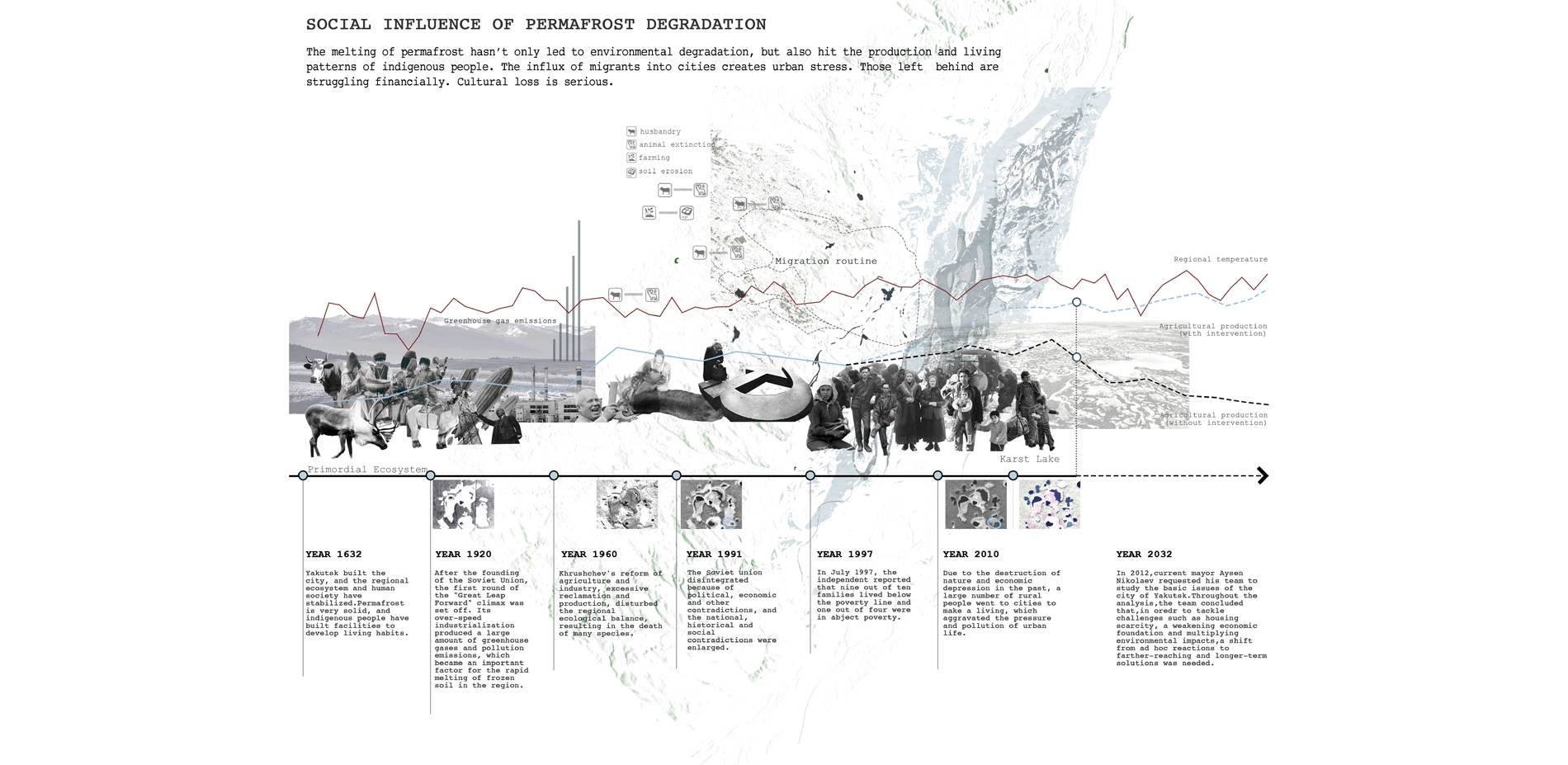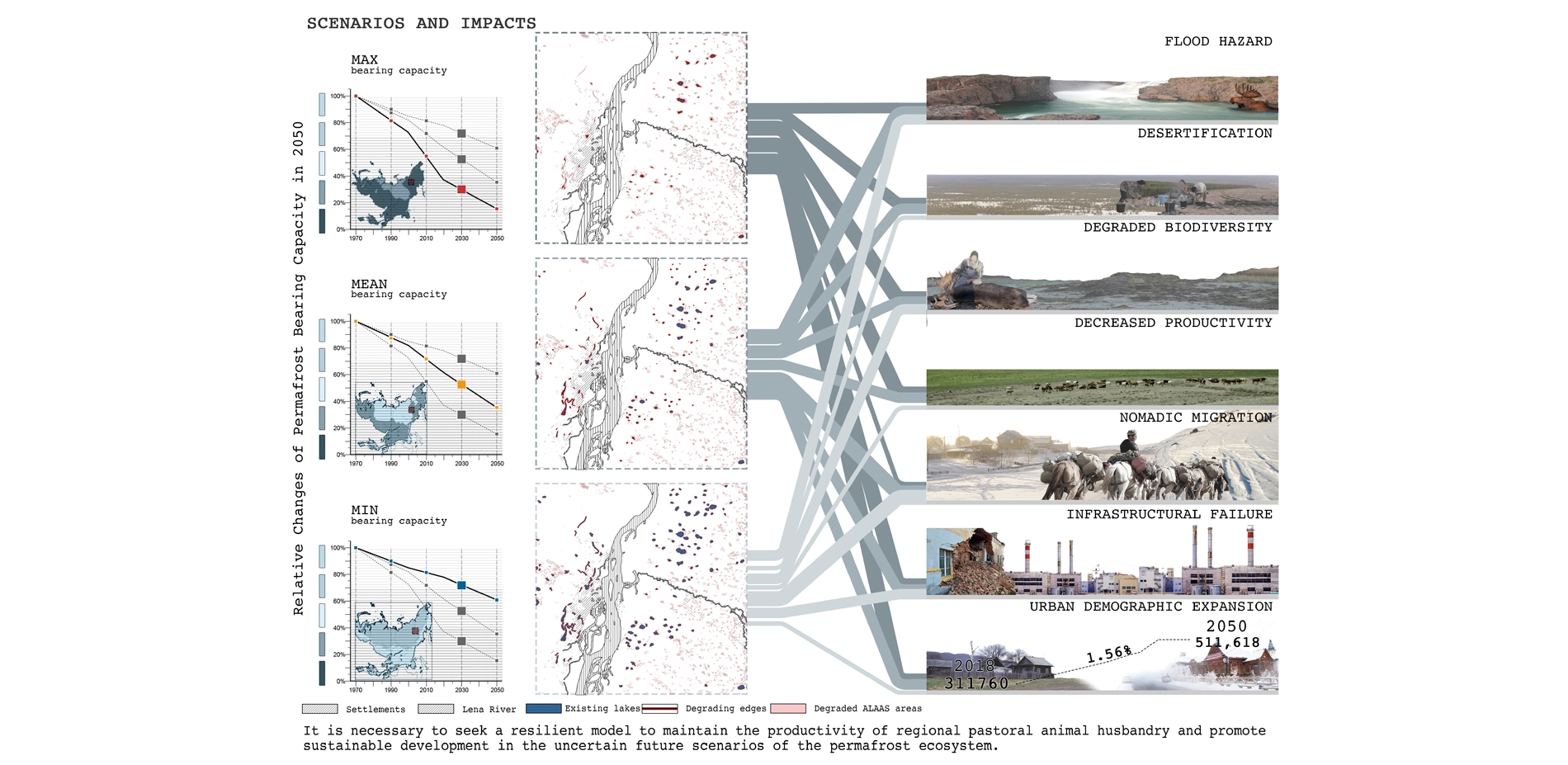 The Lena River flood plain, the unique thermal karst lakes, coniferous forests, and frigid meadows constitute the ALAAS landscape system ("meadow in the forest" in the Sakha language). Due to the permafrost degradation, the thermal karst lakes have experienced short-term rapid expansion, causing floods in forests and pastures. Without intervention, the deteriorating permafrost structures would exacerbate the loss of soil and water resources in the region and results in a low-productivity desert ecosystem. The current degradation of permafrost has threatened traditional production methods and settlement culture. The rural Yakuts, who depended on animal husbandry for generations lose their economic base and immigrate into the Yakutsk metropolitan, where the housing and infrastructure stability are also threatened by permafrost degradation. The entire region is facing increasing population pressure and social unrest.