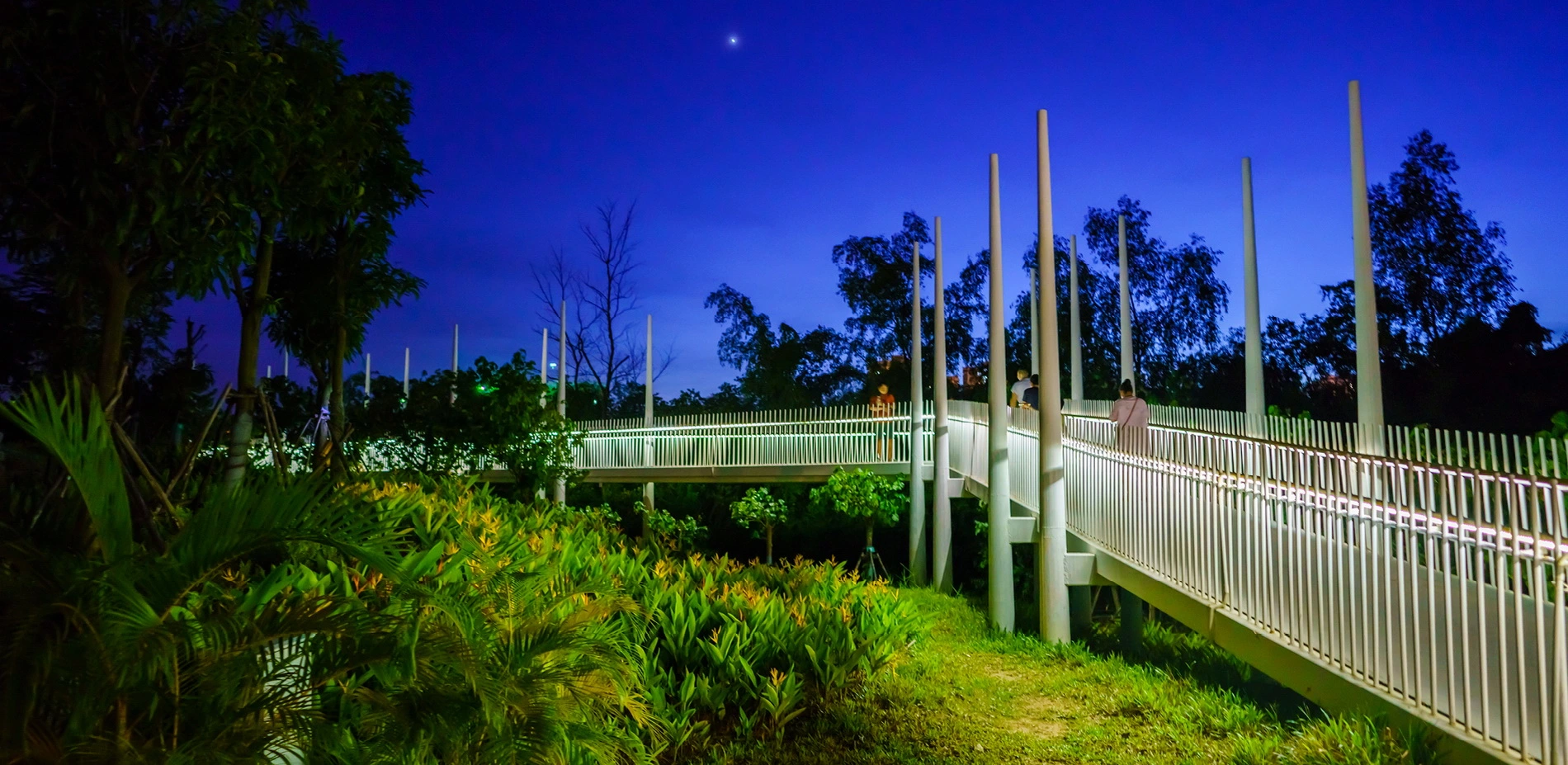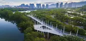 The waterways on China’s Hainan Island have proven to be vulnerable to flooding, but a new landscape within the Sanya River restores previously decimated mangroves that alleviate some of that risk while serving as a lush pedestrian recreation zone within high-rise city. Developers had left behind concrete retaining walls and polluted waterways, but now a thriving ecotone welcomes ocean tides with a porous edge condition that supports new mangrove growth. Terraced landscapes and elevated pathways bring visitors from the city down to water level, and storm-resistant concrete pavilions offer protection from overhead sun and tropical rain. The mangrove rehabilitation serves as a case study of strategies to return parts of cities to nature.