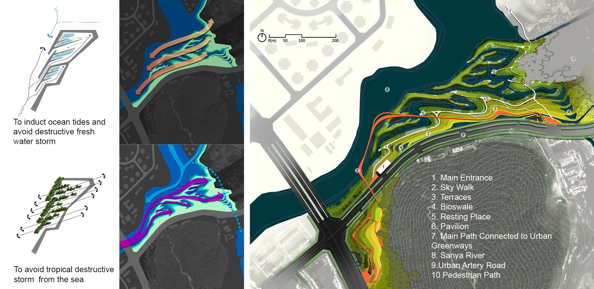 1. Site Challenges and Objectives Three decades of ruthless development has left Sanya,a tropical tourist city in China’s Hainan Island, a mess of destruction in terms of landscape. Almost all waterways in the developed districts have been polluted and filled with garbage. Concrete flood walls were built to claim land for development that killed the mangroves, wiped out the riparian habitats, and blocked tides from the sea and storm water from the upper land causing urban inundation and reducing the resiliency against climate change. Meanwhile, increased population, particularly seasonal tourists and immigrants are demanding more connected parks along the rivers, which were sadly inaccessible. In 2015, the city government decided to make dramatic changes, and the landscape architect was called upon to design this demonstration project: Sanya Mangrove Park. The method tested in this experimental project will be implemented in other mangrove rehabilitation projects at large scale throughout the region. The site is 10 hectares (2.471 acres) in size, on the east bank of Sanya River that bears the name of the city itself, and in the central area of the city. Analysis shows that the site is also critical in terms of ecological relationships between the sea and inland, where the daily sea tides meet with the fresh water of the river. Typical of the city, the water is polluted due to the urban runoffs. High concrete walls have enclosed the site that is filled with urban debris for a new development project that has been stopped by the government. An artery road runs by, and there is a 9 meter steep drop from the road to the water, challenging public access to the water. The design objectives are to rehabilitate the mangroves and make the site a park showcase for citywide urban renewal and ecological recovery. Several site challenges have to be addressed: (1) Wind--the strong annual tropical monsoon storms may harm the process of mangrove rehabilitation and destroy the fledging mangrove planting; (2) Water-- the upper stream floods from the monsoon storm water may wash away the young mangrove community; (3) Pollution: The polluted urban runoffs may damage sensitive mangrove seedlings and the biodiversity of the mangrove community; (4) Access: public accessibility and natural restoration need to be well integrated. 2. Design Strategies:Form follows processes In addressing the above site challenges and to achieve the project objectives, the following design strategies were taken: (1)Balanced earth work and recycling of materials: the land fill composed of urban construction debris and concrete materials from the demolition of the flood wall are recycled on site, and by means of cut-and-fill, ecotones of water ways and riparian habitats of various elevations are created for diverse fauna and flora, particularly different species of mangroves; (2) Inter-locked fingers: a land form of inter-locked fingers was designed to lead ocean tides into the park. This is necessary for the mangroves, but they must at the same time avoid annual strong tropical storms from the sea and the storm water flood and pollution from the upper stream mountain and urban area that may harm the establishment process of the mangrove community. This also maximizes the edge effects (water edge length increases 6 times from 700 meters to over 4000 meters) and habitat diversity with water depth varies from 0 to 1.5 meters, and creates a dynamic aquatic environment following the rise and fall of tides, which are necessary for some aquatic species. (3) Terraces and bio-swales: Making use of the 9-meter drop from the urban road to the water level, terraces are integrated with bio-swales to catch and filtrate the stormwater from the urban pavement and road, creating public spaces at different elevations. (4) Adaptive design of pavilions and access: a network of pedestrian passageways follow the landform. A skywalk is designed as a ramp to create an experience of walking above the mangrove canopy; five pavilions are strategically allocated allow visitors to enjoy the tranquility and beauty within the mangroves, as well as providing necessary shelter and shading in the changeable local weather. The modulated concrete shelters are designed to resist strong tropical storms; they open to views from various angles. The twisted pavilions make good shelters for bird watching. 3. Conclusion This project is a great success. Just three years after its construction, its objectives have been fulfilled. The mangroves within the interlocked fingers have established well. Along with the flourishing mangroves, fish and birds are abundant, attracting visitors of different ages. The park has become a daily recreational place for the local communities, and a showcase of ecological restoration that not only benefits the natural environment, but the public welfare. The approach tested in this experimental project has been implemented in other mangrove rehabilitation projects at large scale throughout the region.