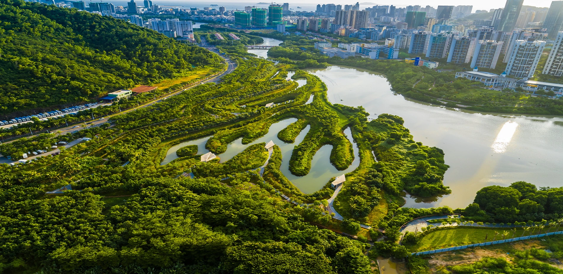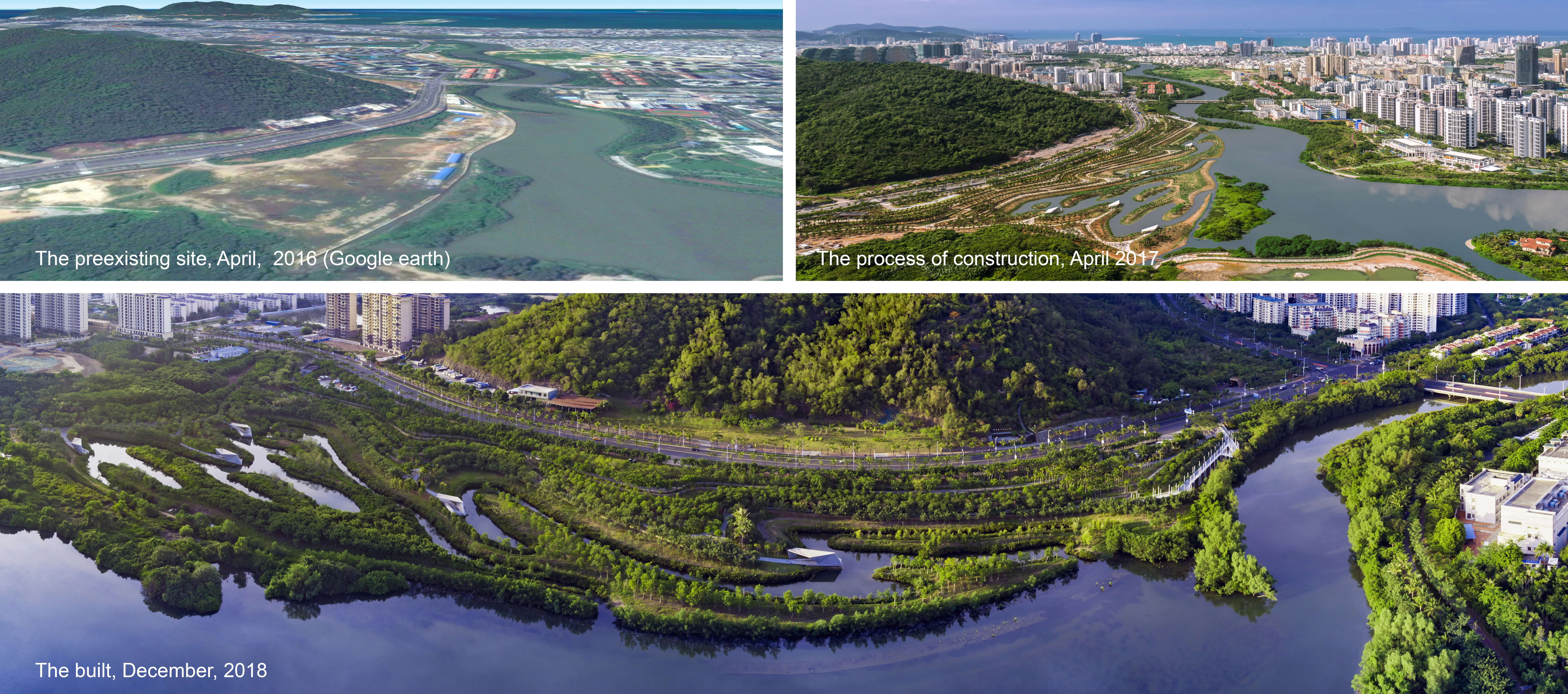 As an action of mitigating urban flood risk caused by climate change, the restoration of mangrove along the waterways and coastal shorelines are critical for the tropical city Sanya in China’s Hainan Island. One of the key challenges is to find an efficient and inexpensive method to restore the mangrove habitat extensively that have been destroyed in the past decades due to rapid urban development. Right in the middle of the city and in just three years, an area of lifeless land fill within a concrete flood wall has been successfully restored into a lush mangrove park, where nature and people harmoniously share the meeting of ocean tides and fresh water. The project demonstrates the success of the design strategy based on the ecological processes of wind and water, which produces a designed ecotone made of inter-locked fingers to speed up the natural process of mangrove rehabilitation. Such a mangrove rehabilitation method had been implemented at a large scale efficiently.