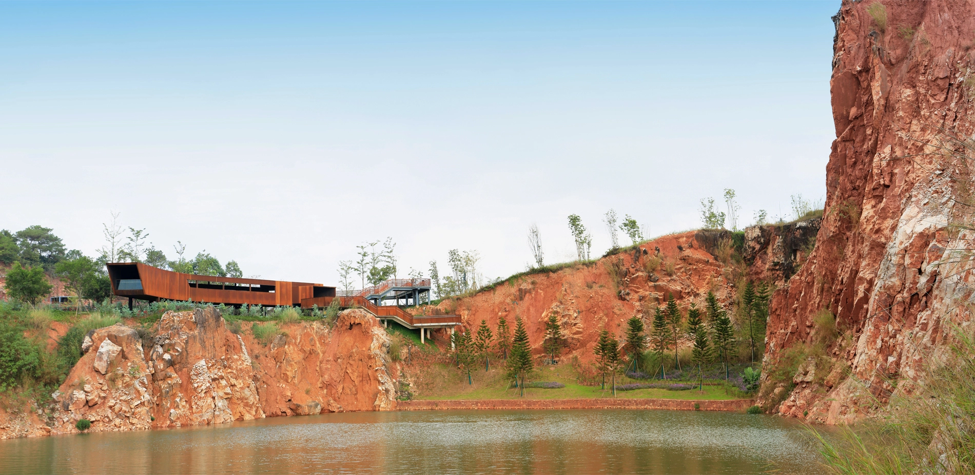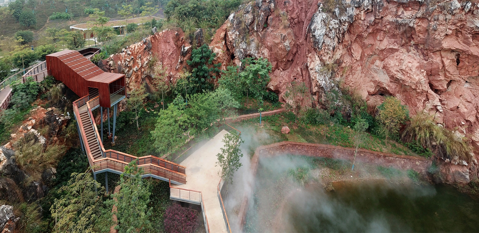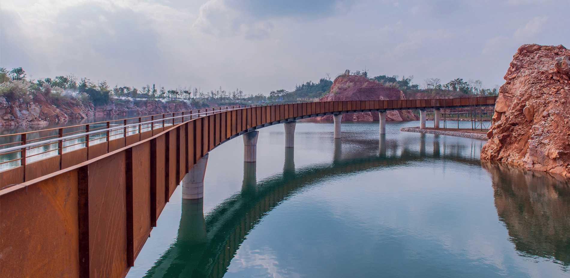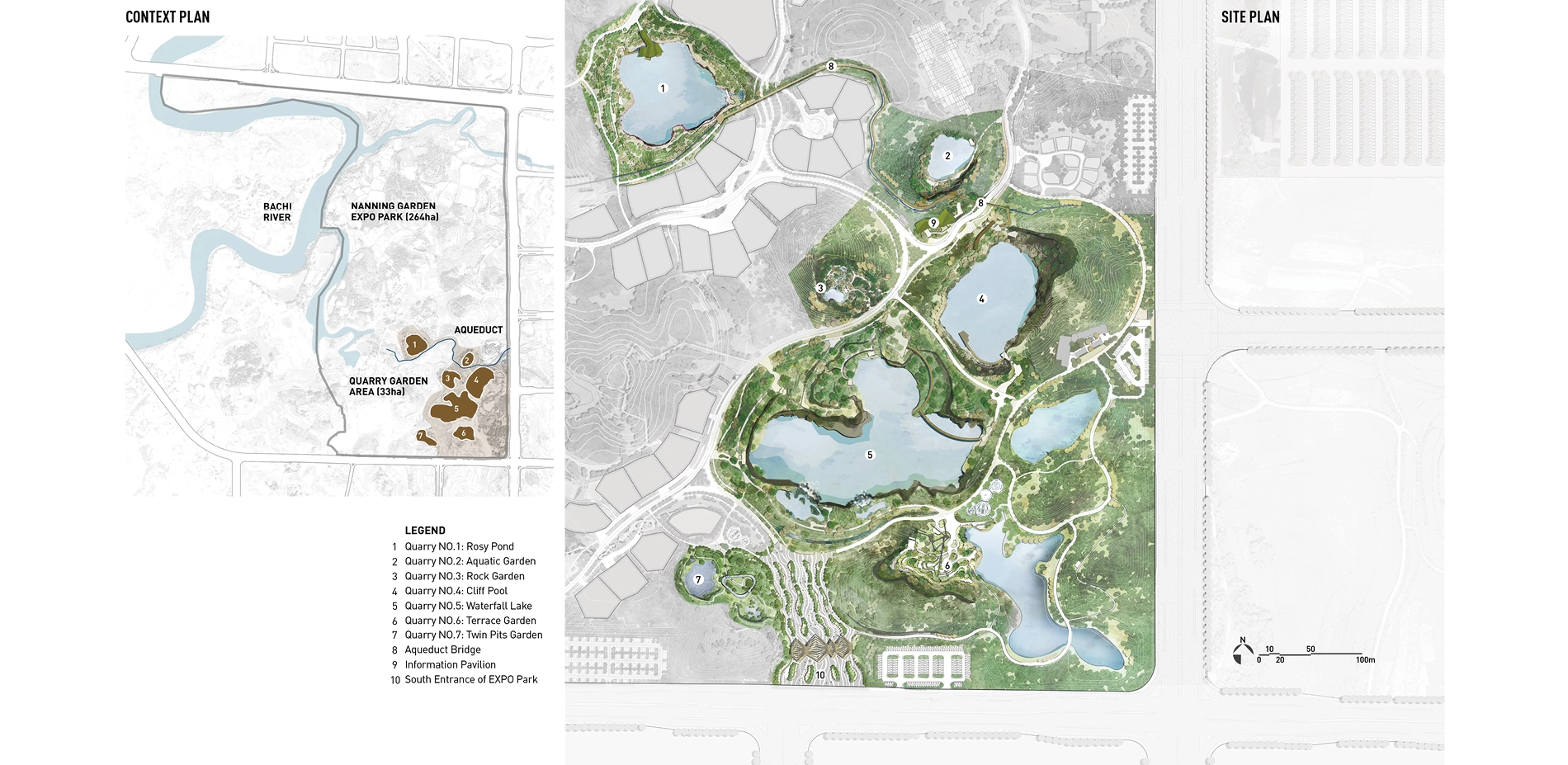 Context 2018 China International Garden Expo was held in Nanning, positioned along a river in the city’s hilly outskirts. Interspersed in the southeast section of the site is a series of quarries. The organizing committee hoped to transform seven of the relatively intact quarries into distinctive gardens displaying in the garden expo. Site The site covers an area of about 33 hectares. Several years had passed since mining at some of the quarries onsite ceased, yet two of the quarries persisted mining activities until the city won the expo bid. These quarries suffered blasting during the mining that caused fragmented surfaces and rugged landforms at pit bottom. The site was strewn with dilapidated hills, towering cliffs, deserted land surfaces, bottomless ponds, piles of abandoned soil and gravel, rusty quarrying equipment, etc. Challenges 1. The quarries presented extremely complex landforms that imposed design challenges in accordance to current mapping images. 2. Water levels in the quarries were unstable. In fact, two of the quarries that stopped mining later showed sustained rising water levels. Very limited valid hydrological data were available. 3. The geological conditions of the quarries were complex and the cliffs were dilapidated. The possibility of collapse and rock fall present unpredictable safety risks. 4. The quarries’ ecological environment was severely damaged and the restoration of vegetation was faced with great challenges. Design Strategies Through an aerial scanning of UAV, landscape architects obtained three-dimensional digital models of all quarries, on this basis the design could well match the site landforms. To provide relevant data required for the design, a local institution was assigned to record changes in the water levels of each quarry every half month. With safety as primary consideration, the setting of facilities and various paths intentionally avoid dangerous zones, while highlighting distinctive features of the quarry landscape. Moreover, safety measures were strictly implemented where necessary to prevent cliff-slide rock falls. According to the different goals of vegetation restoration, soil was introduced to earth up planting areas forming different soil thicknesses to create conditions for habitat restoration of the particularly large number of native plant species. Stones, gravels, mucks, and mining machines on the site are reasonably preserved and reused in the new landscape. Although similar in appearance, the quarries vary from each other greatly in terms of scale, space structure, and characteristics. Landscape architects adopted various methods of intervention and vegetation restoration that complement each quarry’s distinctive qualities. Quarry No. 1 is a quiet pond walled within a rough rock hedge, in which China’s traditional landscape aesthetics is attempted to be embodied. A wooden and irregularly-shaped pavilion is nestled within a rock gap at the edge of a pond, whose structural form is inspired by the local vernacular architecture. It provides visitors with a panorama of green pond and encircling cliff, and babble waterfall on the diagonal opposite. To adapt to the unstable water levels, the pavilion floor is designed floated. A waterfront path links four platforms with varying elevations, offering people with all-round perspectives to enjoy the scenery. Quarry No. 2 is surrounded by cliffs on all sides. The quarry bottom is relatively flat and accumulates water perennially. The quarry is designed as an aquatic garden. The zigzag steel grating walkway winds through the planting zone and connects to a platform that further extends to a path above the cliff, accessed by several flights of steps. The section with the highest elevation features a closed wooden box, which is also an aerial viewing platform where people can appreciate a captivating view of the cliff and the entire garden expanse. Quarry No. 3 is bordered by the cliff on three sides and was designed as a delicate rock garden. The abandoned soil and gravel on site were utilized as the base of the garden’s subtle landform, with planting soil wrapping its surface. A moderately-sized terrace garden is designed near the main road, creating a unique desert plant landscape. The gentle-sloping section in the center consists of a dry garden, while the southern concave section showcases hygrophilous rock plants with water cascading into the lowest pond. Two platforms with different elevations are constructed at the edge of the concave area, where people can enjoy a charming view of the garden. Quarry No. 4 is a large pond embraced by cliffs, with green and clear water. Viewing platforms sit on both northern and southern sides of the quarry. The northern platform is a Corten steel corridor located at the quarry’s edge, unraveling a long strip window towards the quarry, where visitors can feast their eyes on the steep cliff towering over 40 meters above the water surface. At the southern end of the corridor, people can enjoy an overlooking view of the charming pond situated beneath and the waterfront platform on the opposite side, offering a thrilling and exciting experience. On the southern side of the quarry, a wedge-shaped platform stretches out from a gap among the rocks. It hangs above the waters and connects to the lower waterfront platform through a curved bridge. Through an earthing-up process, vegetation was restored around the quarry as well as the gentle slope inside, which revives the quarry garden meanwhile highlights the steepness of cliffs. Quarry No. 5 is the largest among the seven quarries, enclosed by dilapidated cliff with terraced rocks sitting at the bottom. The quarry has transformed into a lake, caused by the continuously-rising water level. Two areas with relatively shallow mining depths were earthed up above the water surface, and planted with trees such as pond cypress and Chinese cypress, creating an aquatic woods landscape. Bridges and walkways 