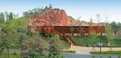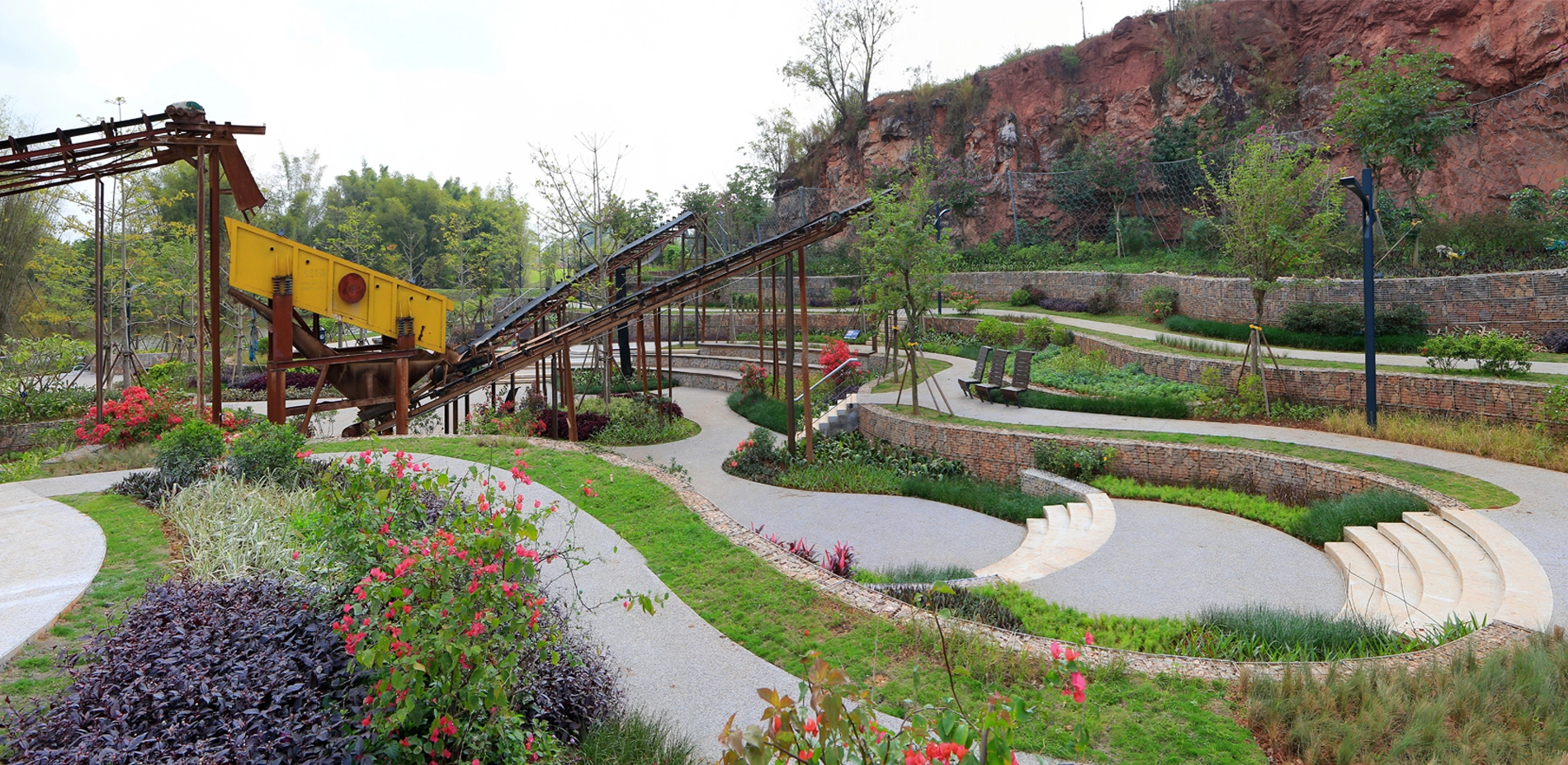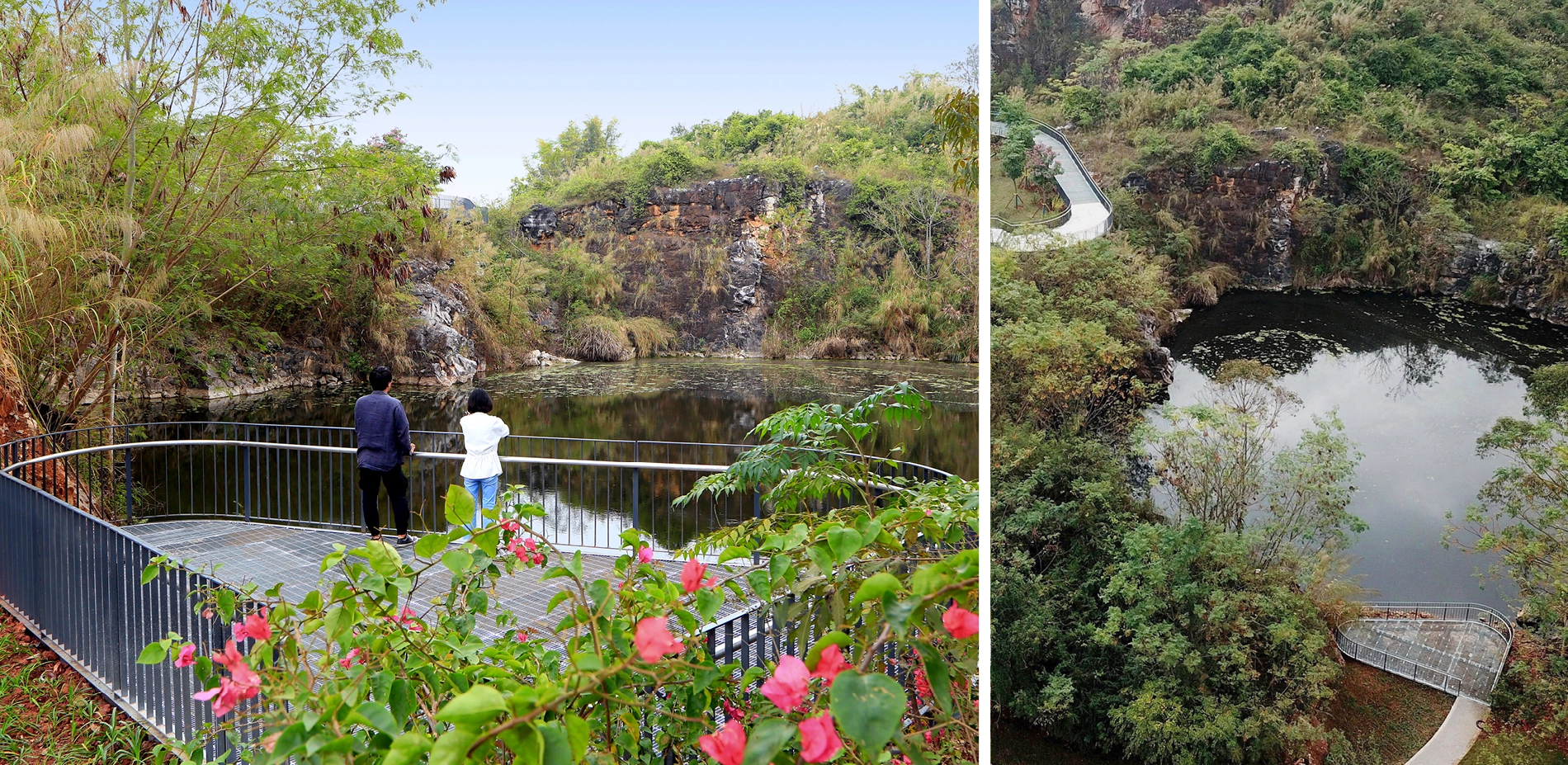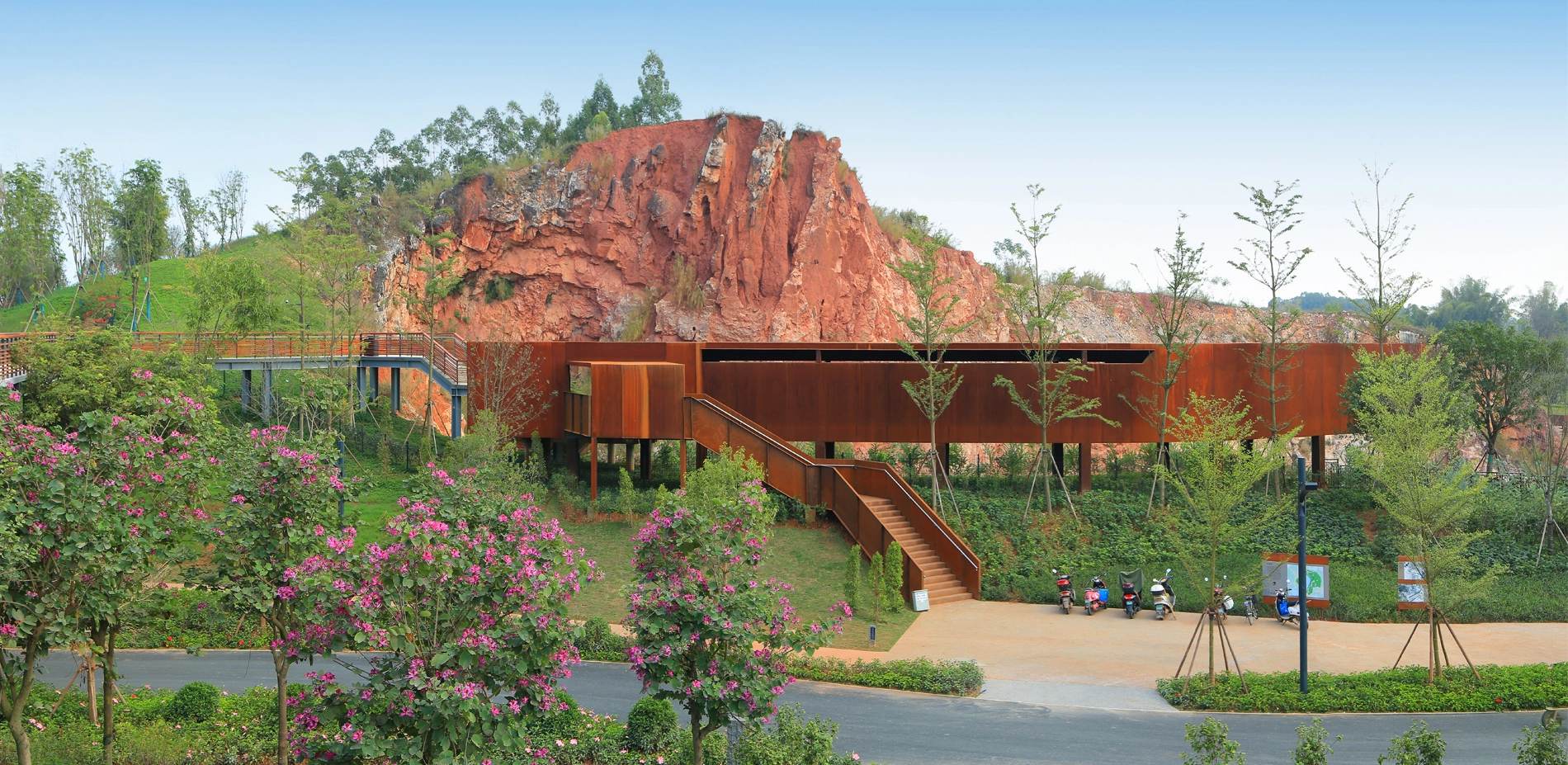 Context 2018 China International Garden Expo was held in Nanning, positioned along a river in the city’s hilly outskirts. Interspersed in the southeast section of the site is a series of quarries. The organizing committee hoped to transform seven of the relatively intact quarries into distinctive gardens displaying in the garden expo. Site The site covers an area of about 33 hectares. Several years had passed since mining at some of the quarries onsite ceased, yet two of the quarries persisted mining activities until the city won the expo bid. These quarries suffered blasting during the mining that caused fragmented surfaces and rugged landforms at pit bottom. The site was strewn with dilapidated hills, towering cliffs, deserted land surfaces, bottomless ponds, piles of abandoned soil and gravel, rusty quarrying equipment, etc. Challenges 1. The quarries presented extremely complex landforms that imposed design challenges in accordance to current mapping images. 2. Water levels in the quarries were unstable. In fact, two of the quarries that stopped mining later showed sustained rising water levels. Very limited valid hydrological data were available. 3. The geological conditions of the quarries were complex and the cliffs were dilapidated. The possibility of collapse and rock fall present unpredictable safety risks. 4. The quarries’ ecological environment was severely damaged and the restoration of vegetation was faced with great challenges. Design Strategies Through an aerial scanning of UAV, landscape architects obtained three-dimensional digital models of all quarries, on this basis the design could well match the site landforms. To provide relevant data required for the design, a local institution was assigned to record changes in the water levels of each quarry every half month. With safety as primary consideration, the setting of facilities and various paths intentionally avoid dangerous zones, while highlighting distinctive features of the quarry landscape. Moreover, safety measures were strictly implemented where necessary to prevent cliff-slide rock falls. According to the different goals of vegetation restoration, soil was introduced to earth up planting areas forming different soil thicknesses to create conditions for habitat restoration of the particularly large number of native plant species. Stones, gravels, mucks, and mining machines on the site are reasonably preserved and reused in the new landscape. Although similar in appearance, the quarries vary from each other greatly in terms of scale, space structure, and characteristics. Landscape architects adopted various methods of intervention and vegetation restoration that complement each quarry’s distinctive qualities. Quarry No. 1 is a quiet pond walled within a rough rock hedge, in which China’s traditional landscape aesthetics is attempted to be embodied. A wooden and irregularly-shaped pavilion is nestled within a rock gap at the edge of a pond, whose structural form is inspired by the local vernacular architecture. It provides visitors with a panorama of green pond and encircling cliff, and babble waterfall on the diagonal opposite. To adapt to the unstable water levels, the pavilion floor is designed floated. A waterfront path links four platforms with varying elevations, offering people with all-round perspectives to enjoy the scenery. Quarry No. 2 is surrounded by cliffs on all sides. The quarry bottom is relatively flat and accumulates water perennially. The quarry is designed as an aquatic garden. The zigzag steel grating walkway winds through the planting zone and connects to a platform that further extends to a path above the cliff, accessed by several flights of steps. The section with the highest elevation features a closed wooden box, which is also an aerial viewing platform where people can appreciate a captivating view of the cliff and the entire garden expanse. Quarry No. 3 is bordered by the cliff on three sides and was designed as a delicate rock garden. The abandoned soil and gravel on site were utilized as the base of the garden’s subtle landform, with planting soil wrapping its surface. A moderately-sized terrace garden is designed near the main road, creating a unique desert plant landscape. The gentle-sloping section in the center consists of a dry garden, while the southern concave section showcases hygrophilous rock plants with water cascading into the lowest pond. Two platforms with different elevations are constructed at the edge of the concave area, where people can enjoy a charming view of the garden. Quarry No. 4 is a large pond embraced by cliffs, with green and clear water. Viewing platforms sit on both northern and southern sides of the quarry. The northern platform is a Corten steel corridor located at the quarry’s edge, unraveling a long strip window towards the quarry, where visitors can feast their eyes on the steep cliff towering over 40 meters above the water surface. At the southern end of the corridor, people can enjoy an overlooking view of the charming pond situated beneath and the waterfront platform on the opposite side, offering a thrilling and exciting experience. On the southern side of the quarry, a wedge-shaped platform stretches out from a gap among the rocks. It hangs above the waters and connects to the lower waterfront platform through a curved bridge. Through an earthing-up process, vegetation was restored around the quarry as well as the gentle slope inside, which revives the quarry garden meanwhile highlights the steepness of cliffs. Quarry No. 5 is the largest among the seven quarries, enclosed by dilapidated cliff with terraced rocks sitting at the bottom. The quarry has transformed into a lake, caused by the continuously-rising water level. Two areas with relatively shallow mining depths were earthed up above the water surface, and planted with trees such as pond cypress and Chinese cypress, creating an aquatic woods landscape. Bridges and walkways 