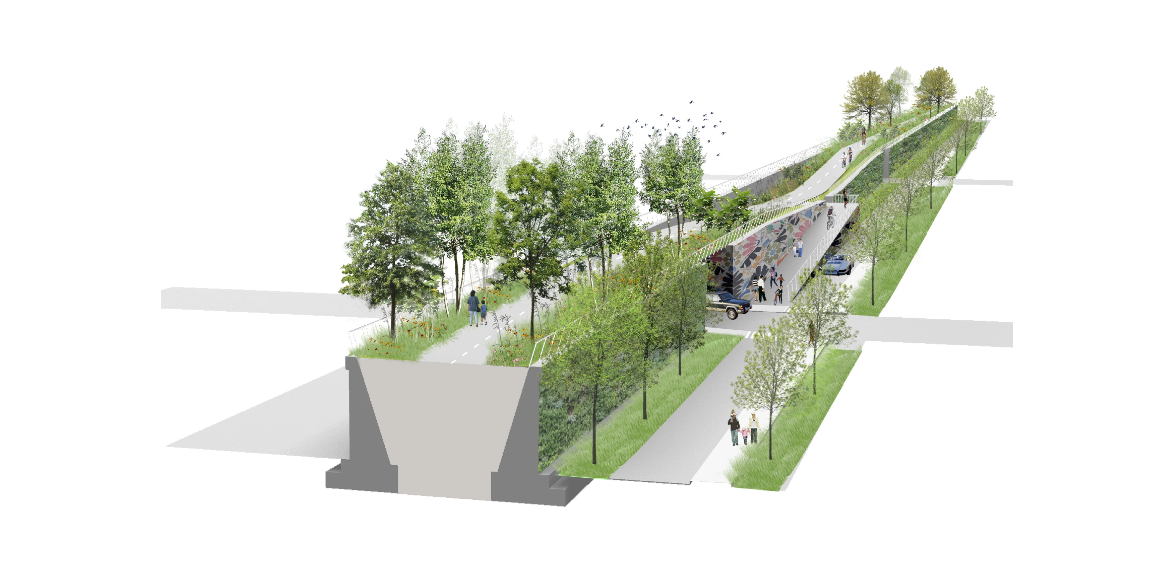 Many cities are rediscovering that their decommissioned railways retain utility as linear parks; proposed in the late 1990s as a possible bicycle trail, the 606 in Chicago replaces rail with a 2.7-mile planted promenade suitable for all manner of recreation. Accessible to some 80,000 residents drawn through four access parks within communities adjacent to the route, the 606 features a 14-foot pathway with dense native plantings along both sides that reflect various microclimates. Familiar parks department fixtures help to reinforce its recreational identity, and abundant ramps and stairways—key requests from constituents—shift perceptions of a formerly blighted piece of infrastructure from imposing to inviting.