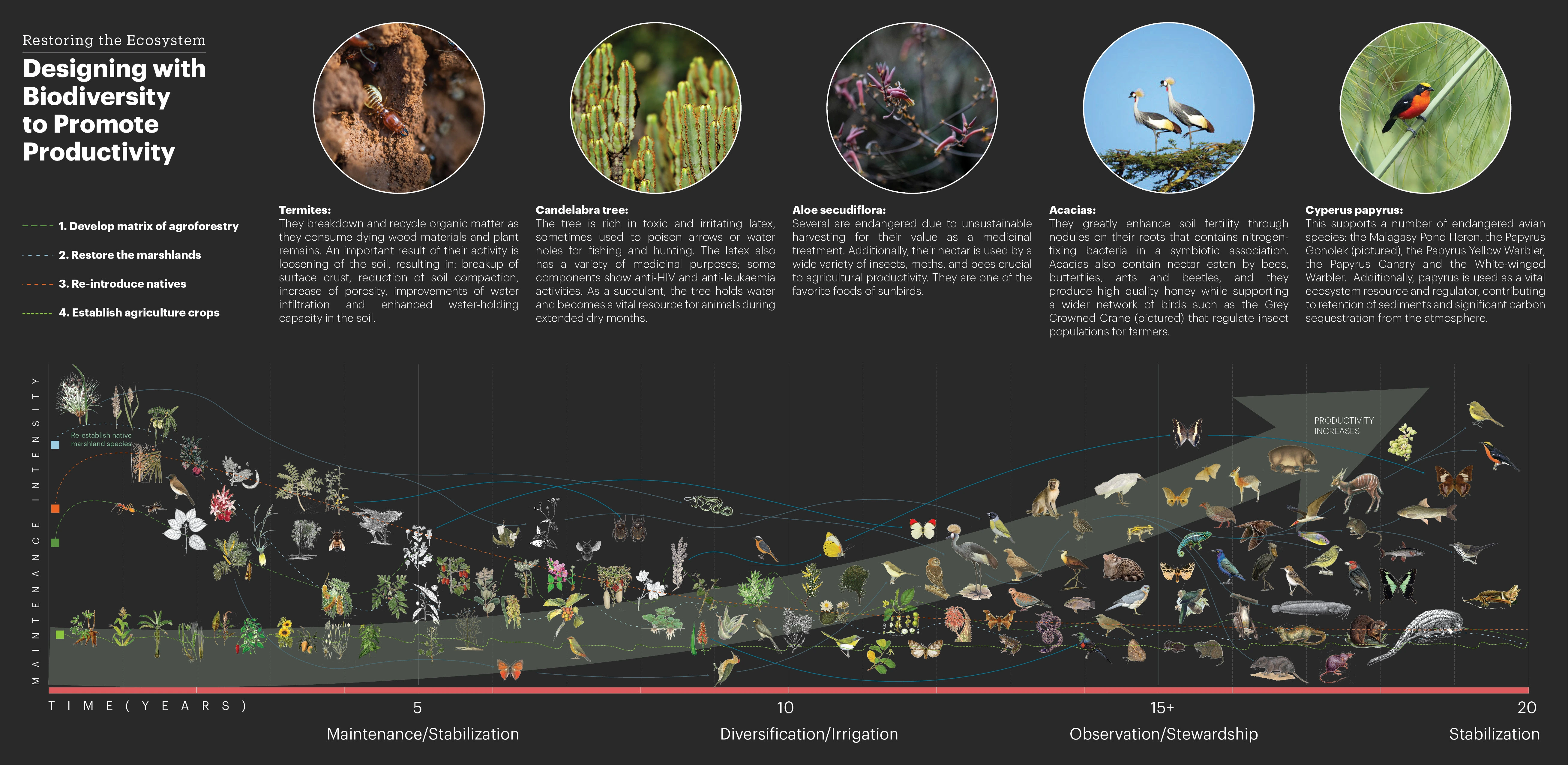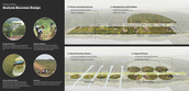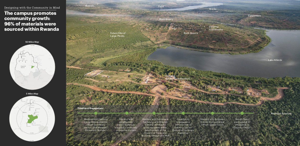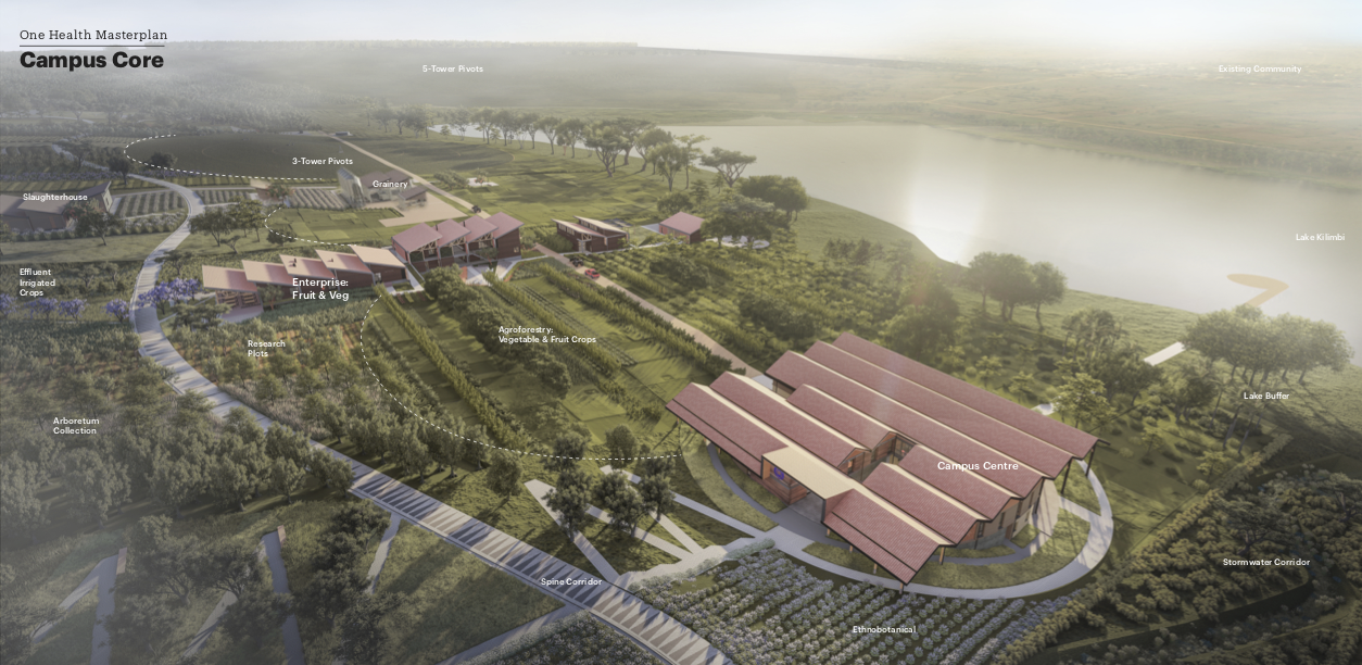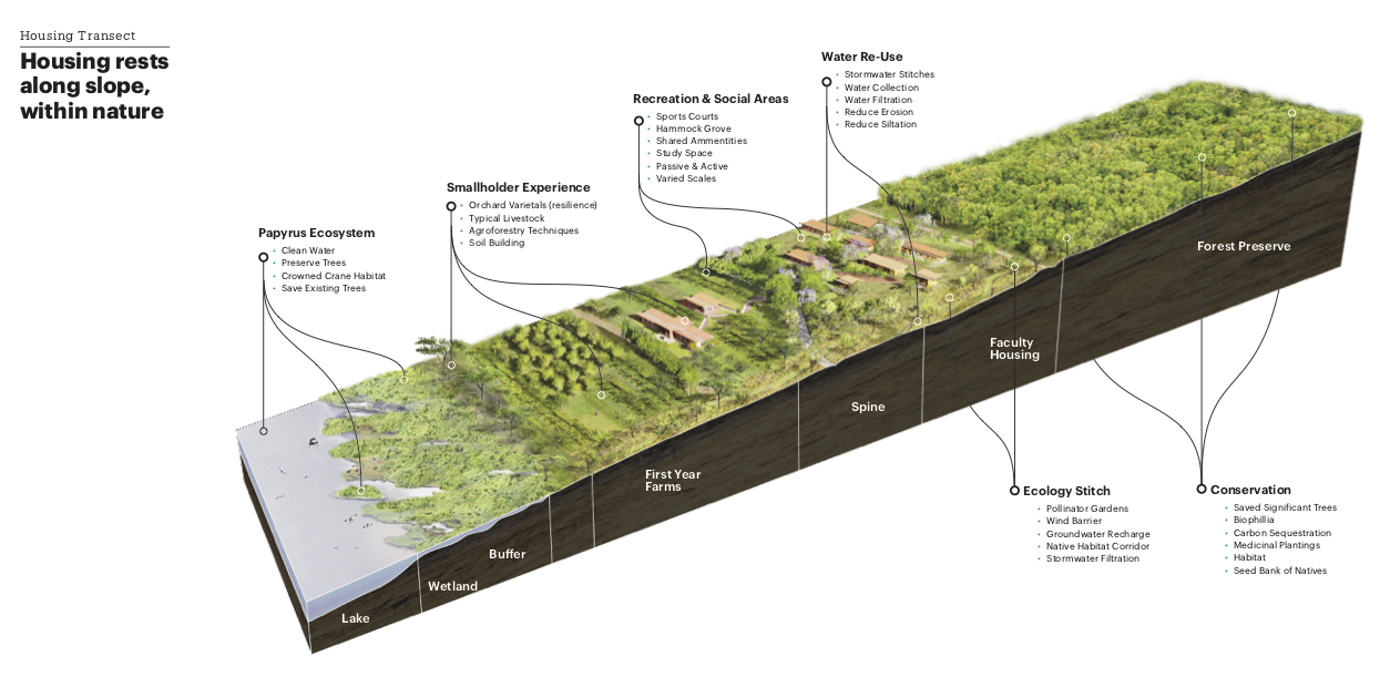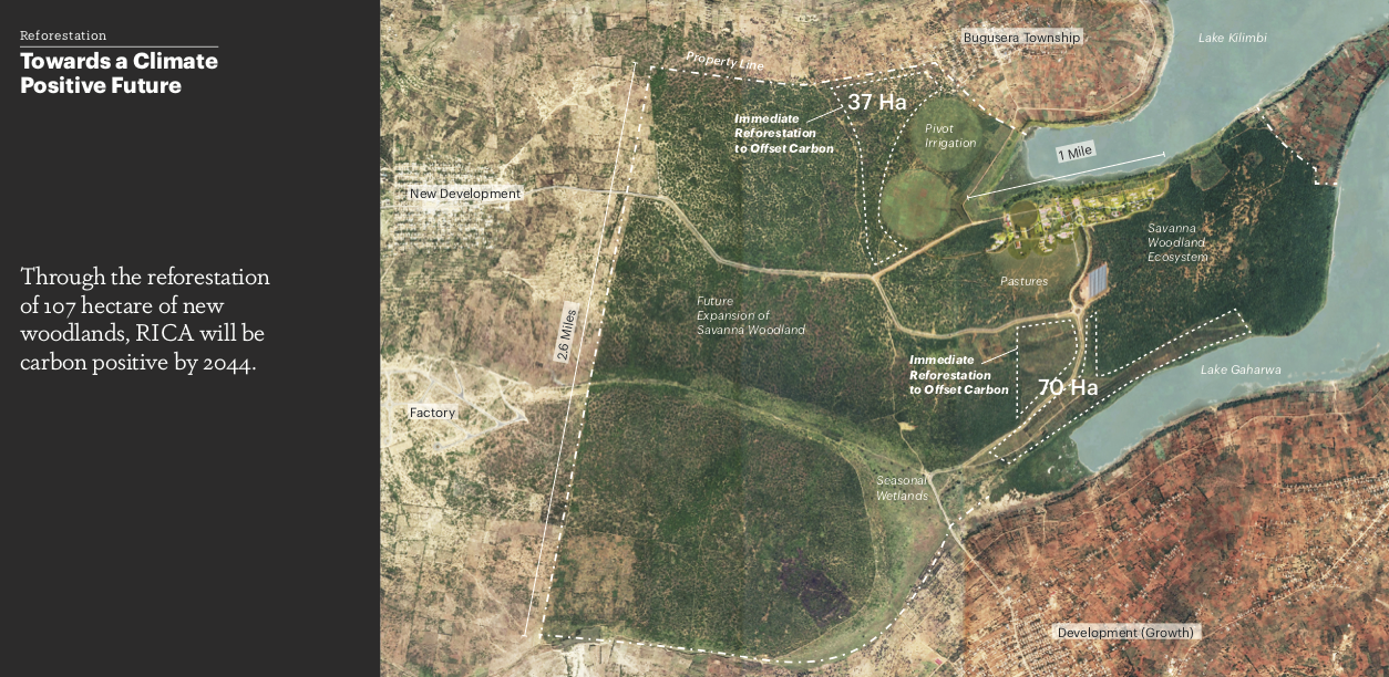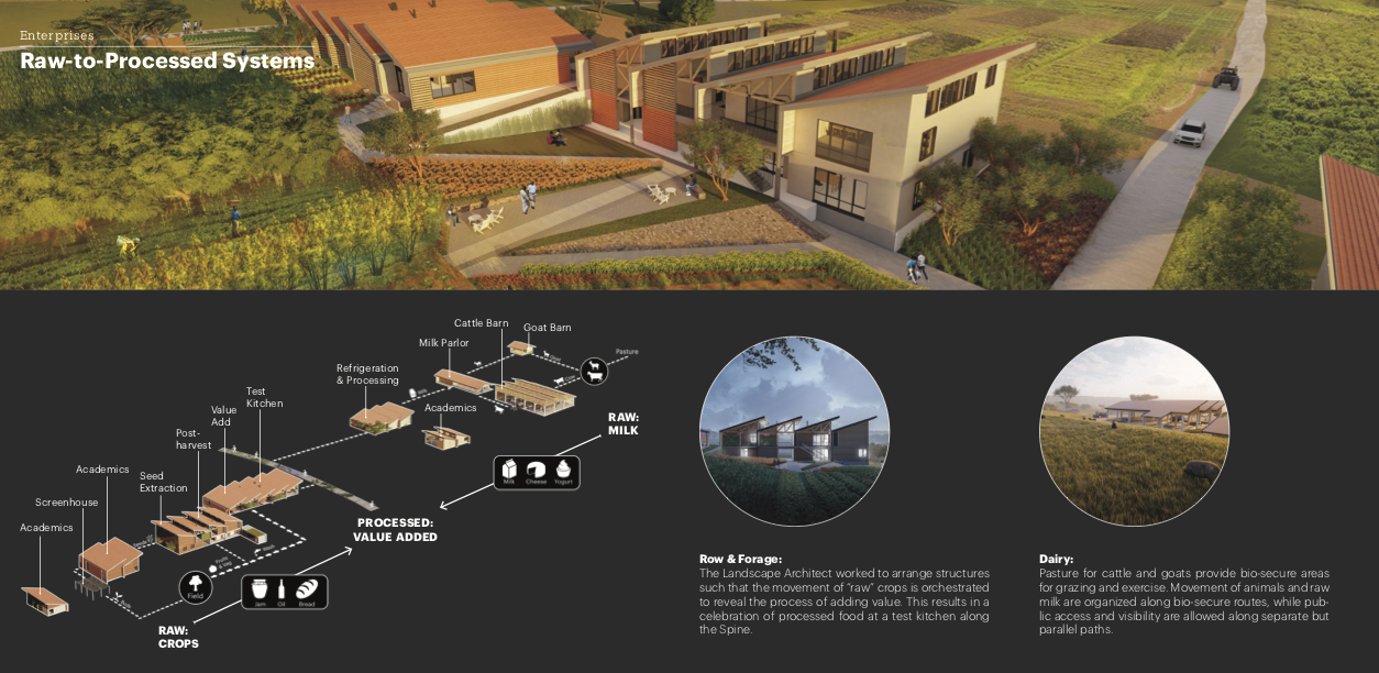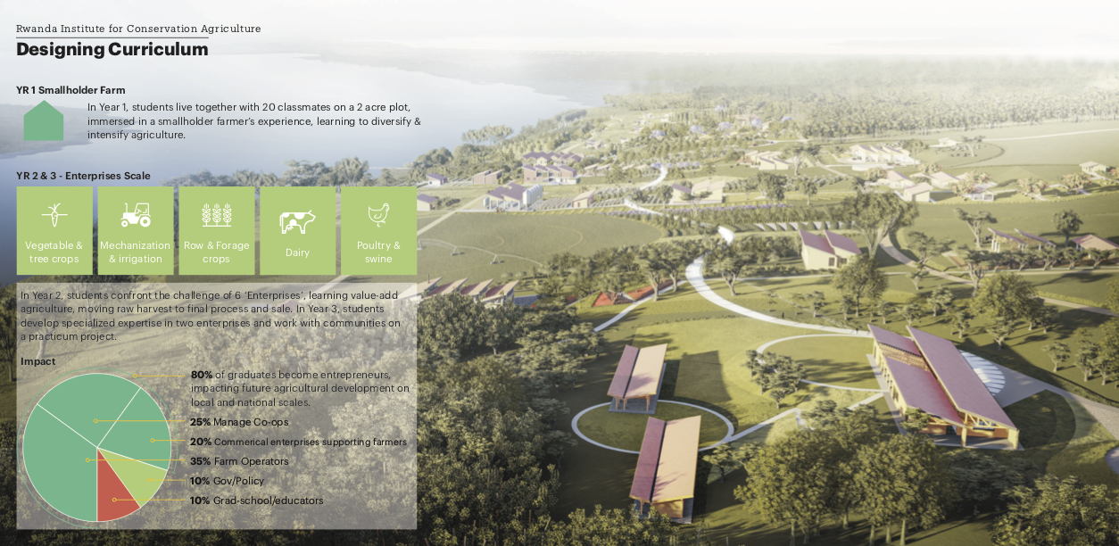 Landscape is the key to a carbon-neutral future. Through landscape architecture and multidisciplinary research-intensive collaboration, we can transform architecture’s environmental impact, offsetting carbon to create climate-positive design. Construction and operational carbon account for roughly 39% of greenhouse gas emissions, with agriculture linked to an additional 10%. The resulting climate crisis has reduced biodiversity and diminished the land-productivity of farmlands, further amplified by growing populations and architectural developments. (Image 03) The Rwanda Institute for Conservation Agriculture (RICA) will be the first climate-positive campus of its kind. Our landscape efforts blurred the lines of environmentalist, engineer, horticultural designer, architect, educator, and contractor to construct a unique agricultural model. By utilizing sustainably sourced materials and off-grid power sources, RICA represents an unprecedented investment into one of Rwanda’s most underserved districts, creating an enormous opportunity for positive environmental, ecological, and agricultural impact. Rwanda is the most densely populated country in Sub-Saharan Africa, with over 441 people per square kilometer. Over 80% of Rwanda’s population currently lives in rural areas, and the country’s population is predicted to double by 2050. This growth has spurred rapid land development, decreasing the availability of agricultural land. Without radical transformation of the country’s agricultural production, Rwanda faces a looming challenge to produce enough food to sustain its people. RICA’s master plan emerged from a multidisciplinary research and analysis effort to understand the existing models of agricultural education within Rwanda, East Africa, the United States, and Central America. The landscape architects were experienced in agricultural systems, forestry, agroforestry, interdisciplinary curriculum development, and ecology to identify opportunities and gaps in pedagogical approaches and the landscapes that serve them. This research included case studies of six international agricultural program campuses, and over twenty Rwandan agricultural schools, butchery, processing, and harvesting centers. The team worked with the local government at all levels, collaborating closely with the Ministry of Agriculture and Ministry of the Environment. The team immersed itself in the community, hosting six engagement sessions and participating in monthly umugandas, or “national community work days,” to understand the cultural values, needs, and resources of the community. This outreach provided insight into development patterns, circulation and transportation corridors, patterns of fuel, building materials, harvesting practices, informal grazing, and water use. Building from initial data collected from the community, the landscape architects initiated an extensive site analysis into the flora and fauna of the site, engaging ecologists, local historians, veterinarians, doctors, agricultural academics, and biologists. This led to the identification of a highly valuable expanse of intact savannah woodlands that comprised roughly one quarter of the total site area. This discovery drove the team to apply design principles based on “One Health,” an approach that argues human, animal, and ecological health are inextricably intertwined within an environment. This informed the project’s mission to become the first ever One Health campus, weaving agricultural production and education into a restored ecosystem. The landscape design incorporated their contextual research, placing great importance on biosecurity vectors, the protection of soils, the conservation of ecological zones, and the fostering of community engagement. To deepen the correlation between this new educational and design approach, the landscape architects collaborated with the university’s teachers to develop a curriculum tailored to the campus programming, emphasizing practical agricultural training, community engagement, and applied research through a lens of One Health (Image 05). First year students study smallholder farming practices while second year students learn on a national scale, experiencing five enterprises of agricultural development: tree and vegetable, row and forage, dairy, swine and poultry, and mechanization and irrigation. Here, students learn “value add” agriculture from raw harvest to final processing and sale. Third year students develop specialized expertise in two enterprises of their choice, and work with communities on a capstone project. The One Health inspired master plan draws from conservation and regenerative agricultural practices, linking ecological and animal health through crop and livestock production practices that replenish soil, water and biodiversity resources. Based upon slope, soil types, existing vegetation, on-site development, and existing circulation, the landscape architects located the campus structures on the ideal 40 hectares of the available 1400 (Image 07). This placed the campus on the site’s northern slope, adjacent to the best soils for farming and grazing. The master plan designated two patches of savannah woodland for conservation, and a wetland buffer was established to ensure appropriate wetland health. A series of ecological corridors connect the woodlands to the wetlands, increasing patch dynamics and allowing movement for animals, insects, and water. RICA’s master plan includes landscape, housing, academic spaces, barn storage, processing space, stormwater systems, human and animal waste management systems, and off-grid energy infrastructure. Programming is organized alongside a continuum of “mechanized to smallholder” farming methods. (Image 08). The academic buildings and production facilities for the enterprises present the movement of raw-to-processed material across the campus’ main corridor, providing educational viewpoints for students and vis