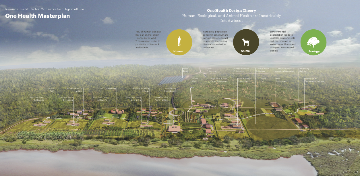 Rwanda’s population will double by 2050, increasing strain on the nation’s maxed-out farmlands. The Rwanda Institute for Conservation Agriculture (RICA) will help ensure future food security for all Rwandans by educating the next generation of farmers and agricultural leaders in developing healthy, sustainable food systems. Informed by a multidisciplinary research and analysis process, the landscape team generated a 1400 hectare land use and master plan guided by the unique theory of One Health, an understanding that human, ecological, and animal health are deeply intertwined. Through One Health RICA harnesses symbiotic ecological and agricultural relationships and regenerative principles to achieve greater crop yields, increased biodiversity, utilized waste streams, healthier soils, and cleaner water. RICA’s landscape architects orchestrated a master plan that will produce a net-zero carbon footprint through landscape design, sustainable construction methods, and materials, such as stone, soil, and vegetation, sourced directly from the site. The project will be petrochemical-free and energy-independent, drawing power from renewable, off-grid energy. RICA is estimated to become carbon-positive by 2044, positioning the project as a model for sustainable development.