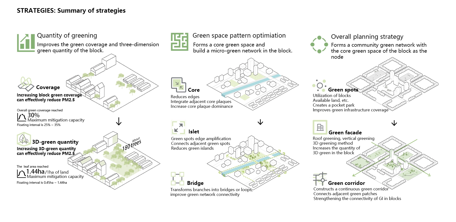 According to the World Health Organization, 91% of the world’s population lives in an environment that has excessive air particle pollution, and particulate matter with a smaller particle size (i.e., PM2.5) is the main pollutant. Previous studies suggested that urban green infrastructure is effective in mitigating PM2.5, while there are significant differences in PM2.5 concentration at the urban block scale. Because block is a central element of urban design, designing green infrastructure at the block scale can be effective in achieving PM2.5 mitigation goals. We analyzed the quantity (e.g., area) and quality of green infrastructure design (e.g., spatial configuration) in five metropolitan areas in China, including correlation analyses of landscape design metrics and long-term PM2.5 data, and we further developed optimized green infrastructure design strategies. Last, we applied these strategies in a typical urban district and modelled the green infrastructure performance. In summary, this study provides strong evidence that green infrastructure design at the block scale is effective in improving air quality. Other countries that face similar air quality challenges can benefit from this research.