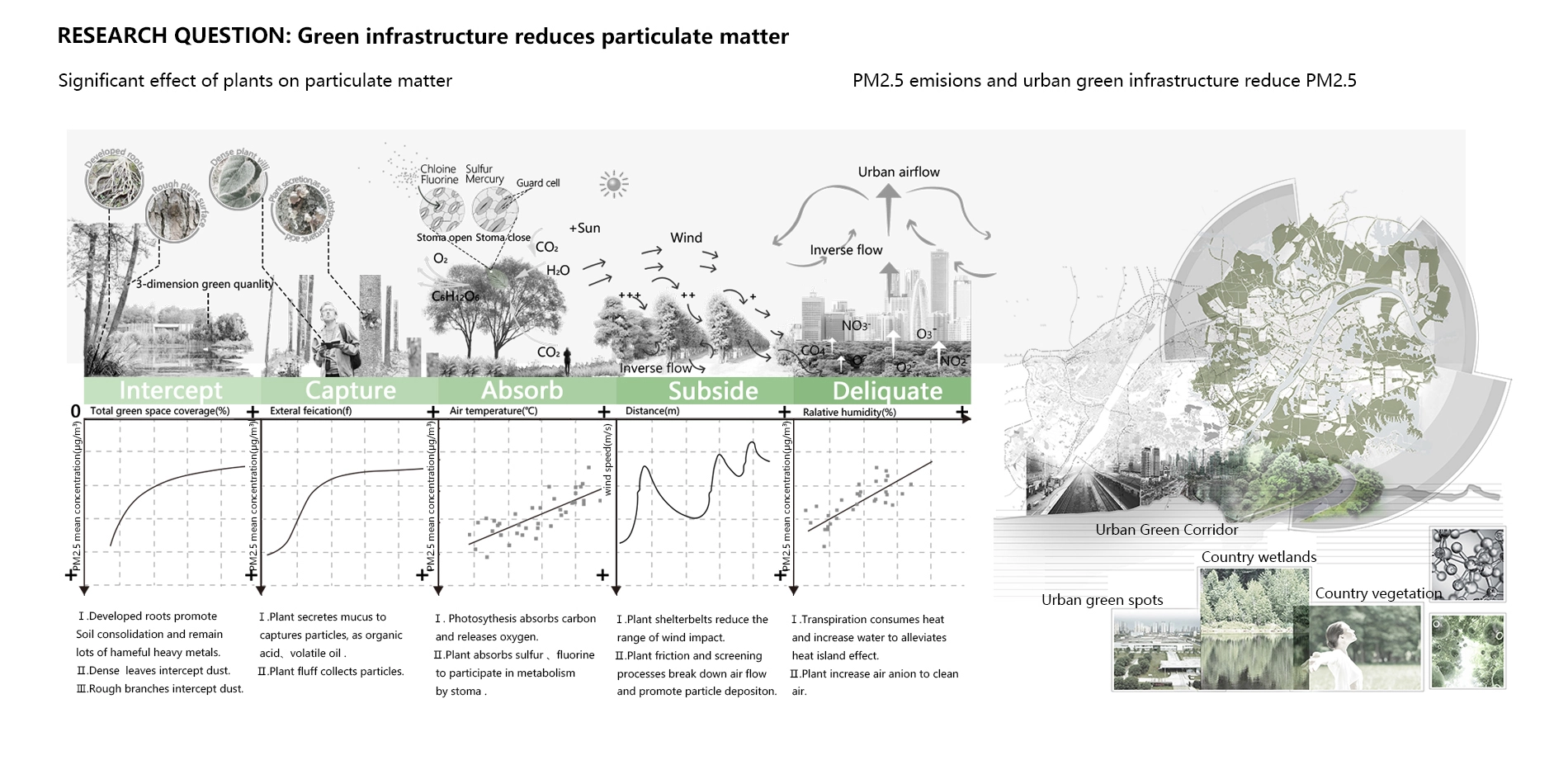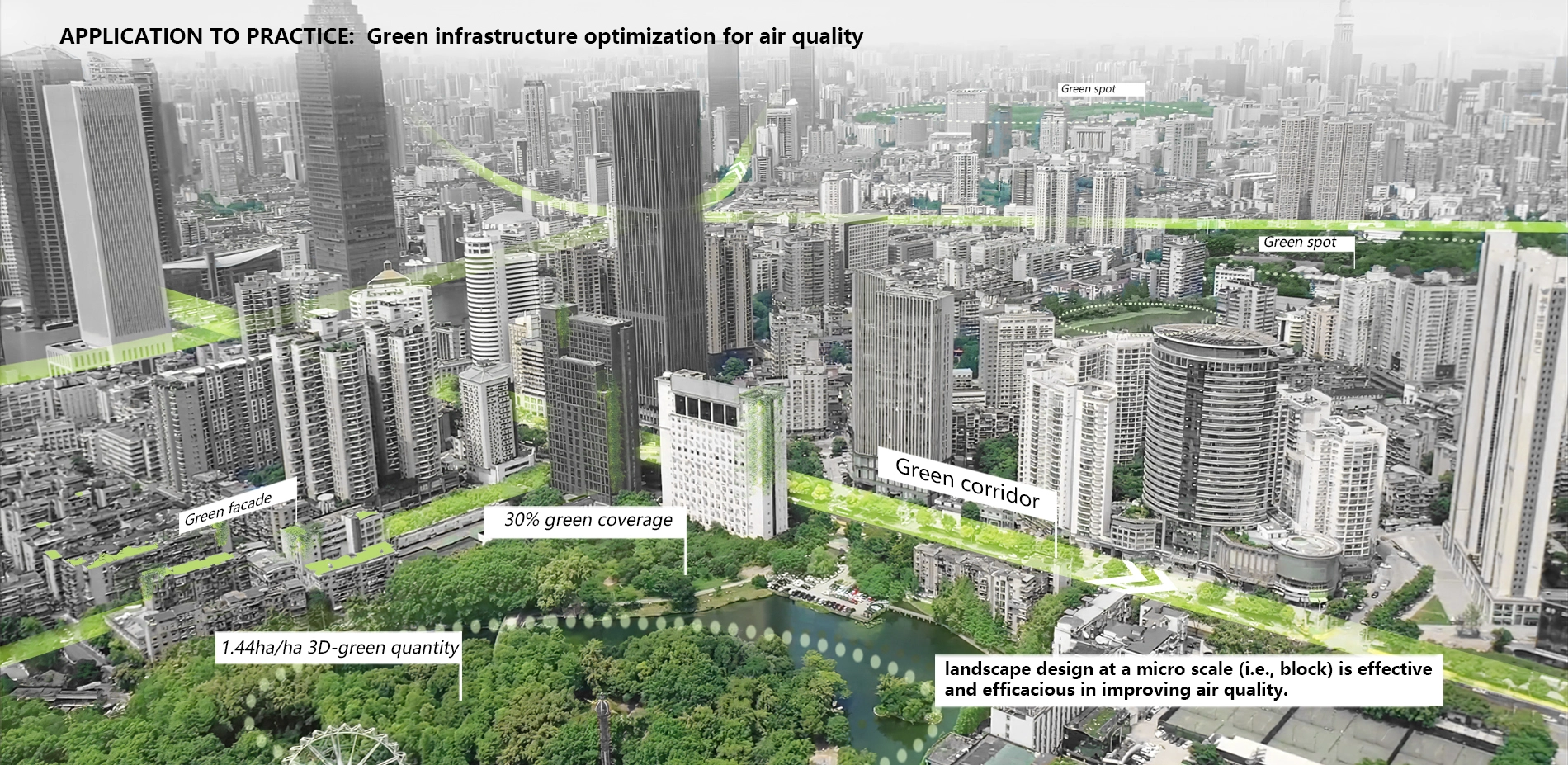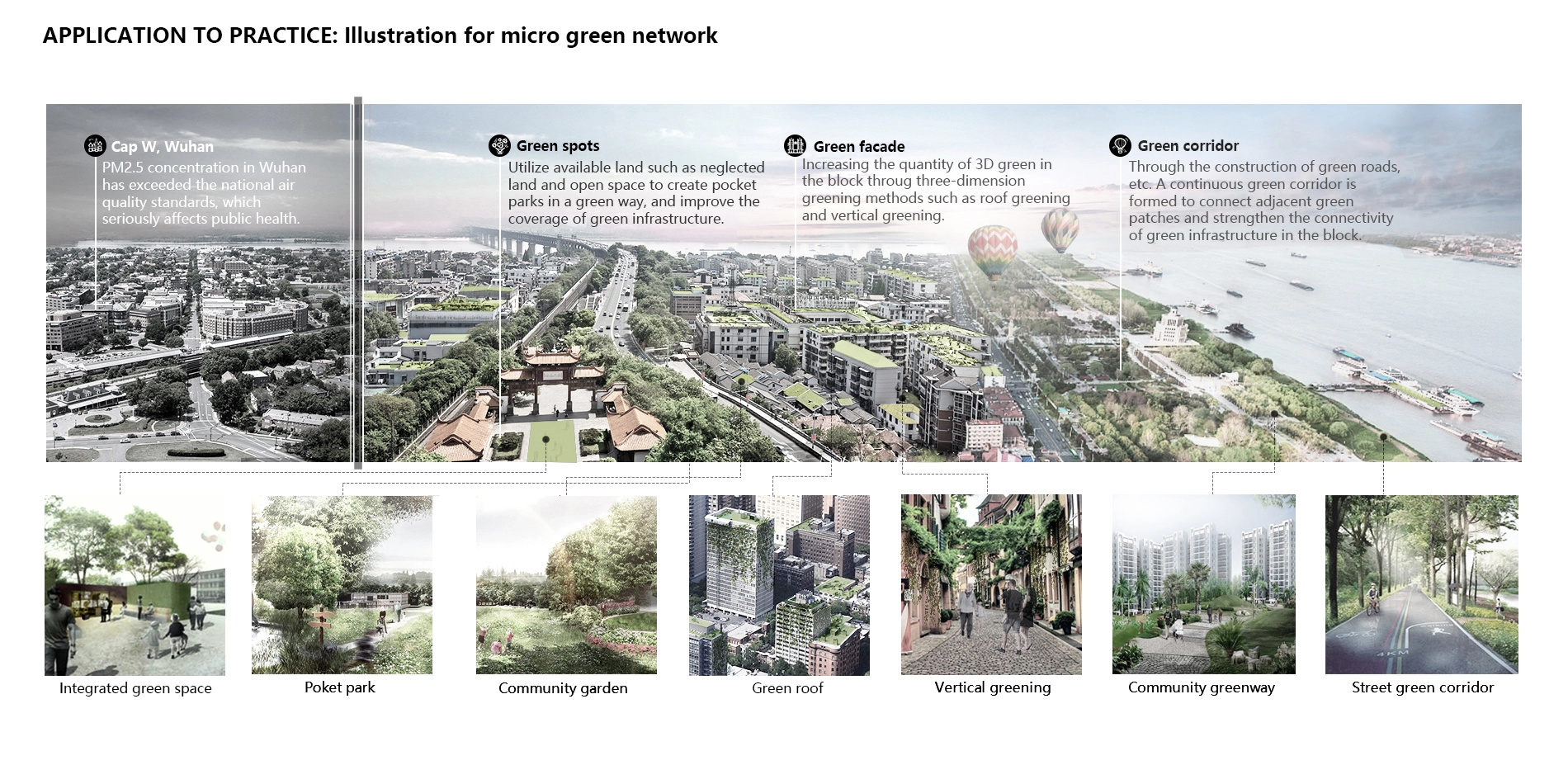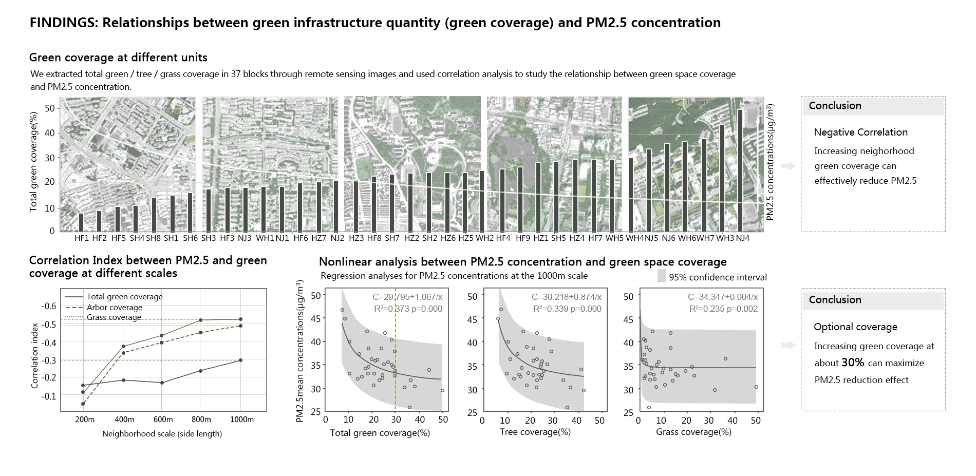 1. Research background According to the World Health Organization, 91% of the world’s population lives in an environment that has excessive air particle pollution, which condition seriously threatens people’s health. Particular matter with a smaller particle size (i.e., PM2.5) is the main pollutant, especially in developing countries. Previous studies have shown that urban green infrastructure in various forms of designed landscapes are effective in mitigating PM2.5 through sedimentation, retardation, and absorption functions provided by plants. Through analyzing long-term monitoring data, this current study found that PM2.5 concentration can vary significantly among different urban blocks, ranging from 80% to120%. Because block is a central element of urban design, planning and design at the block scale can be effective in achieving PM2.5 mitigation goals. 2. Research methods We used five provincial capital cities in the middle- and lower-reaches of the Yangtze River in China as the study sites. These cities are Hefei, Shanghai, Nanjing, Hangzhou and Wuhan, all of them are part of the hot-summer/cold-winter climate zone. In addition, these cities have similar built-up urban areas, landforms, and urban morphology, and suffer from similar levels of severity of air pollution. The readily available air quality monitoring stations across these cities also make them ideal for the analysis of green infrastructure and PM2.5 mitigation. After data screening and experimental controls of the sites, 37 typical urban blocks were selected to perform the statistical analyses, with green infrastructure size and spatial pattern being the primarily independent variables. A typical urban block is defined based on a grid of 1km × 1 km that has an air quality monitoring station located approximately on the center. Detailed procedures are elaborated below. PM2.5: PM2.5 data in the form of hourly PM2.5 concentration are retrieved from the monitoring stations installed and operated by the China National Environmental Monitoring Center for two years. These stations provide an open access to high precision and abundant air quality data. PM2.5 data of the five cities are comparable for the analysis because they are measured based on the same standards, and three relative indicators (range, duration, and rate) are used to represent the changes of PM2.5 concentration. Scale and pattern of green infrastructure: Based on the 0.8m high-resolution remote sensing imagery, the quantity and spatial distributions of green infrastructure are identified. The green space coverage and the three-dimension (3D) greening are obtained via the object-oriented classification method and the remote sensing inversion method, respectively, which altogether represent the scale of green infrastructure adoption. Next, using the morphological spatial pattern analysis (MSPA) we visualized the spatial patterns of green infrastructure, which were overlaid against the urban fabric and were presented as seven pattern classes. Quantitative analysis: Correlation analyses were conducted regarding the coverage of green infrastructure and PM2.5 concentration. Curve fitting analysis was used to ultimately define a possible threshold of green coverage that allows maximum green infrastructure performance. Through the stepwise regression analysis, the seven green infrastructure pattern classes and their relative contributions to PM2.5 concentration reduction are quantified. 3. Findings Relationships between green infrastructure quantity and PM2.5 concentration Increasing the block-scale green space coverage can effectively reduce PM2.5 concentration; the maximum reduction effect occurs when the green space coverage increases to approximately 30%. Increasing the block-scale 3D greening can effectively reduce PM2.5 concentration; increasing 3D greening density to about 1.44 ha per hectare land area can maximize the reduction effect. Relations between Green infrastructure spatial pattern and PM2.5 relative concentration Through the analysis of seven MSPA classes, we found that five of them can significantly reduce PM2.5 concentration, and among these the core, bridge, and islet have the strongest impact. Increasing the proportions of the core and bridge classes can decrease PM2.5 concentration. Decreasing the proportion of islet class can also decrease PM2.5 concentration. 4. Summary of design strategies Three operational strategies are proposed based on this current research. (1) Create pocket parks through retrofitting vacant land, idle land, and other available land areas at the block scale to innovative green infrastructure designs; (2) Increase the 3D greening of urban blocks through roof greening, vertical greening, and other green facade; (3) Improve connectivity of green infrastructure in urban blocks through stitching adjacent green patches and make them continuous green corridors and greenways. 5. Project application based on research findings Jianghan District, Wuhan, has a total area of 28.29 square km and a population of 680,000. This district is a typical snapshot of the old city in Wuhan that suffers from serious air pollution. The district contains extensive urban block units; current green infrastructure is limited and yet, highly fragmented. Following the analysis of the green infrastructure coverage percentage and the 3D greening and MSPA classes, we used the design strategies derived from the research and proposed the construction of greenways, making full use of the idle land areas for greening and increasing roof greening and vertical greening. The green space coverage has increased from 23.35% to 29.96%. Specifically, the proportions of the core MSPA class increased by 5.84%, the bridge MSPA class increased by 1.15%, and the island MSPA class reduced by 4.62%, respectively. Modeling analysis shows that the number of days reaching standard is expected to be in creased by 32 days. 6. Significance Through analyzing the quantity (e.g