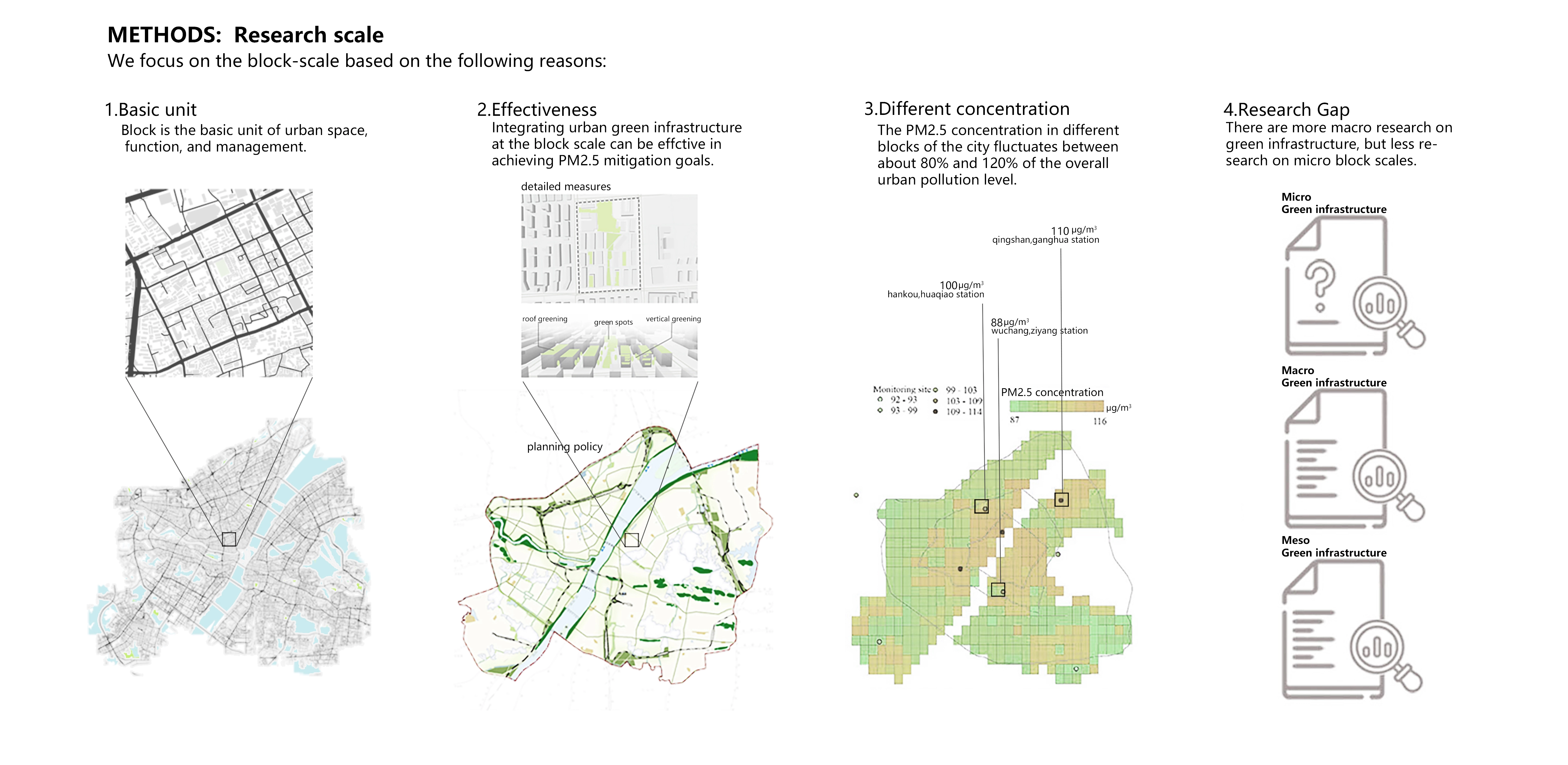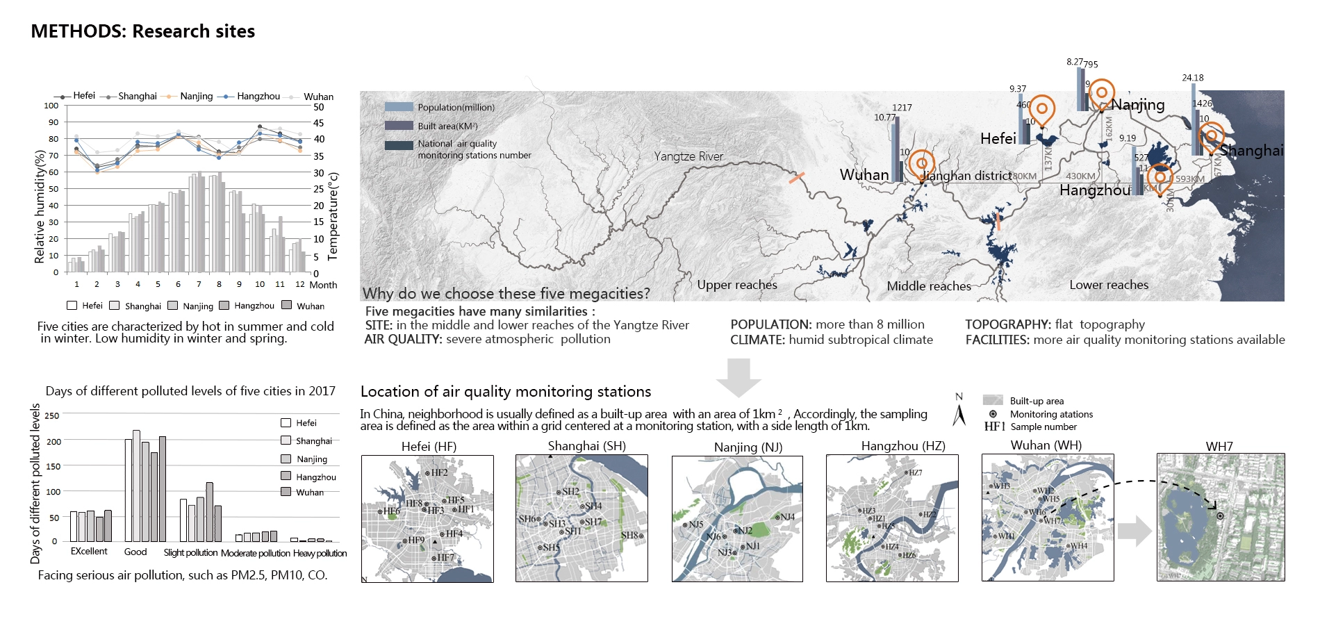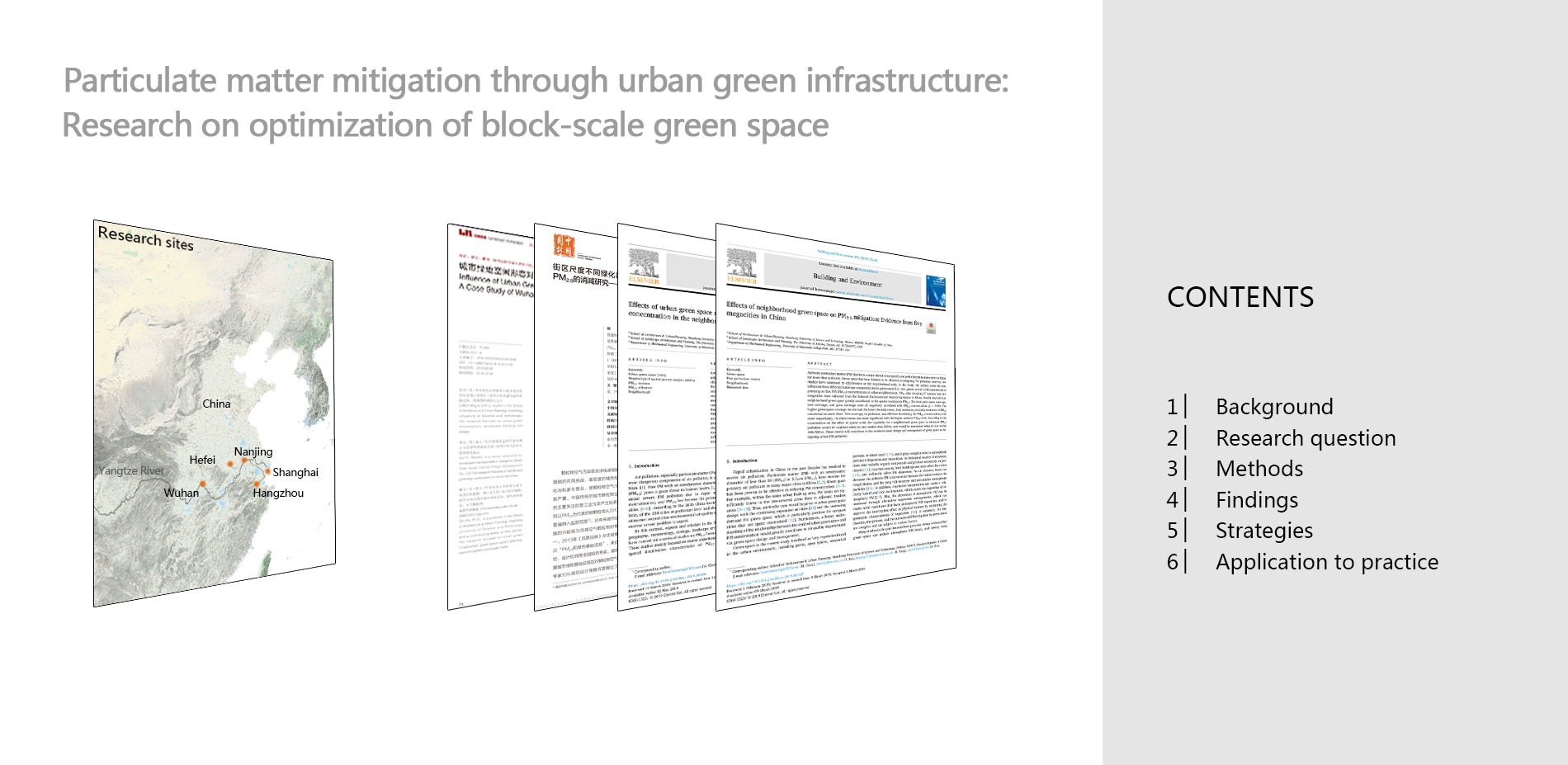 1. Research background According to the World Health Organization, 91% of the world’s population lives in an environment that has excessive air particle pollution, which condition seriously threatens people’s health. Particular matter with a smaller particle size (i.e., PM2.5) is the main pollutant, especially in developing countries. Previous studies have shown that urban green infrastructure in various forms of designed landscapes are effective in mitigating PM2.5 through sedimentation, retardation, and absorption functions provided by plants. Through analyzing long-term monitoring data, this current study found that PM2.5 concentration can vary significantly among different urban blocks, ranging from 80% to120%. Because block is a central element of urban design, planning and design at the block scale can be effective in achieving PM2.5 mitigation goals. 2. Research methods We used five provincial capital cities in the middle- and lower-reaches of the Yangtze River in China as the study sites. These cities are Hefei, Shanghai, Nanjing, Hangzhou and Wuhan, all of them are part of the hot-summer/cold-winter climate zone. In addition, these cities have similar built-up urban areas, landforms, and urban morphology, and suffer from similar levels of severity of air pollution. The readily available air quality monitoring stations across these cities also make them ideal for the analysis of green infrastructure and PM2.5 mitigation. After data screening and experimental controls of the sites, 37 typical urban blocks were selected to perform the statistical analyses, with green infrastructure size and spatial pattern being the primarily independent variables. A typical urban block is defined based on a grid of 1km × 1 km that has an air quality monitoring station located approximately on the center. Detailed procedures are elaborated below. PM2.5: PM2.5 data in the form of hourly PM2.5 concentration are retrieved from the monitoring stations installed and operated by the China National Environmental Monitoring Center for two years. These stations provide an open access to high precision and abundant air quality data. PM2.5 data of the five cities are comparable for the analysis because they are measured based on the same standards, and three relative indicators (range, duration, and rate) are used to represent the changes of PM2.5 concentration. Scale and pattern of green infrastructure: Based on the 0.8m high-resolution remote sensing imagery, the quantity and spatial distributions of green infrastructure are identified. The green space coverage and the three-dimension (3D) greening are obtained via the object-oriented classification method and the remote sensing inversion method, respectively, which altogether represent the scale of green infrastructure adoption. Next, using the morphological spatial pattern analysis (MSPA) we visualized the spatial patterns of green infrastructure, which were overlaid against the urban fabric and were presented as seven pattern classes. Quantitative analysis: Correlation analyses were conducted regarding the coverage of green infrastructure and PM2.5 concentration. Curve fitting analysis was used to ultimately define a possible threshold of green coverage that allows maximum green infrastructure performance. Through the stepwise regression analysis, the seven green infrastructure pattern classes and their relative contributions to PM2.5 concentration reduction are quantified. 3. Findings Relationships between green infrastructure quantity and PM2.5 concentration Increasing the block-scale green space coverage can effectively reduce PM2.5 concentration; the maximum reduction effect occurs when the green space coverage increases to approximately 30%. Increasing the block-scale 3D greening can effectively reduce PM2.5 concentration; increasing 3D greening density to about 1.44 ha per hectare land area can maximize the reduction effect. Relations between Green infrastructure spatial pattern and PM2.5 relative concentration Through the analysis of seven MSPA classes, we found that five of them can significantly reduce PM2.5 concentration, and among these the core, bridge, and islet have the strongest impact. Increasing the proportions of the core and bridge classes can decrease PM2.5 concentration. Decreasing the proportion of islet class can also decrease PM2.5 concentration. 4. Summary of design strategies Three operational strategies are proposed based on this current research. (1) Create pocket parks through retrofitting vacant land, idle land, and other available land areas at the block scale to innovative green infrastructure designs; (2) Increase the 3D greening of urban blocks through roof greening, vertical greening, and other green facade; (3) Improve connectivity of green infrastructure in urban blocks through stitching adjacent green patches and make them continuous green corridors and greenways. 5. Project application based on research findings Jianghan District, Wuhan, has a total area of 28.29 square km and a population of 680,000. This district is a typical snapshot of the old city in Wuhan that suffers from serious air pollution. The district contains extensive urban block units; current green infrastructure is limited and yet, highly fragmented. Following the analysis of the green infrastructure coverage percentage and the 3D greening and MSPA classes, we used the design strategies derived from the research and proposed the construction of greenways, making full use of the idle land areas for greening and increasing roof greening and vertical greening. The green space coverage has increased from 23.35% to 29.96%. Specifically, the proportions of the core MSPA class increased by 5.84%, the bridge MSPA class increased by 1.15%, and the island MSPA class reduced by 4.62%, respectively. Modeling analysis shows that the number of days reaching standard is expected to be in creased by 32 days. 6. Significance Through analyzing the quantity (e.g