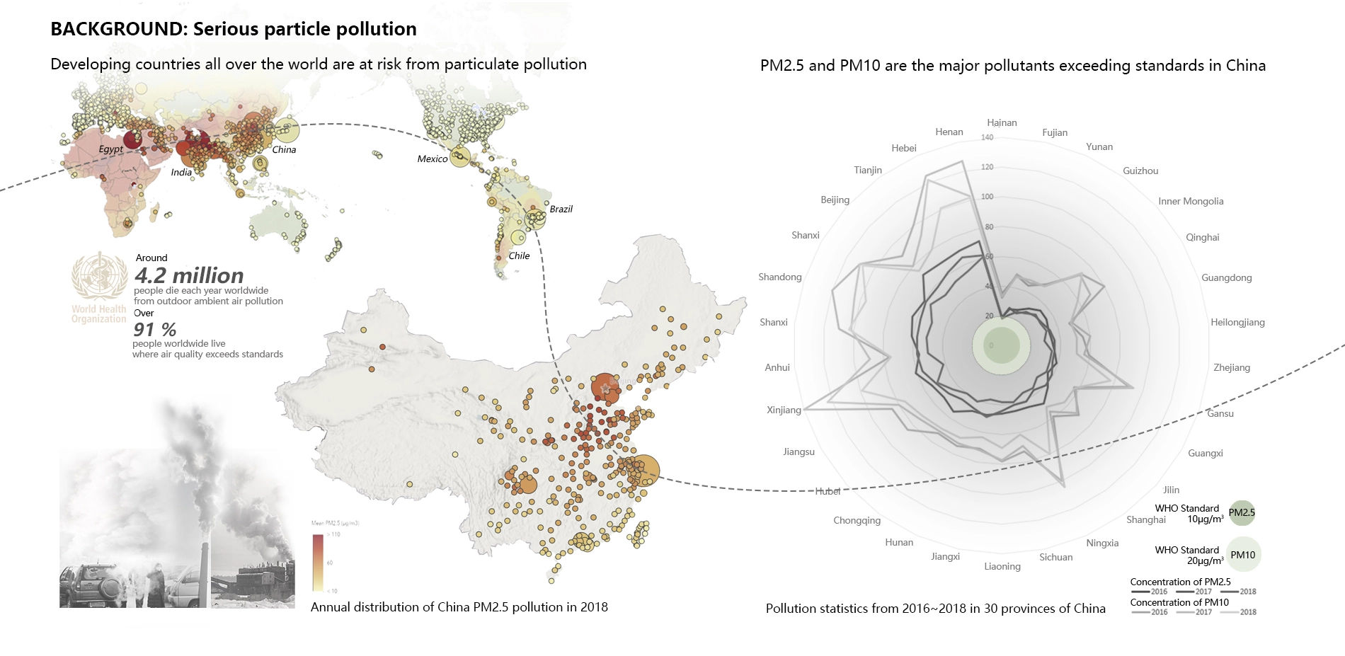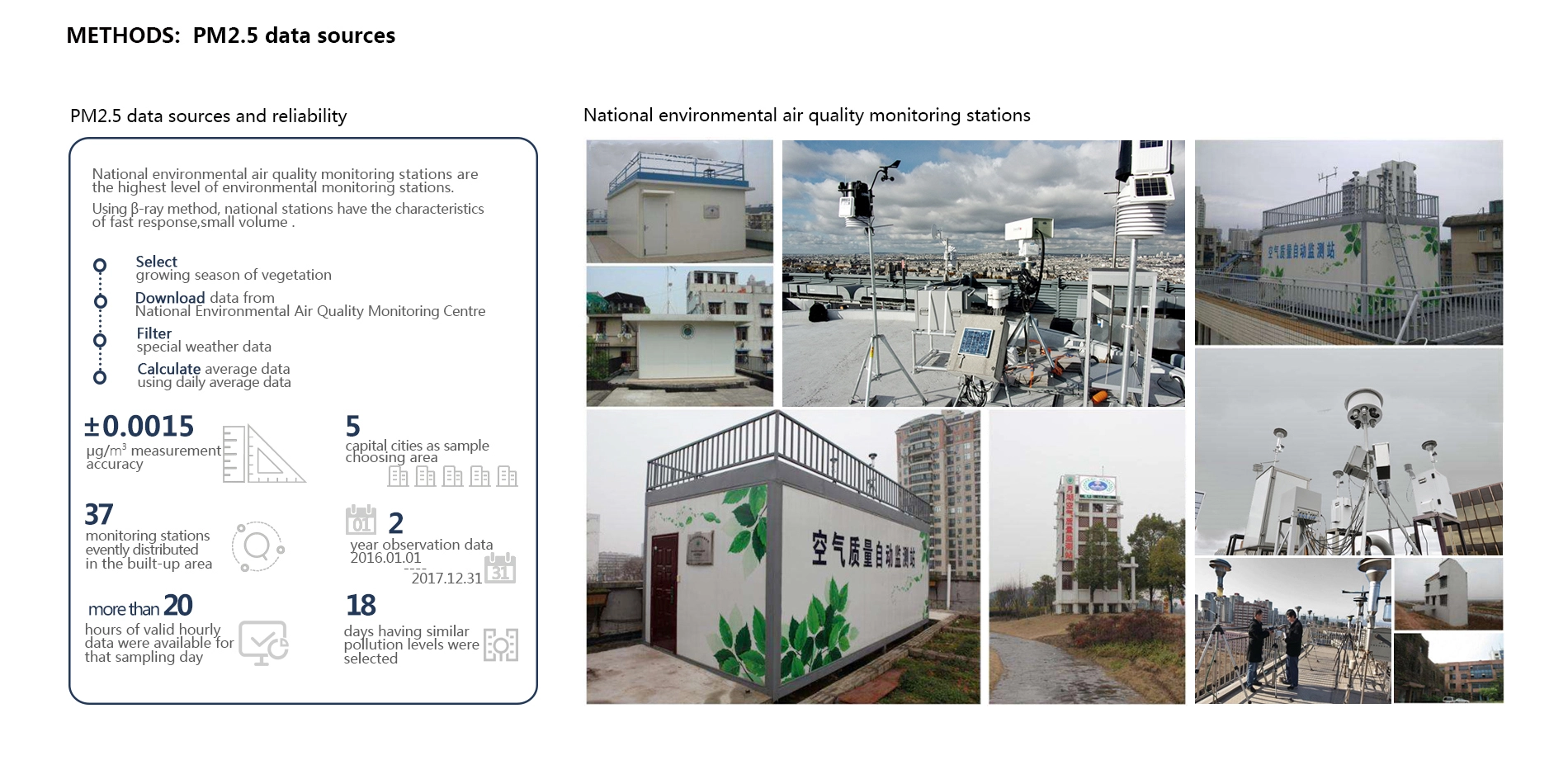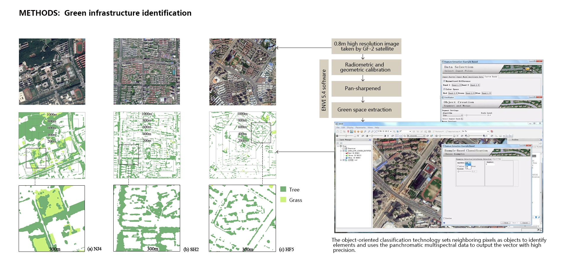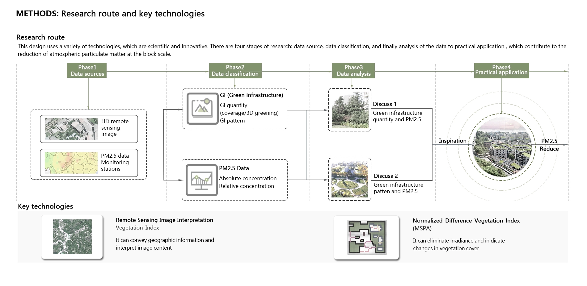 1. Research background According to the World Health Organization, 91% of the world’s population lives in an environment that has excessive air particle pollution, which condition seriously threatens people’s health. Particular matter with a smaller particle size (i.e., PM2.5) is the main pollutant, especially in developing countries. Previous studies have shown that urban green infrastructure in various forms of designed landscapes are effective in mitigating PM2.5 through sedimentation, retardation, and absorption functions provided by plants. Through analyzing long-term monitoring data, this current study found that PM2.5 concentration can vary significantly among different urban blocks, ranging from 80% to120%. Because block is a central element of urban design, planning and design at the block scale can be effective in achieving PM2.5 mitigation goals. 2. Research methods We used five provincial capital cities in the middle- and lower-reaches of the Yangtze River in China as the study sites. These cities are Hefei, Shanghai, Nanjing, Hangzhou and Wuhan, all of them are part of the hot-summer/cold-winter climate zone. In addition, these cities have similar built-up urban areas, landforms, and urban morphology, and suffer from similar levels of severity of air pollution. The readily available air quality monitoring stations across these cities also make them ideal for the analysis of green infrastructure and PM2.5 mitigation. After data screening and experimental controls of the sites, 37 typical urban blocks were selected to perform the statistical analyses, with green infrastructure size and spatial pattern being the primarily independent variables. A typical urban block is defined based on a grid of 1km × 1 km that has an air quality monitoring station located approximately on the center. Detailed procedures are elaborated below. PM2.5: PM2.5 data in the form of hourly PM2.5 concentration are retrieved from the monitoring stations installed and operated by the China National Environmental Monitoring Center for two years. These stations provide an open access to high precision and abundant air quality data. PM2.5 data of the five cities are comparable for the analysis because they are measured based on the same standards, and three relative indicators (range, duration, and rate) are used to represent the changes of PM2.5 concentration. Scale and pattern of green infrastructure: Based on the 0.8m high-resolution remote sensing imagery, the quantity and spatial distributions of green infrastructure are identified. The green space coverage and the three-dimension (3D) greening are obtained via the object-oriented classification method and the remote sensing inversion method, respectively, which altogether represent the scale of green infrastructure adoption. Next, using the morphological spatial pattern analysis (MSPA) we visualized the spatial patterns of green infrastructure, which were overlaid against the urban fabric and were presented as seven pattern classes. Quantitative analysis: Correlation analyses were conducted regarding the coverage of green infrastructure and PM2.5 concentration. Curve fitting analysis was used to ultimately define a possible threshold of green coverage that allows maximum green infrastructure performance. Through the stepwise regression analysis, the seven green infrastructure pattern classes and their relative contributions to PM2.5 concentration reduction are quantified. 3. Findings Relationships between green infrastructure quantity and PM2.5 concentration Increasing the block-scale green space coverage can effectively reduce PM2.5 concentration; the maximum reduction effect occurs when the green space coverage increases to approximately 30%. Increasing the block-scale 3D greening can effectively reduce PM2.5 concentration; increasing 3D greening density to about 1.44 ha per hectare land area can maximize the reduction effect. Relations between Green infrastructure spatial pattern and PM2.5 relative concentration Through the analysis of seven MSPA classes, we found that five of them can significantly reduce PM2.5 concentration, and among these the core, bridge, and islet have the strongest impact. Increasing the proportions of the core and bridge classes can decrease PM2.5 concentration. Decreasing the proportion of islet class can also decrease PM2.5 concentration. 4. Summary of design strategies Three operational strategies are proposed based on this current research. (1) Create pocket parks through retrofitting vacant land, idle land, and other available land areas at the block scale to innovative green infrastructure designs; (2) Increase the 3D greening of urban blocks through roof greening, vertical greening, and other green facade; (3) Improve connectivity of green infrastructure in urban blocks through stitching adjacent green patches and make them continuous green corridors and greenways. 5. Project application based on research findings Jianghan District, Wuhan, has a total area of 28.29 square km and a population of 680,000. This district is a typical snapshot of the old city in Wuhan that suffers from serious air pollution. The district contains extensive urban block units; current green infrastructure is limited and yet, highly fragmented. Following the analysis of the green infrastructure coverage percentage and the 3D greening and MSPA classes, we used the design strategies derived from the research and proposed the construction of greenways, making full use of the idle land areas for greening and increasing roof greening and vertical greening. The green space coverage has increased from 23.35% to 29.96%. Specifically, the proportions of the core MSPA class increased by 5.84%, the bridge MSPA class increased by 1.15%, and the island MSPA class reduced by 4.62%, respectively. Modeling analysis shows that the number of days reaching standard is expected to be in creased by 32 days. 6. Significance Through analyzing the quantity (e.g