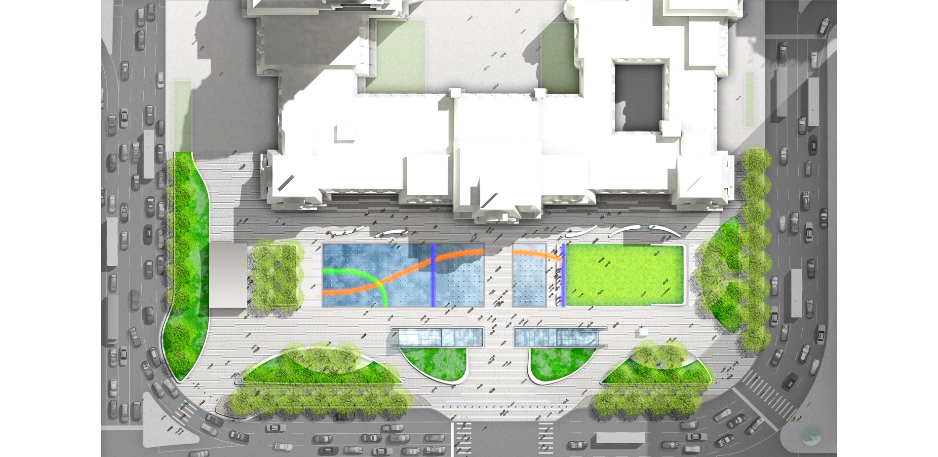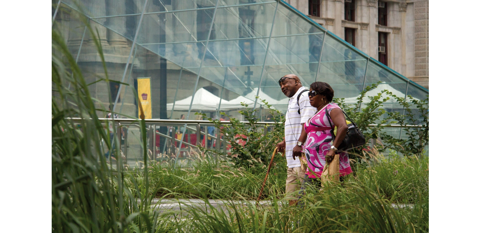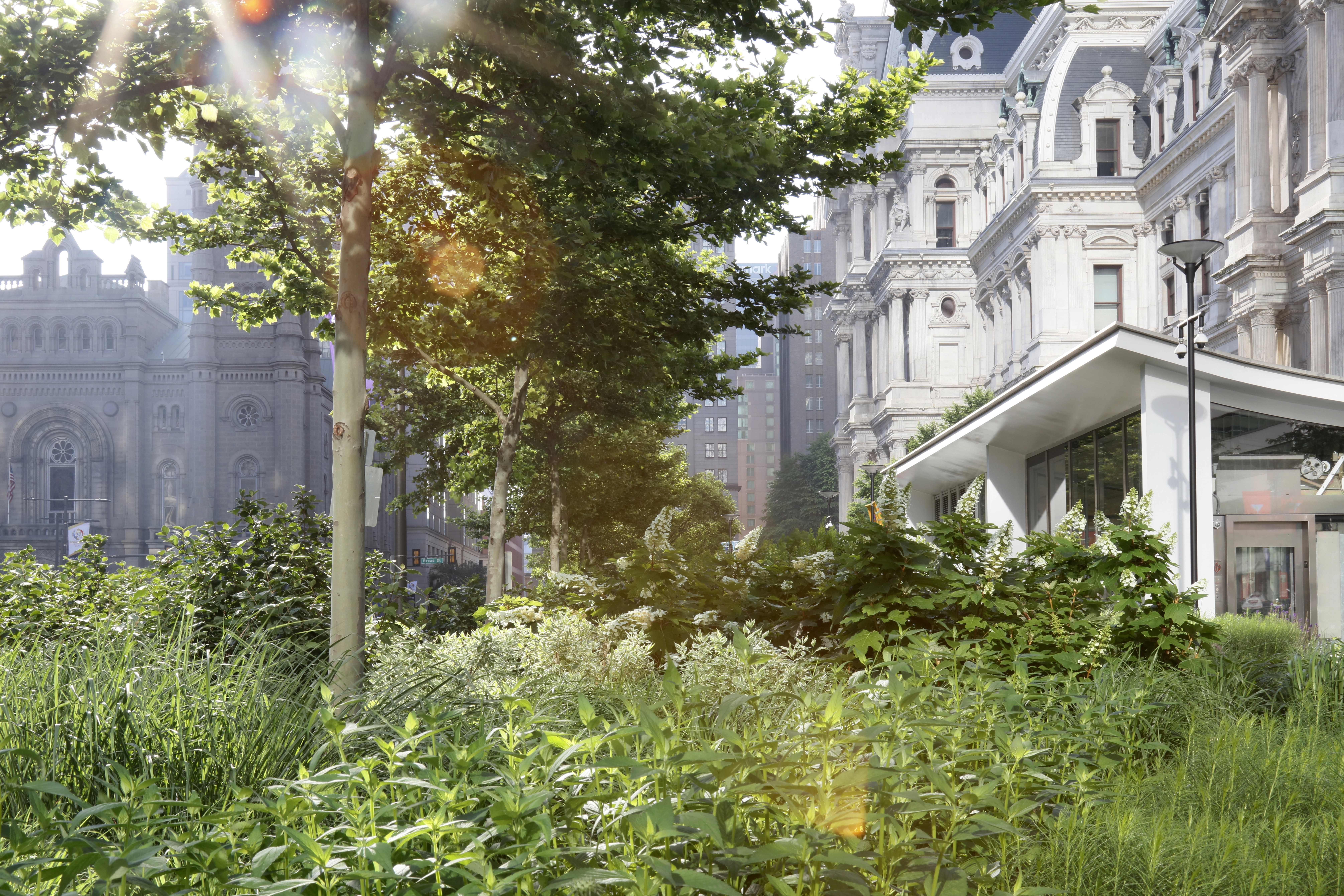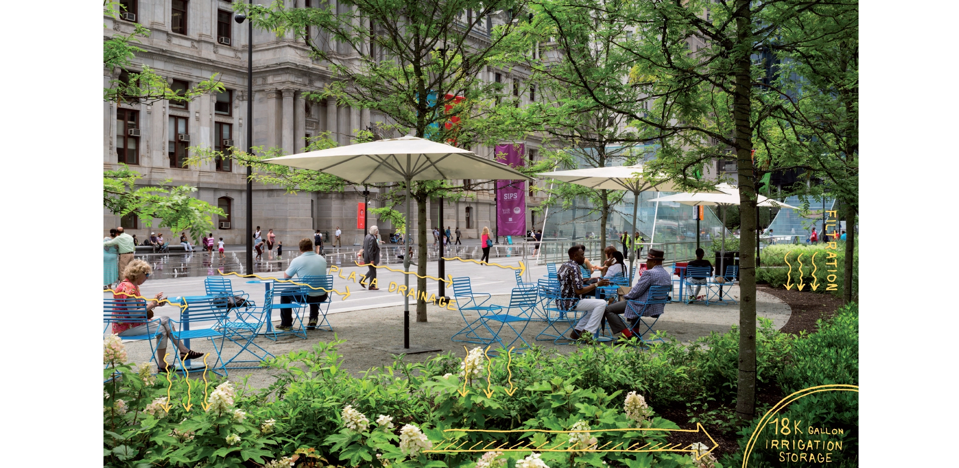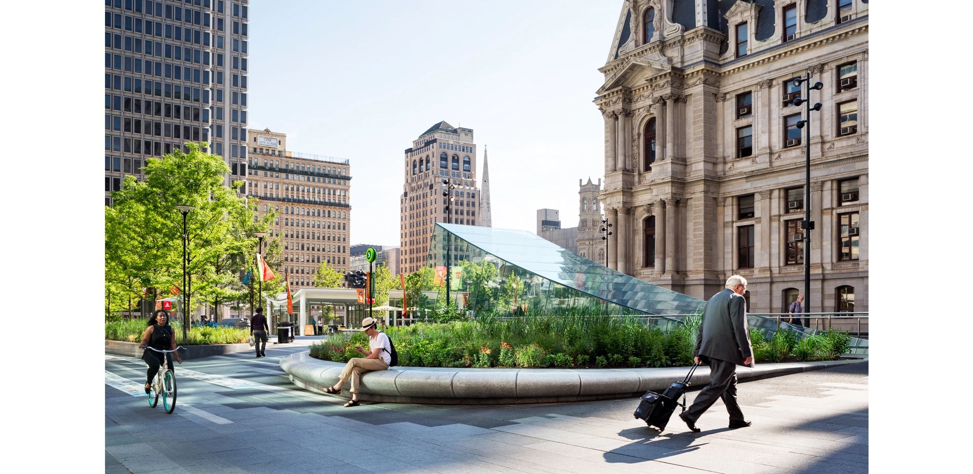 Dilworth Park at Philadelphia’s City Hall is a lively and contemporary embodiment of William Penn’s vision for Philadelphia as a ‘Green Country Town.’ Today the park is an inclusive hub of Philadelphia’s life outdoors but for decades this was not the case. Prior to renovation Dilworth was an uninviting and inaccessible maze of raised and sunken terraces, hidden passageways, and defunct fountains surrounded by gloomy malnourished trees. The opportunity for change raised the park, both physically and metaphorically, to the prominence of its location at the foot of Philadelphia’s City Hall. The new park provides universal accessibility by bringing the entire site to street level, and encourages use throughout the day with a variety of programming. The entire park, with its generous lawn, interactive fountain, café, and ample seating amidst green groves of native plantings, are all built atop the nexus of Philadelphia’s multi-modal transit system and acts as a connective gateway to all of Philly’s neighborhoods. The park functions as a 2.5-acre green roof, creating a welcome all-season spot for relaxation and public recreation.