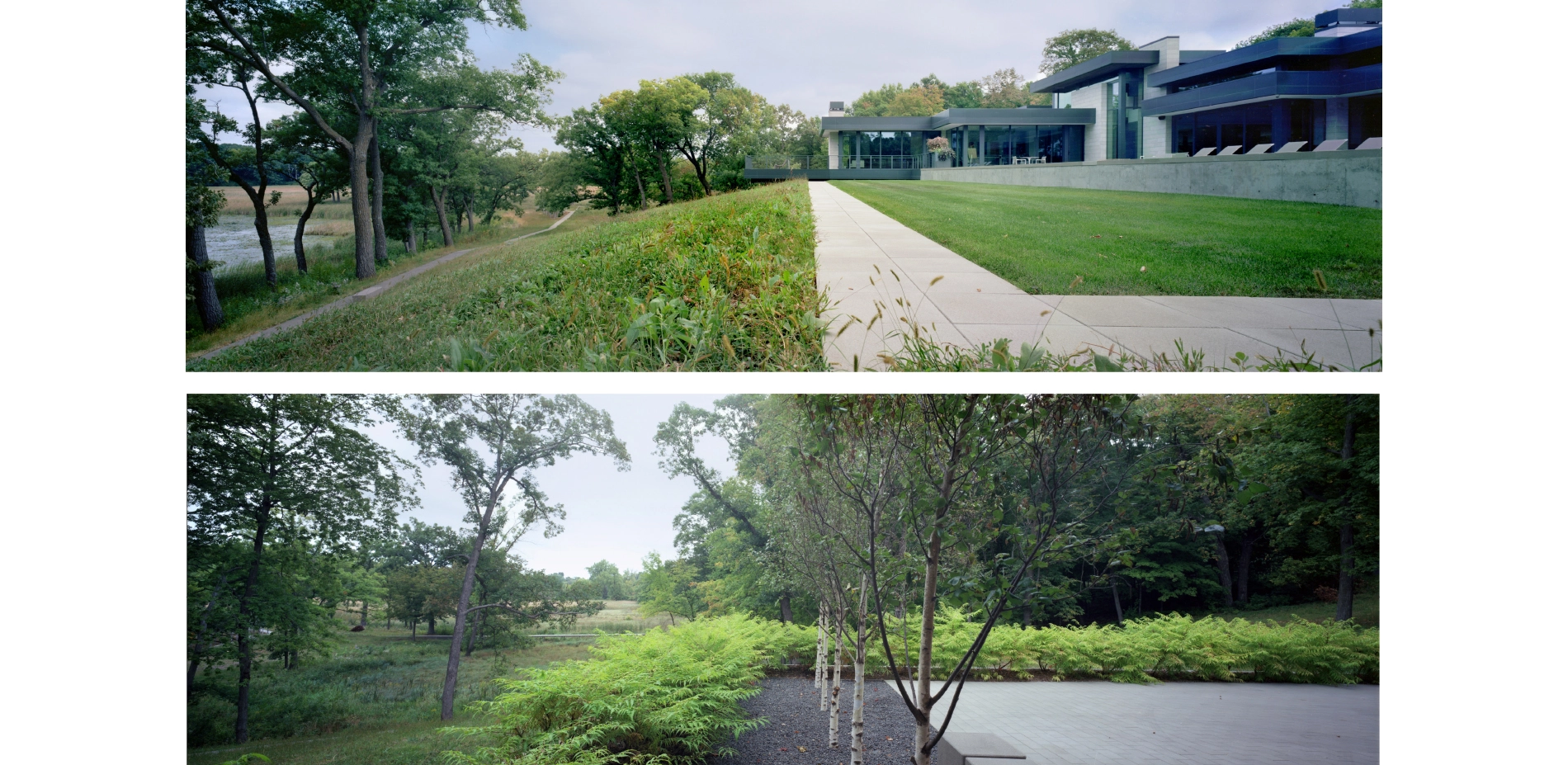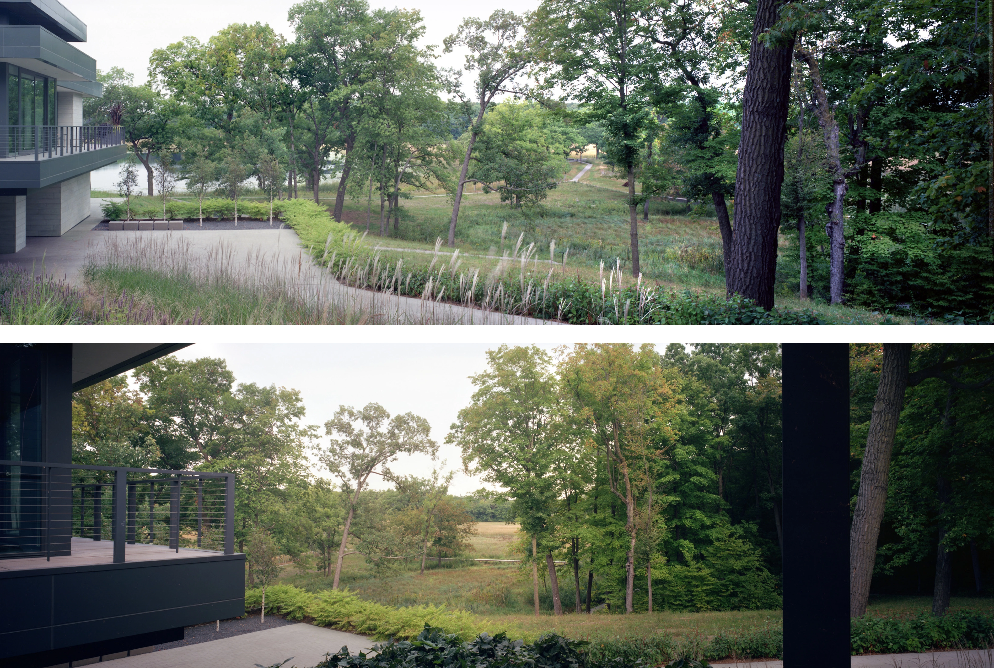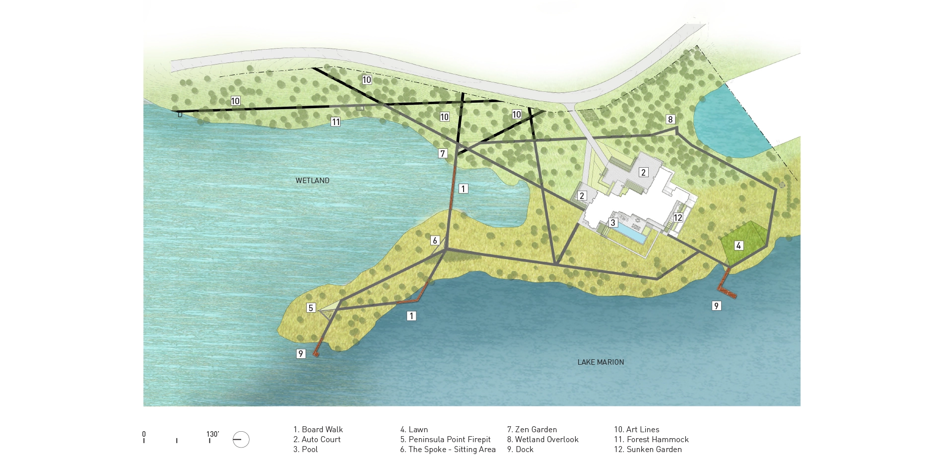 Context The Lake Marion estate covers twenty-two acres of oak savannas, woodlands, wetlands, and lakeshore. From the project’s inception, the clients were deeply committed to restoring the landscape to its native splendor, requesting that the entire area be accessible while simultaneously minimizing ecological impacts. The home itself sits within a small pocket of developed land, which allowed the landscape architect to focus on thoughtful restoration plans and careful circulation throughout the broader landscape, in a manner that emphasized minimal impact of the work and design. The areas immediately surrounding the house are designed to maximize views to the restored landscape and echo the distant pathways with complementary programming including pool terraces and sunken gardens. Design Goals and Challenges The design concept began with a modest idea: to create a network of linked paths with straight lines that extend from the house with minimal interruption. The goal was a circulation network that would provide accessibility to, and enjoyment of, the restored ecological diversity around Lake Marion. Simplicity of material and form accentuate the dynamism of the surrounding landscapes while ephemeral artworks amplify the circulation network at key ecological transitions and gathering nodes. Because the restoration and circulation networks were of primary importance to the client, the immediate environs of the house were designed to complement and amplify the surrounding environment and expansive circulation network. To provide a robust framework of constraints and assets for the circulation network and art installations, it was essential to conduct accurate mapping and numerous field assessments of individual elements and ecological conditions. Site investigations involved a deep understanding of the native biomes and micro-ecologies of the site, as well as lengthy and numerous site visits throughout the entire process to document conditions and adjust the design to respond to miniscule but important characteristics. This included a comprehensive and detailed analysis of existing conditions, historic research, and a spectrum of desired restoration outcomes. Three Ecosystems – Three Strategies In order to restore and improve the diversity of three distinct biomes, numerous management and design strategies were explored and implemented in collaboration with Wetland Habitat Restorations over a three-year period. To enhance the oak canopy and improve views to the surrounding wetlands and lake, cedars and lesser quality trees were removed from the oak savanna that covers most of the peninsula. Within the same biome, a custom shortgrass prairie seed mix was designed to restore the short, compact and showy understory and forbs. In the upland maple-basswood forest adjacent to this, buckthorn and honeysuckle shrubs were removed, and shade-loving groundcovers of native sedges, wild ginger, and fern species were planted. To restore uniform textures of the shoreline and allow the native wetland to shine, hybrid cattails, reed canary grass, and other invasive species were removed along the water. Movement and Convergence A mile-long system of interconnected trails and boardwalks provides accessible circulation through 22 acres of restored landscape. The paths glide over wetlands, traverse the oak savanna, and weave through the maple-basswood forest, and provide access to the lake. The paths are laid out in straight lines that avoid mature trees, carefully designed to minimize ecological disturbance and maximize user experience. Additionally, this linearity exaggerates topographical changes characteristic of the glaciated lake region. Pathway intersections are placed in transitional ecological zones – their role in mediating the geometry of the straight lines is a central component of the project’s success. These areas of convergence are spaces for gathering and contemplation, where the path warps into walls, recessed seating, and benches. Each space capitalizes on the characteristic assets of its particular ecology: a Zen raking meditation garden, a floating hammock garden, a recessed fire pit, a sculptural mound, and open areas for recreation. The minimal material palette of the circulation network emphasizes the dynamism of the surrounding landscape. Paths placed on solid ground are cast-in-place concrete using locally-sourced granite aggregate. Gathering nodes are a mix of cast-in-place concrete and crushed granite aggregate and extensive custom formwork was necessary to manage topographic changes and design requirements. When crossing a body of water, the walkway transitions to a simple wooden boardwalk of reclaimed ash. These boardwalks are devoid of vertical articulation – simple horizontal lines that float over the water below. All pathways are a uniform 42” – narrow enough to accentuate the intimate and contemplative nature of the experience. The landscape architect worked closely with the city to mitigate the impact of the path in and along the wetland edge while improving the performance of an additional 200,000 square feet of the site immediately adjacent to the path and wetland buffer. Restoration and Art To acknowledge the material-impact of ecological restoration and the human impact on the land, the landscape architect designed art installations that utilize material harvested from the removed invasive species, primarily buckthorn and cedar. Working with Wetland Habitat Restorations they hand-picked various materials, including 42” long sticks, logs, and thinner branches of varying length, and arranged them throughout the site. The art installations respond to their context to enhance the experiential nature of the pathways. In some places they guide a walker’s view through the forest toward infinity in others they skew across the path, drawing one’s eye across a wide spectrum of biomes and restored ecologies. Each installation highlights and responds differently 
