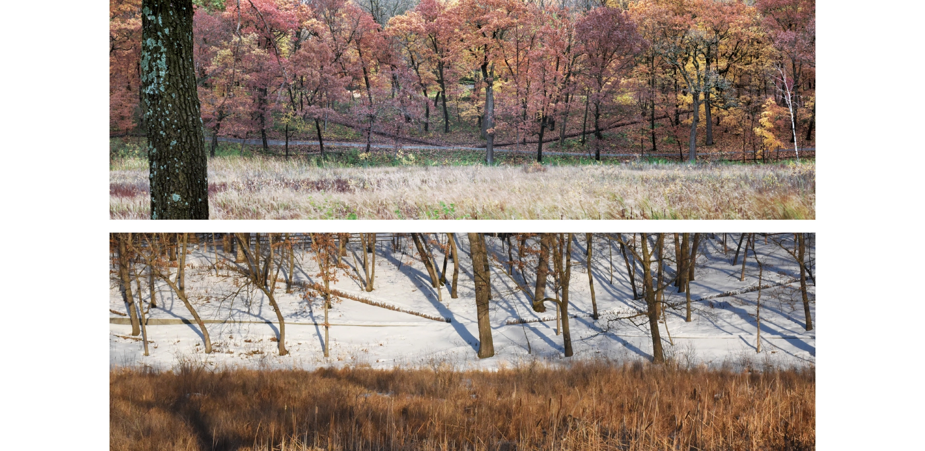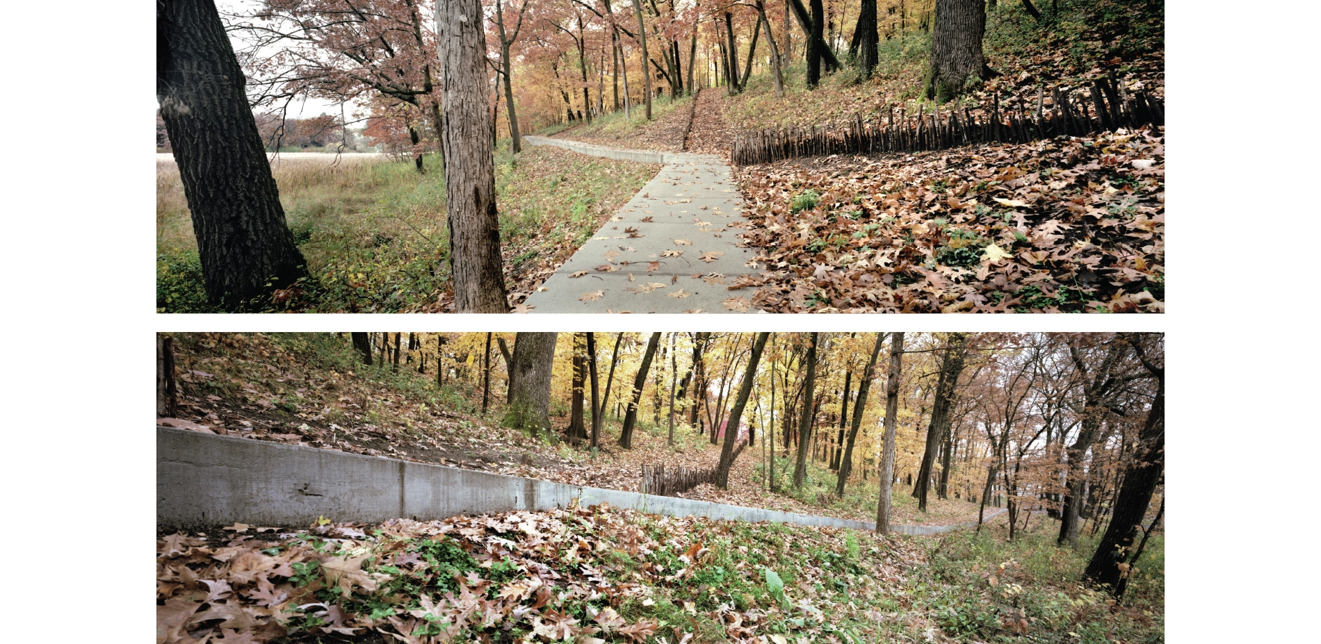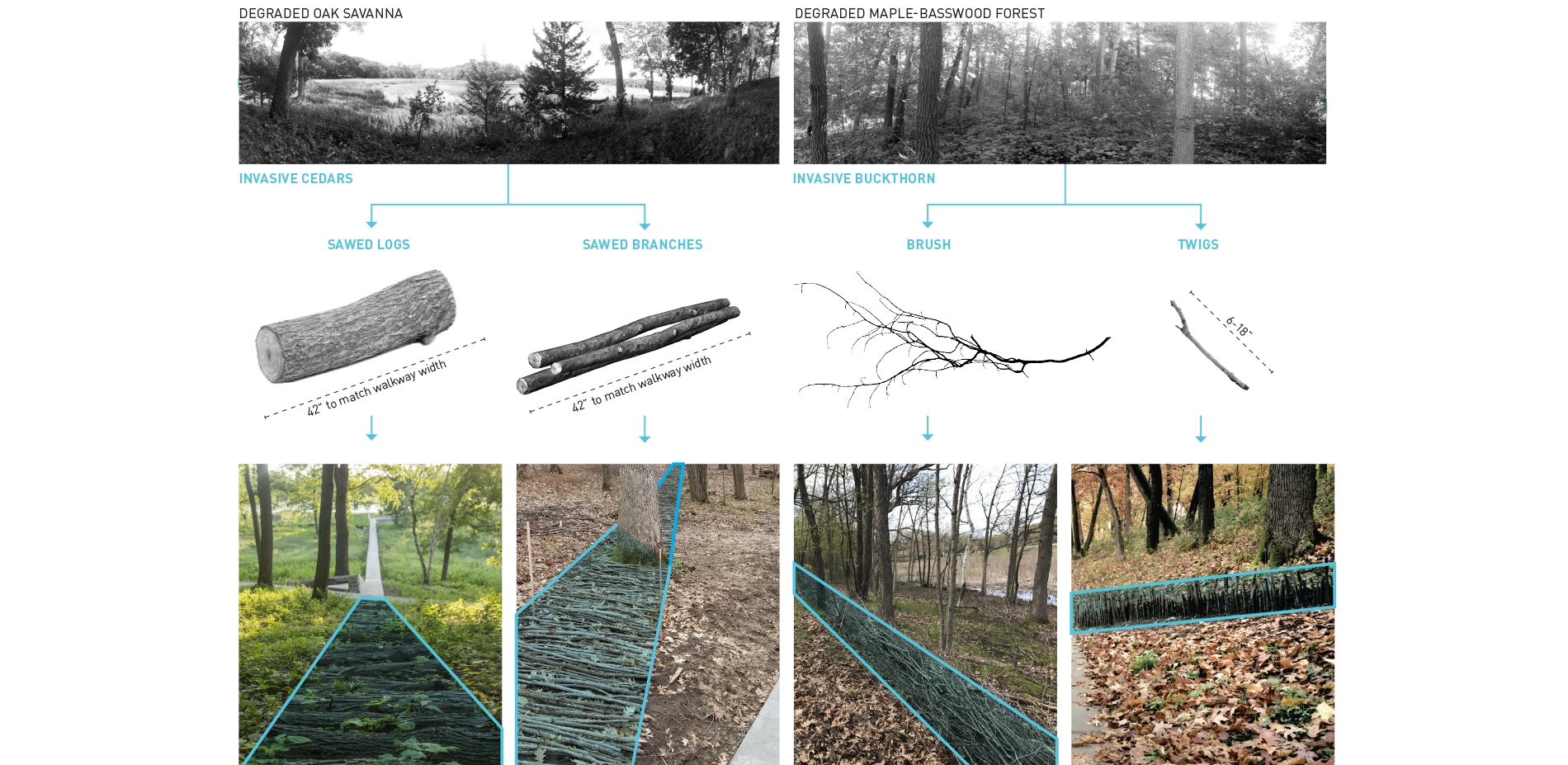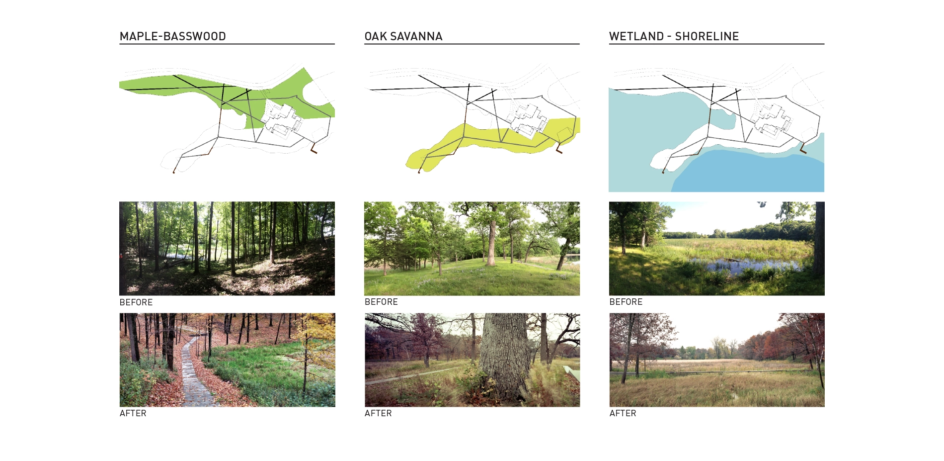 Context The Lake Marion estate covers twenty-two acres of oak savannas, woodlands, wetlands, and lakeshore. From the project’s inception, the clients were deeply committed to restoring the landscape to its native splendor, requesting that the entire area be accessible while simultaneously minimizing ecological impacts. The home itself sits within a small pocket of developed land, which allowed the landscape architect to focus on thoughtful restoration plans and careful circulation throughout the broader landscape, in a manner that emphasized minimal impact of the work and design. The areas immediately surrounding the house are designed to maximize views to the restored landscape and echo the distant pathways with complementary programming including pool terraces and sunken gardens. Design Goals and Challenges The design concept began with a modest idea: to create a network of linked paths with straight lines that extend from the house with minimal interruption. The goal was a circulation network that would provide accessibility to, and enjoyment of, the restored ecological diversity around Lake Marion. Simplicity of material and form accentuate the dynamism of the surrounding landscapes while ephemeral artworks amplify the circulation network at key ecological transitions and gathering nodes. Because the restoration and circulation networks were of primary importance to the client, the immediate environs of the house were designed to complement and amplify the surrounding environment and expansive circulation network. To provide a robust framework of constraints and assets for the circulation network and art installations, it was essential to conduct accurate mapping and numerous field assessments of individual elements and ecological conditions. Site investigations involved a deep understanding of the native biomes and micro-ecologies of the site, as well as lengthy and numerous site visits throughout the entire process to document conditions and adjust the design to respond to miniscule but important characteristics. This included a comprehensive and detailed analysis of existing conditions, historic research, and a spectrum of desired restoration outcomes. Three Ecosystems – Three Strategies In order to restore and improve the diversity of three distinct biomes, numerous management and design strategies were explored and implemented in collaboration with Wetland Habitat Restorations over a three-year period. To enhance the oak canopy and improve views to the surrounding wetlands and lake, cedars and lesser quality trees were removed from the oak savanna that covers most of the peninsula. Within the same biome, a custom shortgrass prairie seed mix was designed to restore the short, compact and showy understory and forbs. In the upland maple-basswood forest adjacent to this, buckthorn and honeysuckle shrubs were removed, and shade-loving groundcovers of native sedges, wild ginger, and fern species were planted. To restore uniform textures of the shoreline and allow the native wetland to shine, hybrid cattails, reed canary grass, and other invasive species were removed along the water. Movement and Convergence A mile-long system of interconnected trails and boardwalks provides accessible circulation through 22 acres of restored landscape. The paths glide over wetlands, traverse the oak savanna, and weave through the maple-basswood forest, and provide access to the lake. The paths are laid out in straight lines that avoid mature trees, carefully designed to minimize ecological disturbance and maximize user experience. Additionally, this linearity exaggerates topographical changes characteristic of the glaciated lake region. Pathway intersections are placed in transitional ecological zones – their role in mediating the geometry of the straight lines is a central component of the project’s success. These areas of convergence are spaces for gathering and contemplation, where the path warps into walls, recessed seating, and benches. Each space capitalizes on the characteristic assets of its particular ecology: a Zen raking meditation garden, a floating hammock garden, a recessed fire pit, a sculptural mound, and open areas for recreation. The minimal material palette of the circulation network emphasizes the dynamism of the surrounding landscape. Paths placed on solid ground are cast-in-place concrete using locally-sourced granite aggregate. Gathering nodes are a mix of cast-in-place concrete and crushed granite aggregate and extensive custom formwork was necessary to manage topographic changes and design requirements. When crossing a body of water, the walkway transitions to a simple wooden boardwalk of reclaimed ash. These boardwalks are devoid of vertical articulation – simple horizontal lines that float over the water below. All pathways are a uniform 42” – narrow enough to accentuate the intimate and contemplative nature of the experience. The landscape architect worked closely with the city to mitigate the impact of the path in and along the wetland edge while improving the performance of an additional 200,000 square feet of the site immediately adjacent to the path and wetland buffer. Restoration and Art To acknowledge the material-impact of ecological restoration and the human impact on the land, the landscape architect designed art installations that utilize material harvested from the removed invasive species, primarily buckthorn and cedar. Working with Wetland Habitat Restorations they hand-picked various materials, including 42” long sticks, logs, and thinner branches of varying length, and arranged them throughout the site. The art installations respond to their context to enhance the experiential nature of the pathways. In some places they guide a walker’s view through the forest toward infinity in others they skew across the path, drawing one’s eye across a wide spectrum of biomes and restored ecologies. Each installation highlights and responds differently 