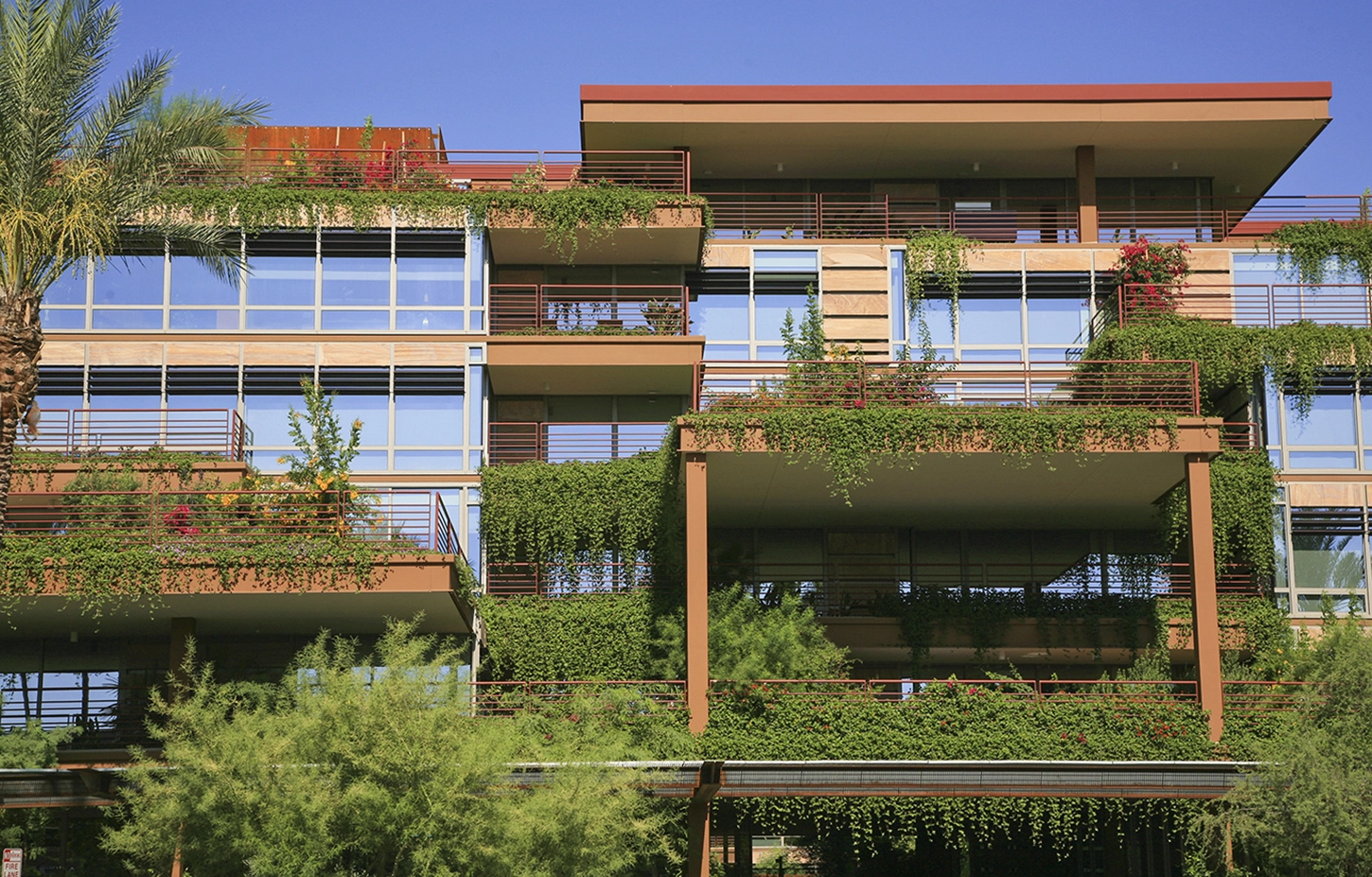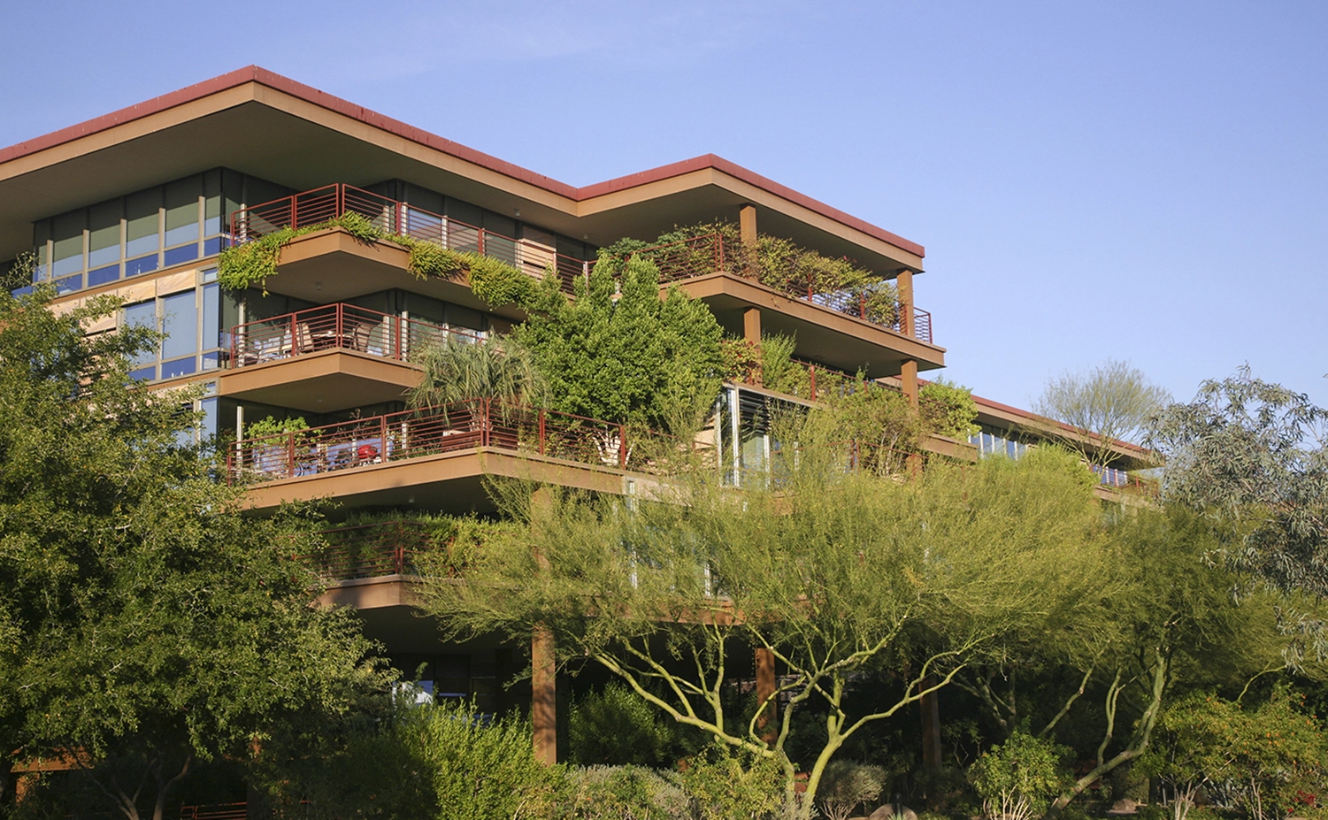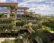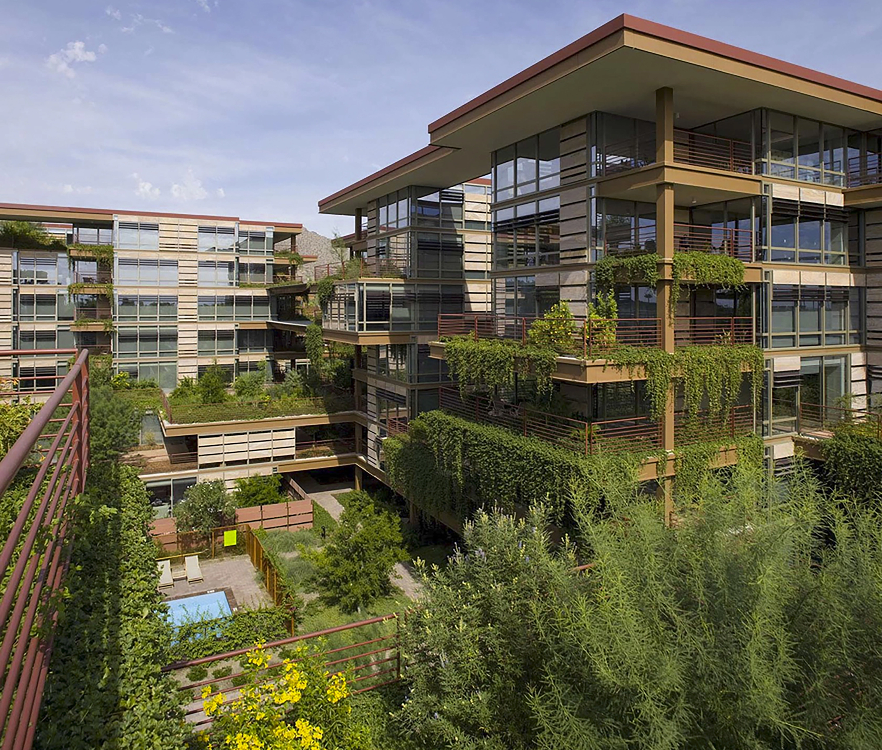 As hard as it may be to imagine green roofs in the arid Arizona climate, this project deploys a blanket of them across half a million square feet, with each of 700 units on the site receiving its own private green terrace. Lower-level clusters of native trees give way to a shallow green roof system filled with low-water, drought-tolerant plants; ground level water features contribute to an oasis-like feel while providing evaporative cooling. The thorough research behind this system and thoughtful integration within the architecture allow it to stand as a future case study for sustainable, multi-level planting within arid environments
