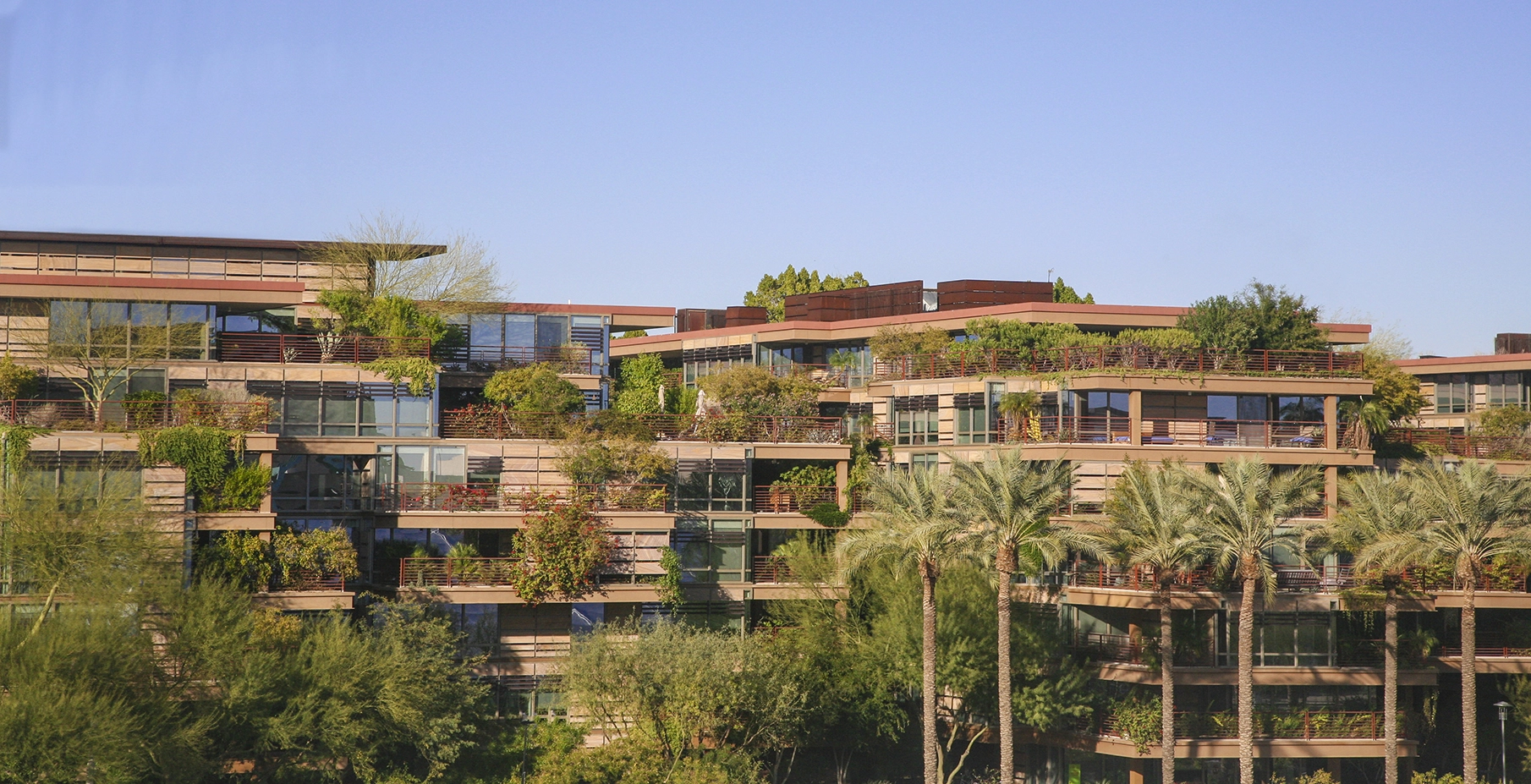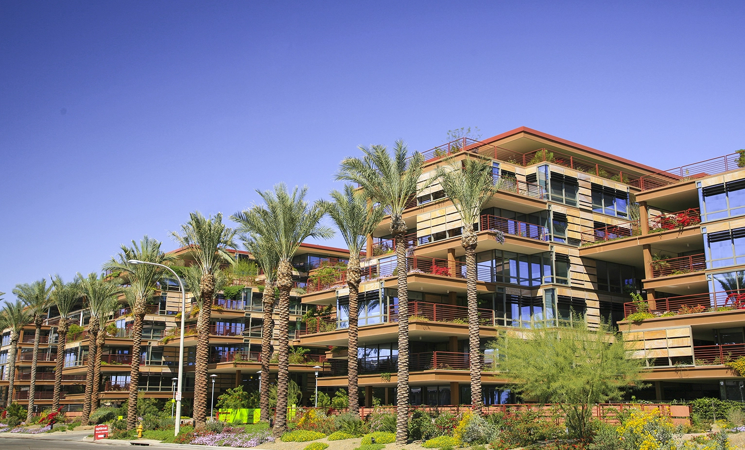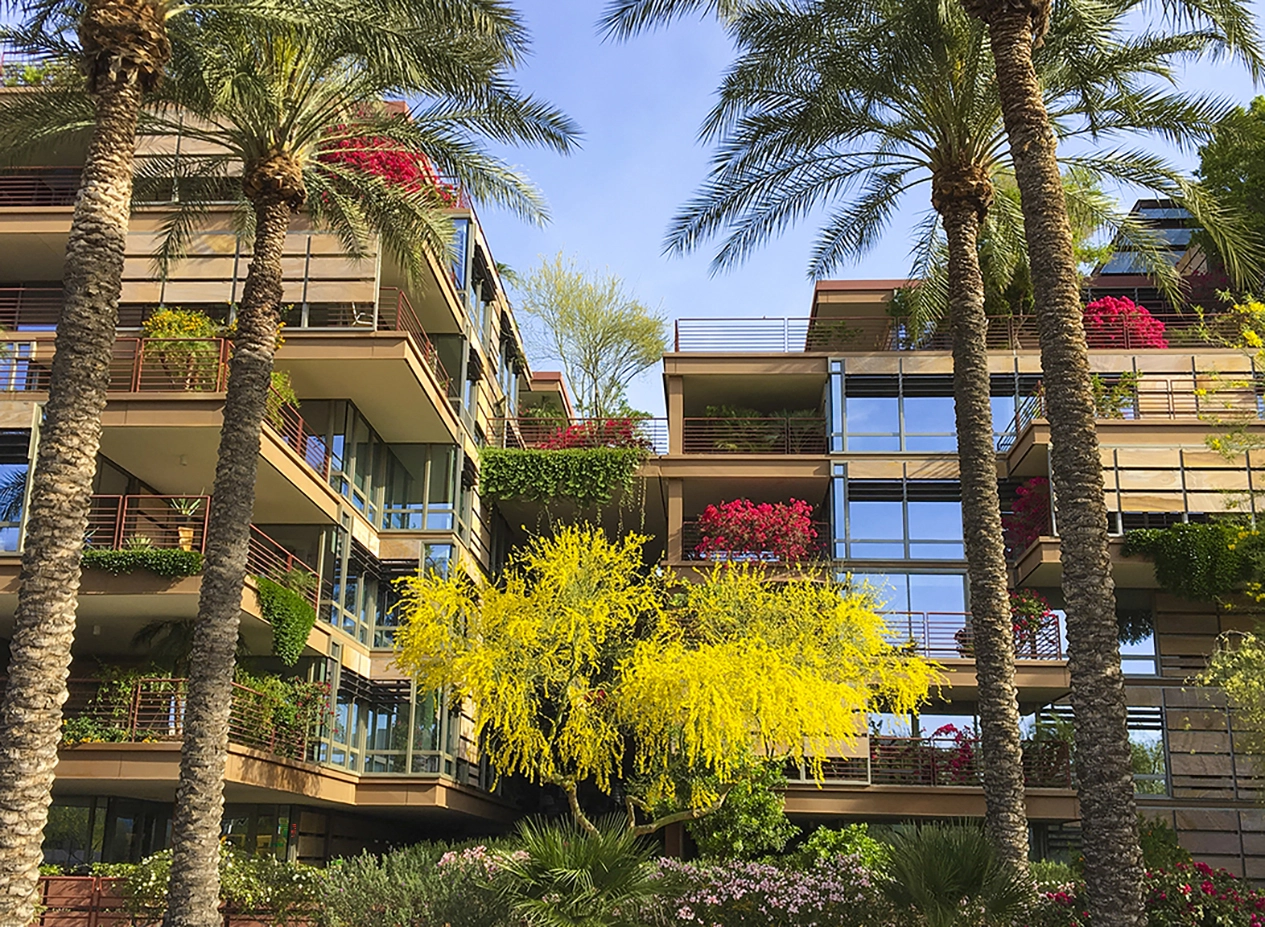 Vertical Oasis: Verdant Sustainability in an Arid Climate Optima Camelview is a shining example of design best practices. The landscape architects combined research, aesthetics, functionality and sustainability to create a stunning landscape in the heart of downtown Scottsdale, Arizona. In a city known for its natural beauty and commitment to environmental awareness, this project fits right in and immediately stands out. Landscape Concept Optima Camelview boasts 17 acres of landscaped terraces, exceeding the total 13-acre site area. The overall landscape concept is inspired by the natural ecology of the surrounding region. Rooftops are planted with the type of arid plants found on the surrounding mountains such as palo verde and cacti. The environment transitions into lusher plantings at the lower levels with ‘bosques’ of native mesquite and ironwood trees. The canyon-like feeling is reinforced by the linear form of the recessed central courtyard and includes pools & reflecting ponds reminiscent of a riparian oasis with the added benefit of providing natural cooling effects. Integrated Urban Context This highly technical over-structure community consists of eleven interconnected residential garden towers, which incorporate more than 500,000 square feet of green roof across all levels of the complex providing a welcome respite in the local environment. Surface parking was eliminated to provide more landscaped open space and promote stronger neighborhood connections. This is an innovative move in an urban environment where parking lots claim large of amounts of square footage. A series of public courtyards link the project together to create a park-like environment. The central promenade of the complex forms the northern terminus of Scottsdale’s Art District and dramatic pieces of sculptural art are integrated throughout the public realm which encompasses the entire street level and central sunken courtyard. Highly Sustainable Optima has received numerous sustainability awards including LEED Gold Certification. The environmental and sustainability benefits of green roofs are well documented, particularly in a dense urban setting – • provides evaporative cooling • re-oxygenates the air • reduces airborne particulate matter • dramatically reduces stormwater runoff • mitigates the heat island effect • reduces urban noise • creates habitat for wildlife • provides a 20% reduction in overall energy costs • increases the life cycle of the overall roofing system, • lowers long-term operating and maintenance costs • reduces infrastructure requirements Additionally, every unit has its own private green roof terrace providing physical and psychological benefits to residents. Challenges Optima was the first project of this scale to utilize an ‘extensive’ or shallow green roof system in a truly arid environment. The available 5” soil profile presented a number of serious technical and logistical challenges for the design team. While this approach has been successfully employed in cooler climates, there were no comparable precedents in the desert southwest where it’s typical to have at least 24” of soil depth in order to maintain adequate soil moisture and temperature for plants to survive harsh conditions. Groundbreaking Research To address these concerns, the landscape architect organized a collaborative research team including graduate students from Arizona State University’s School of Sustainability along with regional horticulturists to develop prototype test beds to determine a best system approach to ensure successful design. A series of elevated test beds were established to systematically test the viability of each component of the green roof system including – • various plant types (native, desert adapted, ornamental, attractors, succulents) • soil type (organic, sandy, silt) • topdressings (desert pavement, decomposed granite, organic mulch) • irrigation systems (drip, spray, subterranean) as well as irrigation protocols (frequency, duration, time of day) Test beds were elevated and glass panels were placed to replicate the proposed rooftop conditions. Structures were mocked up to replicate shade conditions for the north, east and lower interior exposures. Soil probes and monitors recorded the environmental variables for each combination of the system components, including water application and drainage, soil moisture and temperature and ambient conditions. Plant growth and health was closely monitored over an 18-month period. The results of this research were used to determine the right balance between form and function in the final design as well as the ongoing operations and maintenance of the project. This approach was groundbreaking for this application in an arid environment and led to a highly water efficient, low maintenance and aesthetically beautiful design. The remarkable success of Optima Camelview has provided a beautiful proof of concept case study for the integration of green roof technologies into an arid urban environment. The project has been widely published and the research and technologies developed by the design team continue to inform similar projects throughout the world.