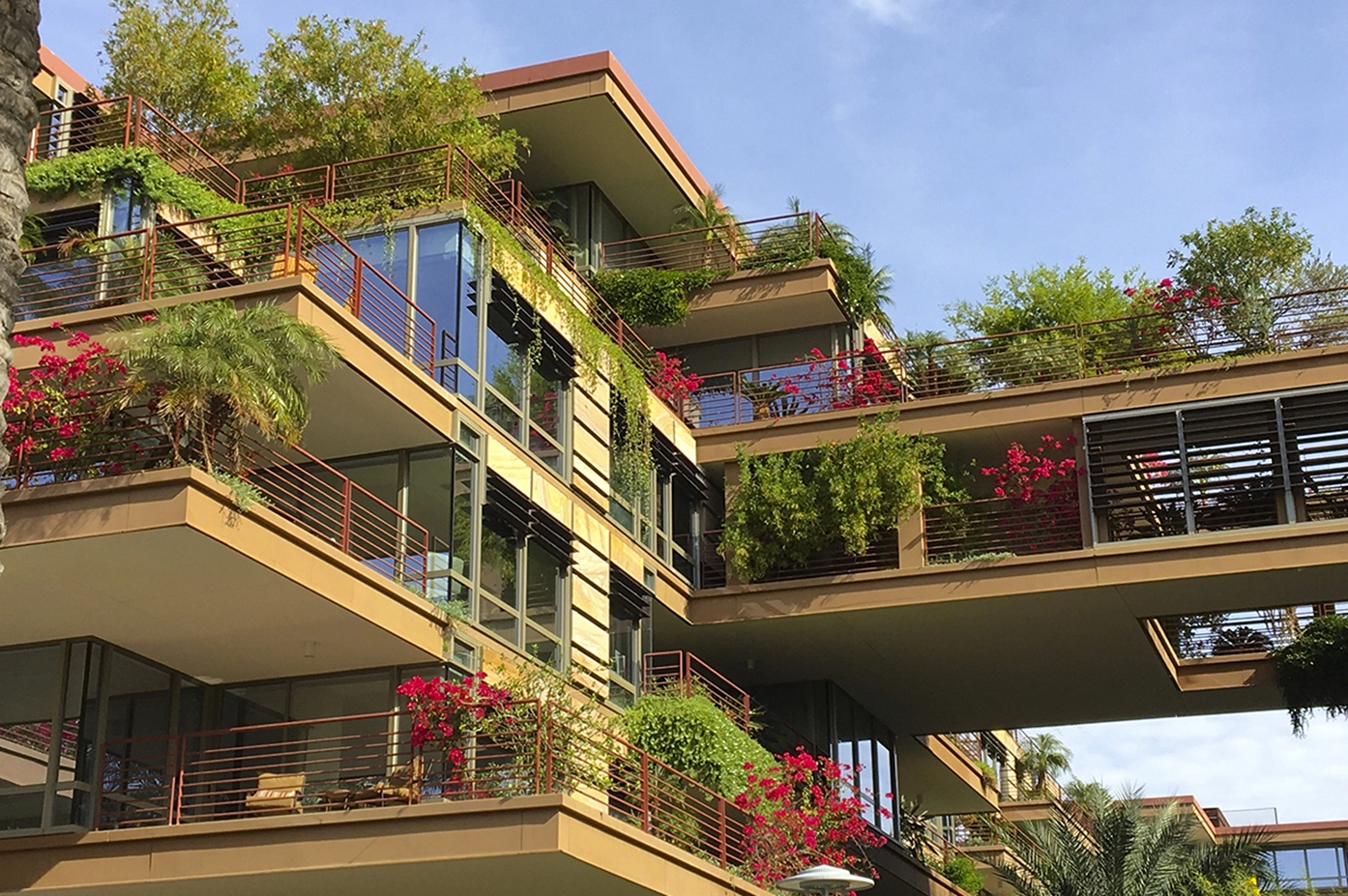 Vertical Oasis: Verdant Sustainability in an Arid Climate Optima Camelview is a beautiful case study example of best design practices, where groundbreaking research, integrated design and collective vision came together to create a truly sustainable and immersive landscape experience. The 700 unit condominium complex, located in downtown Scottsdale, AZ, has over 500,000 SF of green roofs enveloping every layer of the seven-story building. The effect is stunning. Every unit has its own private, desert adapted, garden terrace. The street level public space creates a unique sense of transparency and integration with the surrounding urban environment. Optima was the first project of its kind to utilize an “extensive” or shallow green roof system in an arid environment. This presented a number of technical and logistical challenges, which the landscape architects addressed through collaborative research and innovative design. The overwhelming success of the project has provided a strong proof of concept and the project has received numerous sustainability awards including LEED Gold Certification.