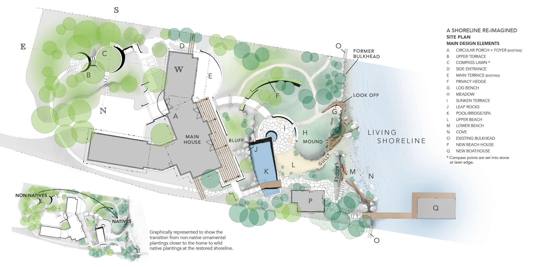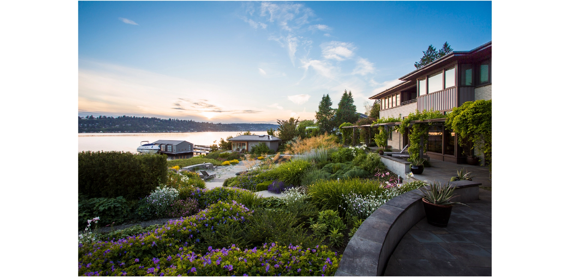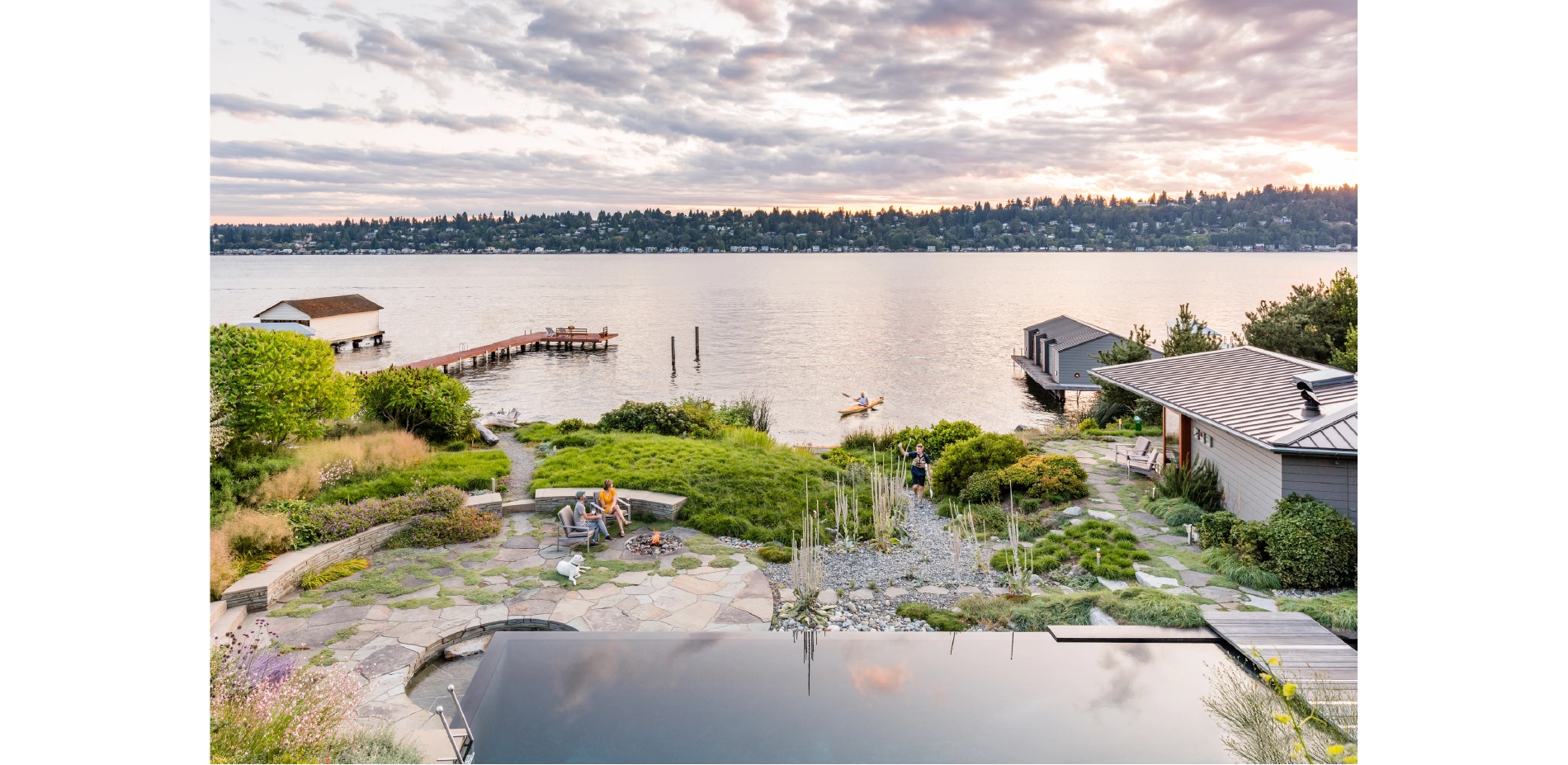 A SHORELINE RE-IMAGINED The south-west facing property occupies one acre on the suburban shores of Seattle's Lake Washington. Eighty percent of this lake is ringed by some form of built barrier, frequently backed by intensively managed lawns - both of which threaten the lake's ecology and riparian habitat. With 150 feet of shoreline, the property's potential benefit to local wildlife was choked off by a large concrete bulkhead, installed in the 60's in a misguided attempt to ameliorate boat-wave impact on the lakeshore. Fostering a greater connection between people and nature at the land-water interface became the project’s main mission. The clients were discerning partners looking to redefine the residential experience. The expectations and demands placed on urban/suburban home landscapes are typically limited to recreational uses and set notions of visual attractiveness. Challenging that, A Shoreline Re-Imagined sought out a broader definition of "garden": one that links it to the larger landscape, restoring its indigenous flora, increasing its attractiveness to the region's fauna, and encouraging engagement with native plants and wildlife. Traditional recreation needs were still catered to, but many new ones were created; the pleasurable experience of being a part of nature being one of them. Inspiration for the design came from three sources: the client's frequent sojourns to Seattle's Olympic Sculpture Park, which features a reclaimed beach; a kayak trip with the clients to explore the wildflower-rich Nature Conservancy preserve of Yellow Island; and a combined wish to create a hopeful, inclusive habitat for all. MAKING THE GRADE The challenge of tethering a suburban landscape to its native, natural elements - while still facilitating a multiplicity of recreation uses - was considerable. It was met two ways: through design focused on creating specific new experiences and a corresponding follow-through with extensive re-grading. With no available land access, heavy equipment was brought in by barge and used to dismantle the bulkhead. Lawn was removed and 160 cubic yards of soil was redistributed, creating a diverse topography. The energy of the land is now changed. No longer limited to a single-shot view of lawn/bulkhead/water, the house now overlooks a dynamic scene with an interlinked foreground, middle-ground and background. No longer severed by a bulkhead, the main terrace and new living shoreline are seamlessly connected. Indeed, the new beach now extends some 70 feet inland to terminate at the Pool. The undulating landform features a broad mound (the meadow) that affords privacy to the Sunken Terrace. This highpoint, when coupled with the gully, builds an element of surprise for kayakers walking up from the beach to explore the landscape. The new Beach House, perched above this deep gully, has gained a sense of vantage. Re-contouring the site has given the eye multiple opportunities to pause and engage. The garden has acquired the complex character of a natural landform and, with re-wilding, is increasingly perceived and used as habitat. This has added significantly to the client's enjoyment and sense of place. WILD TRANSITIONS Together with land-forming, planting design has played an important role in creating cohesion within the space. Informed plant selection has not only deepened the landscape's narrative but also ensured that its story is experienced year-round. To extend visual interest throughout the seasons, succession planting was employed, using both native and non-native plants. Ornamental plantings closer to the residence now transition into increasingly deep drifts of wild, native vegetation as one approaches the living shoreline. Natives respond to the mild winters and wet springs of the Pacific Northwest and were selected for their early-blooming characteristics. Extensive colonies of native camassia and other spring bulbs such as shooting star and dog's-tooth violet (all denizens of Yellow Island), are now established. The natives leaf out early to supply food for reproducing insects and wildlife. In very early spring, flowering currant provides a lifeline for overwintering hummingbirds. By early summer, with broods hatched and insect life-cycles complete, many natives go dormant. This is when the non-natives in the succession planting take over. Ornamentals such as cardinal flower, Afghan sage and Japanese anemone - chosen for their later-bloom cycles, durability, and aesthetic appeal - reach their floral peak just in time for summer, when people use the space most intensively. Allowed to fully express itself, plant life was used to frame and shape human experiences, with native biota uniquely anchoring the land to the region. A LANDSCAPE AT PLAY With landform and plant-life determined, circulation and built elements complete the composition. New modernist built elements such as the Pool, Beach House, and Boat House were linked via a playful circulation system. Meticulous care was given to the nature and location of spaces to best anticipate and accommodate the uses and movements of humans (social choreography) and other animals. Beginning at the property's entrance, the eye is drawn to compass points embedded in stone that encircle the lawn. The circular form is repeated lakeside via sweeping curves leading to the Sunken Terrace - dramatically pierced by the acute angle of the Pool. The Pool, Beach House and pathways come together to make the Sunken Terrace the key social space of the design and a lively counterbalance to the formal dining of the main terrace. Set at the intersection of ornamental and wild, the Pool is intended as an interactive art piece. Its dark coloring obscures the confines of the water volume and allows for a meditation on reflected sky and clouds. It's also immensely popular with kids. One of the client's favorite experiences often comes at the end of a social evening, with a walk down to the water's natural edge. Adirondack chairs on
