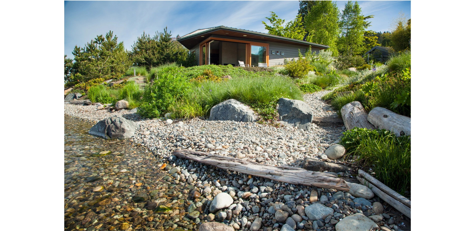 Along the edge of Seattle’s Lake Washington, where once a nondescript concrete bulkhead met the water, a carefully crafted pebble beach now generates biodiversity within a living shoreline. A wholesale rethinking of an unceremonious lawn begat a topographic upheaval, allowing undulating meadows of native plants to form foreground, middle, and background within the landscape, with breaks for a pool and a beach house. The re-planting of native species within a previously managed terrain—and the elimination of the run-off chemicals that kept it green—have contributed to an overall re-wilding that welcomes insects and wildlife, and has cemented this project as a pilot study for the EPA’s Green Shores for Homes initiative.